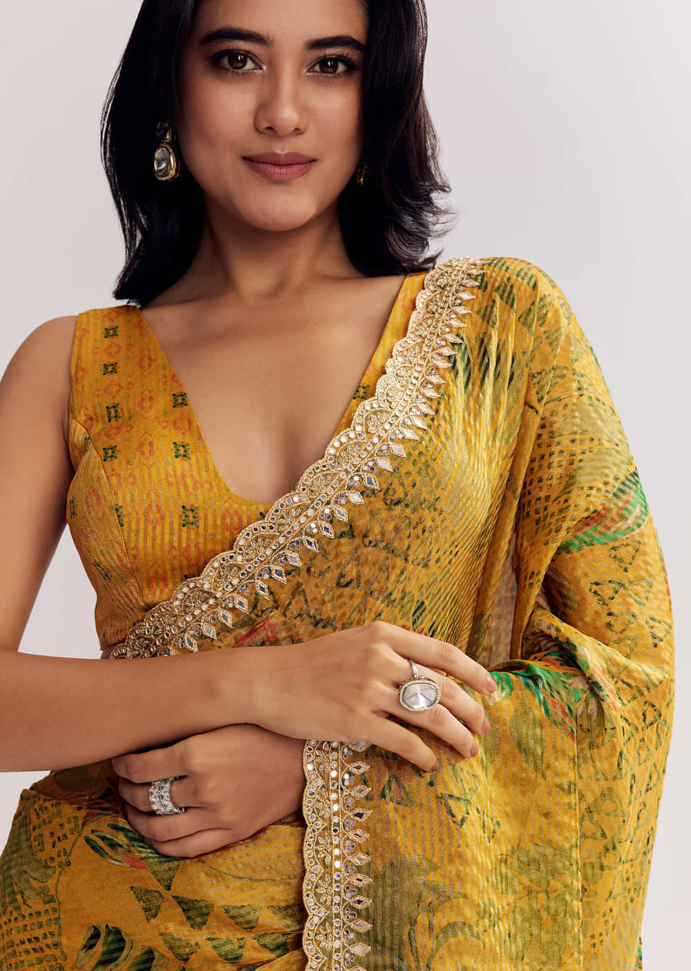 Yellow Printed Tissue Lurex Saree With Zari Mirror And Cutdana Embroidery