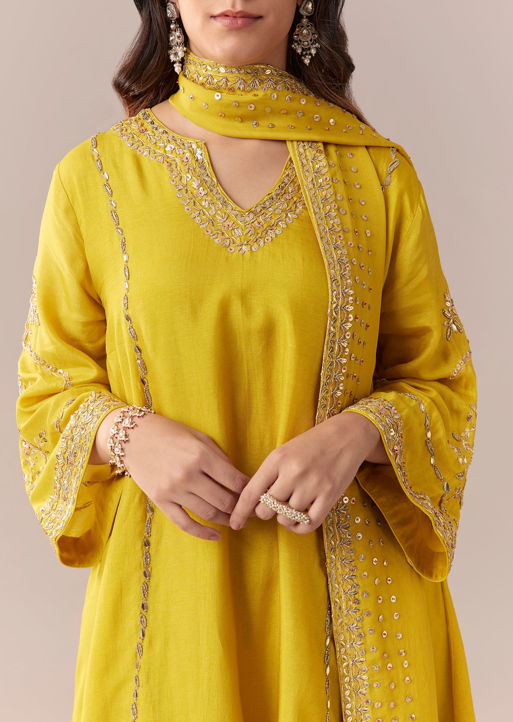 Crafted in viscose, this A-line kurta features sequin and bead detailing with a notched neckline and flared sleeves. Paired with a mid-waist salwar and matching dupatta, it’s ideal for festive,... More Product Details