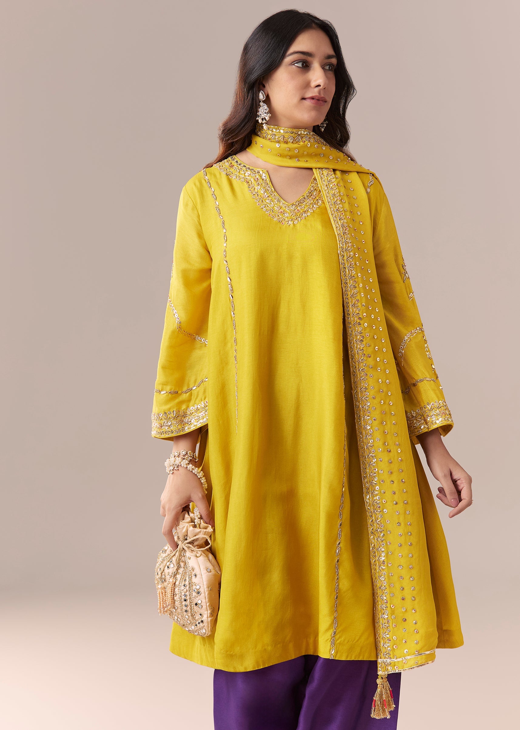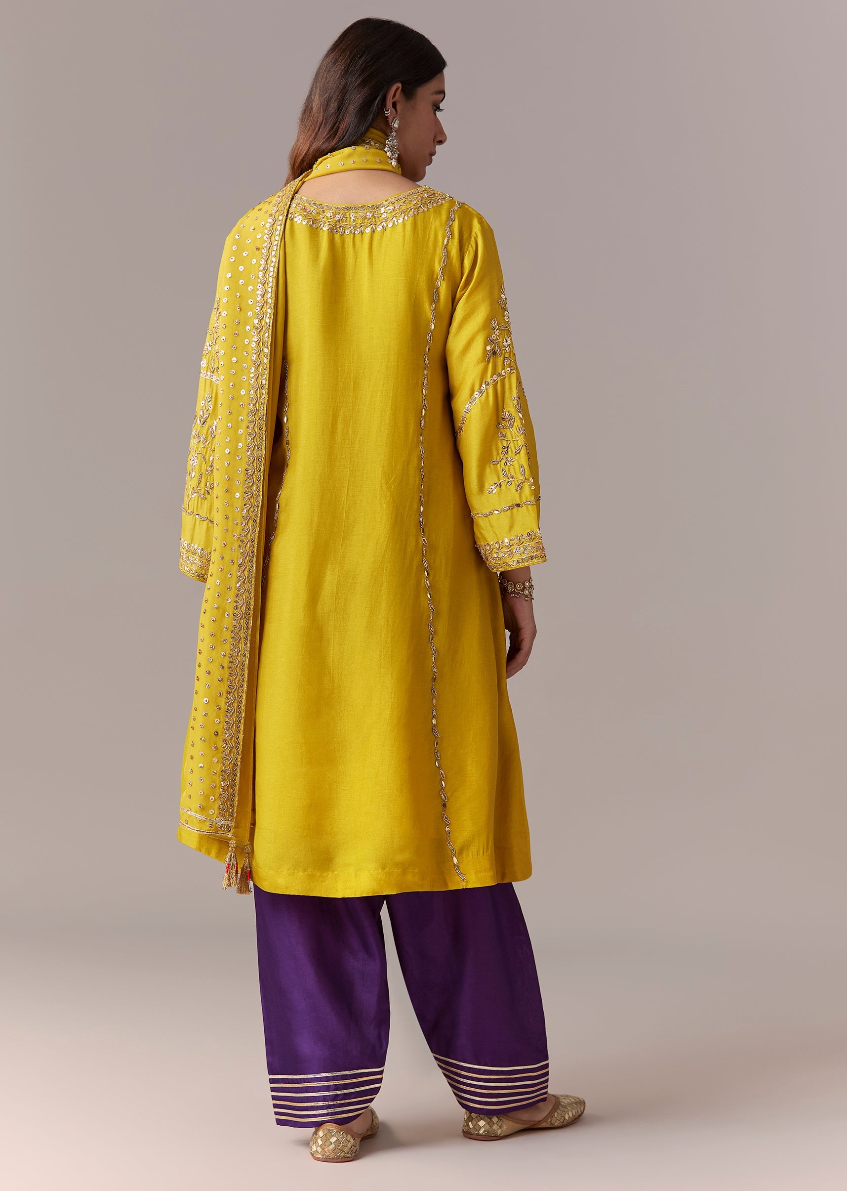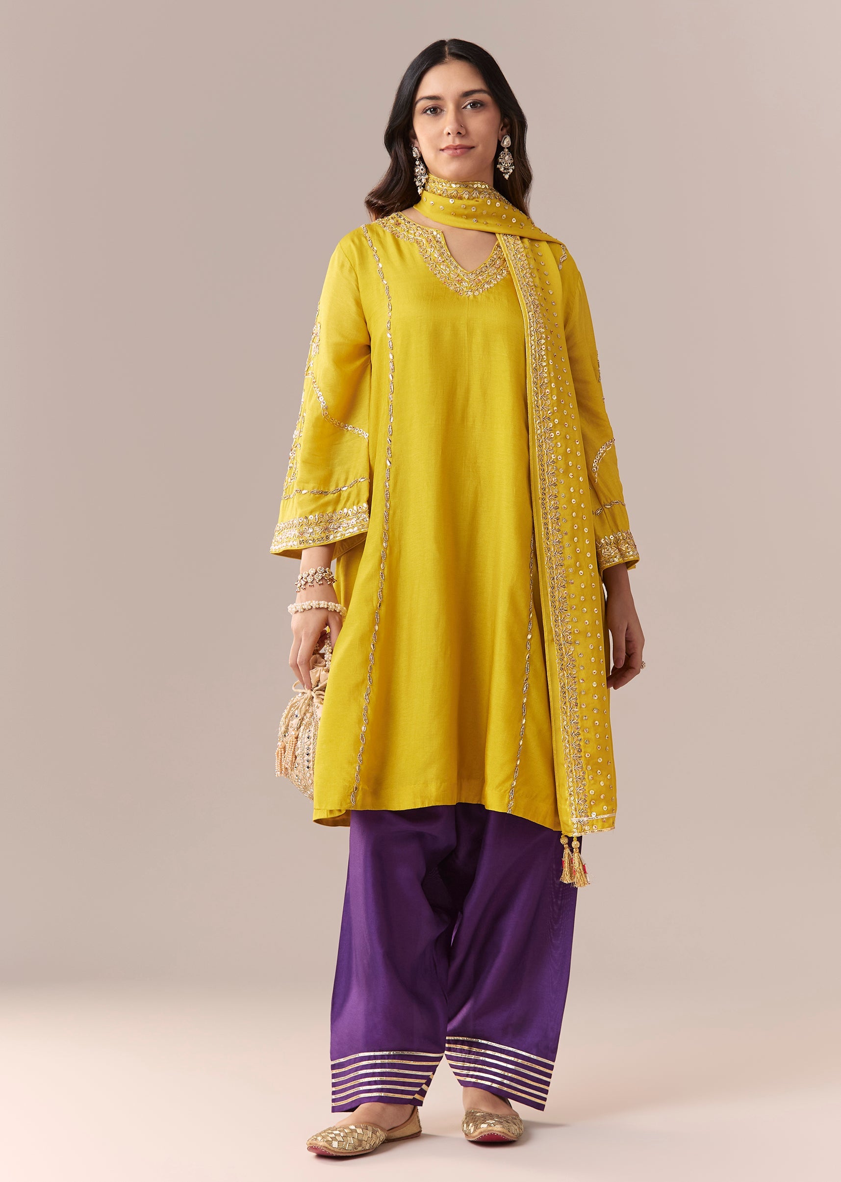 Yellow Purple Embellished Kurta Set With Salwar And Dupatta