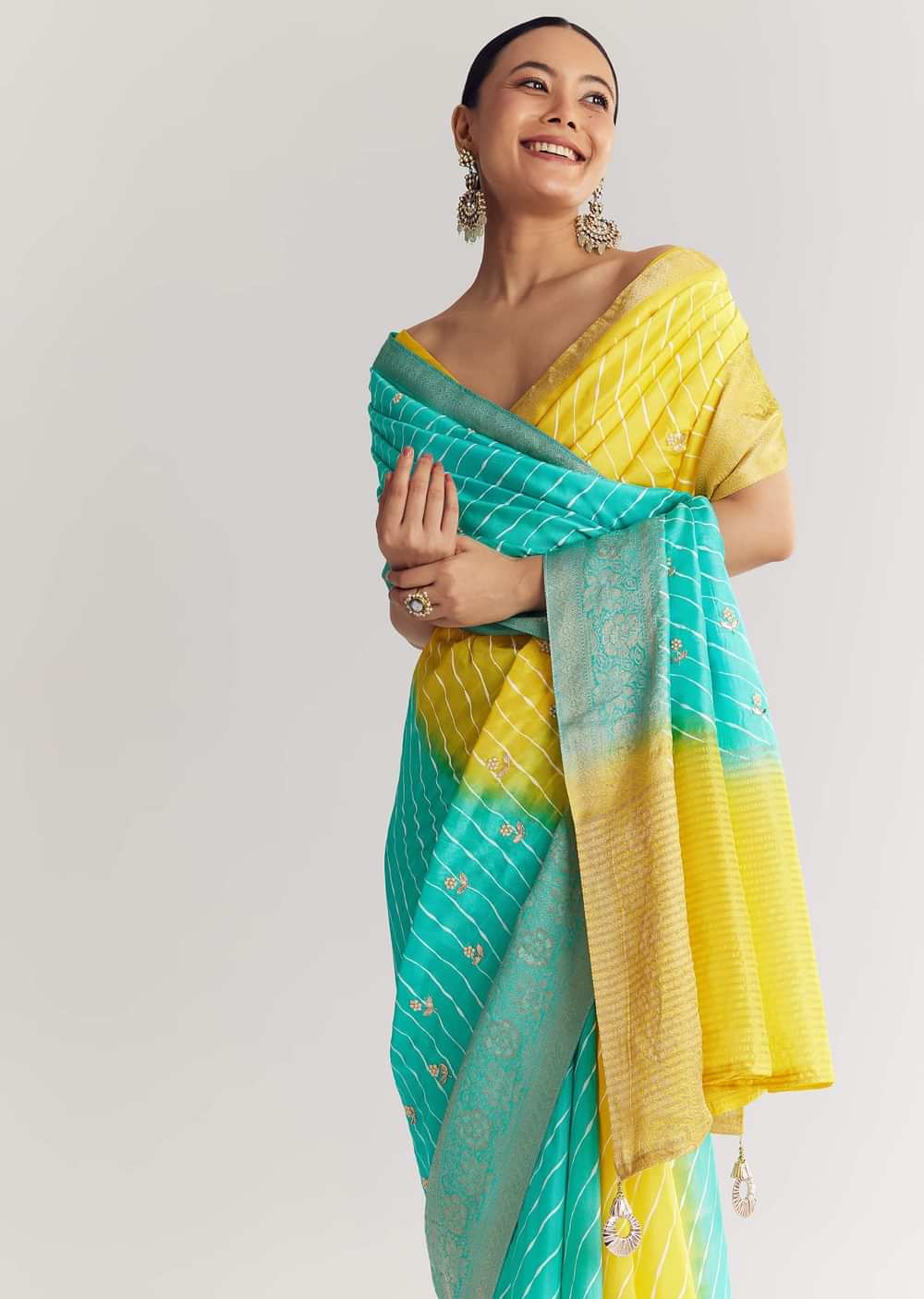 Yellow Rama Saree With Leheriya Print And Floral Gotapatti Embroidery
