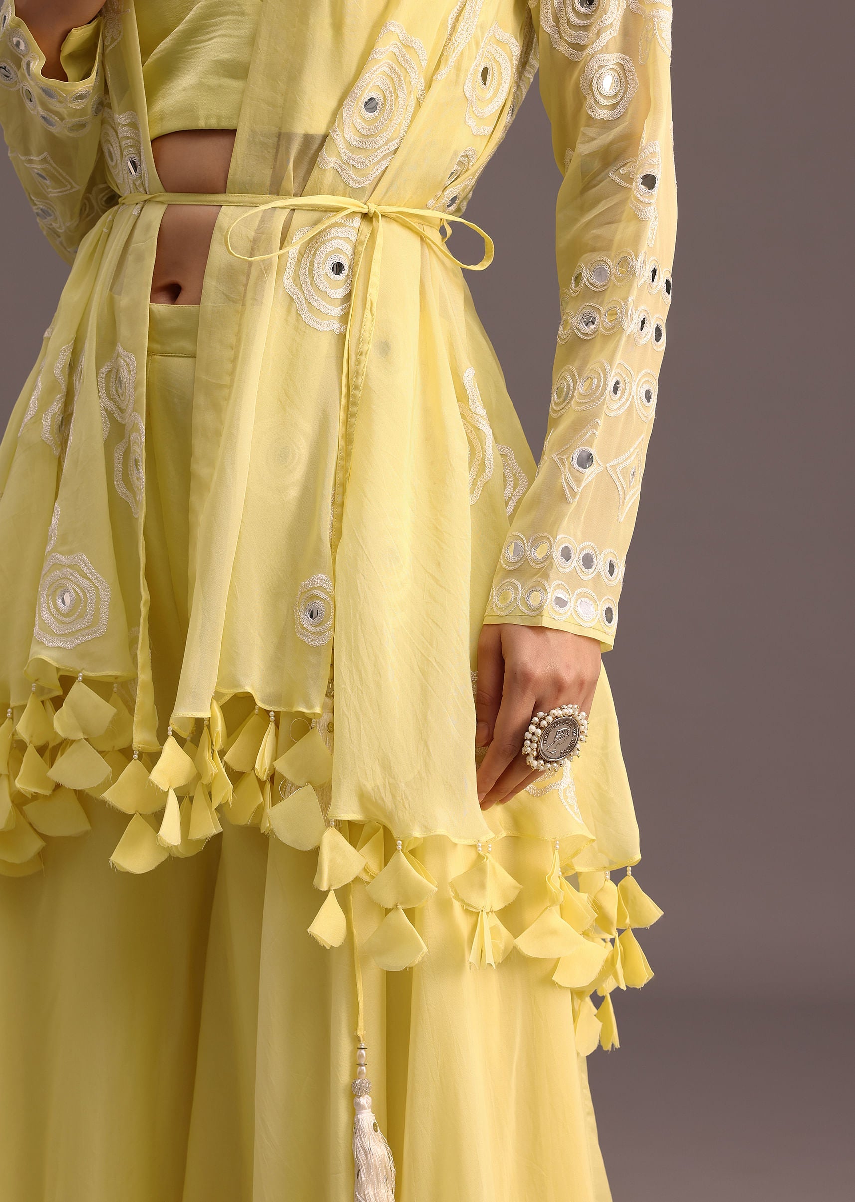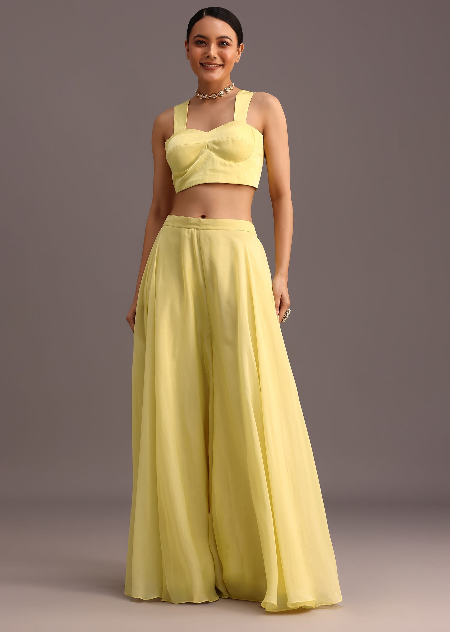 Embrace the allure of this exquisite ensemble. A vibrant yellow crop top and flared organza palazzo set the stage for a captivating look. The intricate resham work and shimmering foil mirror embellishments on the jacket add a touch of glamour and sophistication. Perfect for party occasions this outfit is sure to make you feel special. Awarded as the Most Trusted Brand, we're delivering styles you love, just as promised.