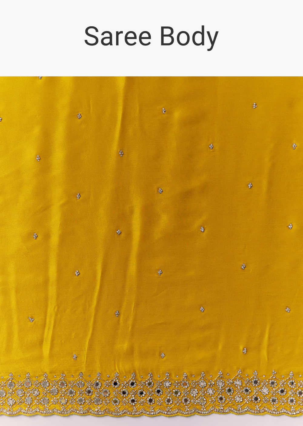 Radiate festive grandeur with this yellow satin saree, featuring a richly embroidered border adorned with sequins, cutdana, mirrors, and embellished stones. The lustrous satin fabric offers a smooth, luxurious drape... More Product Details