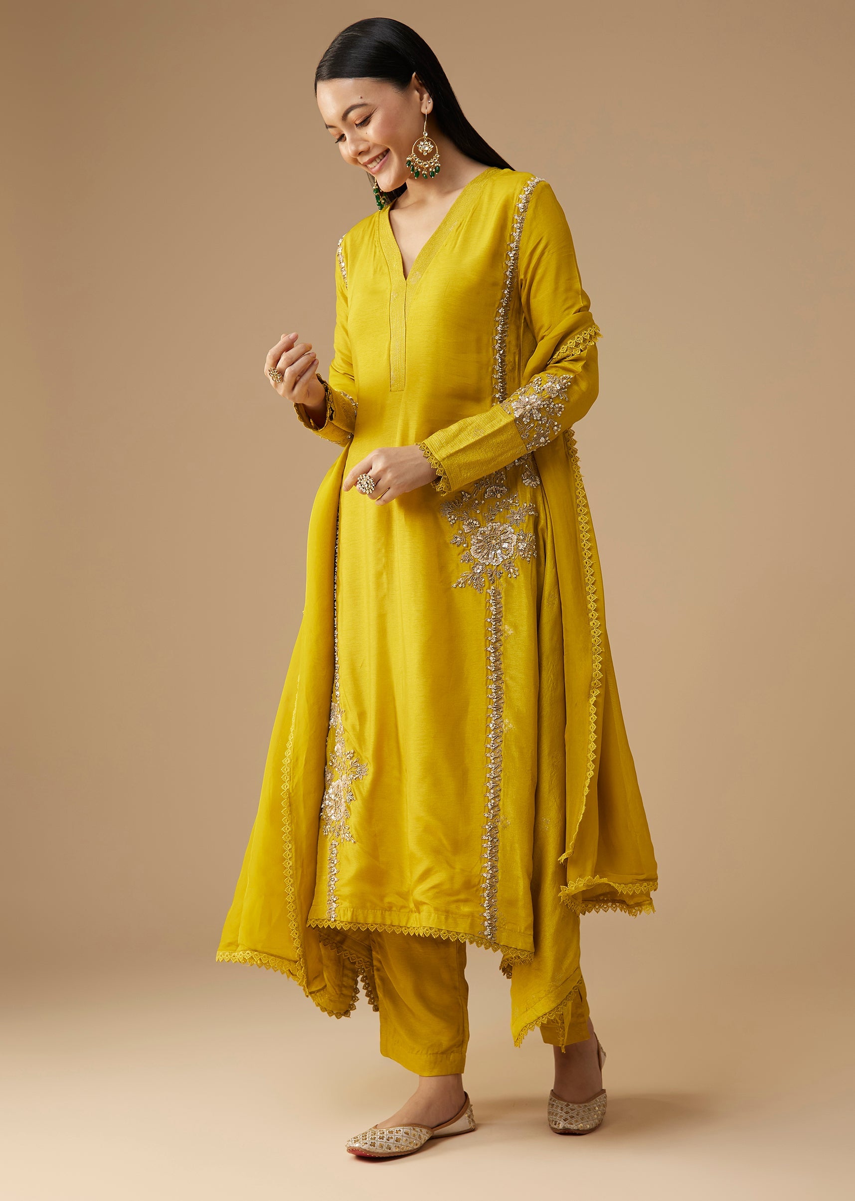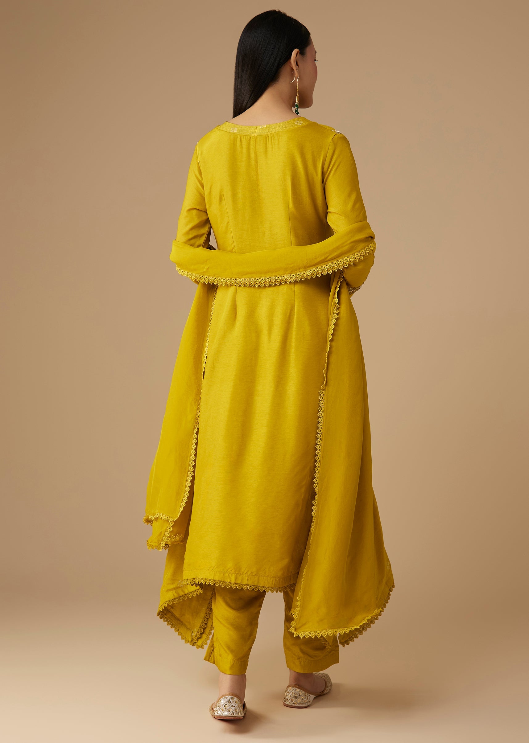 Bring festive radiance to your wardrobe with this yellow silk anarkali set, highlighted by intricate zardosi and sequin work that adds a rich, luminous sparkle. The flowing anarkali pairs beautifully... More Product Details