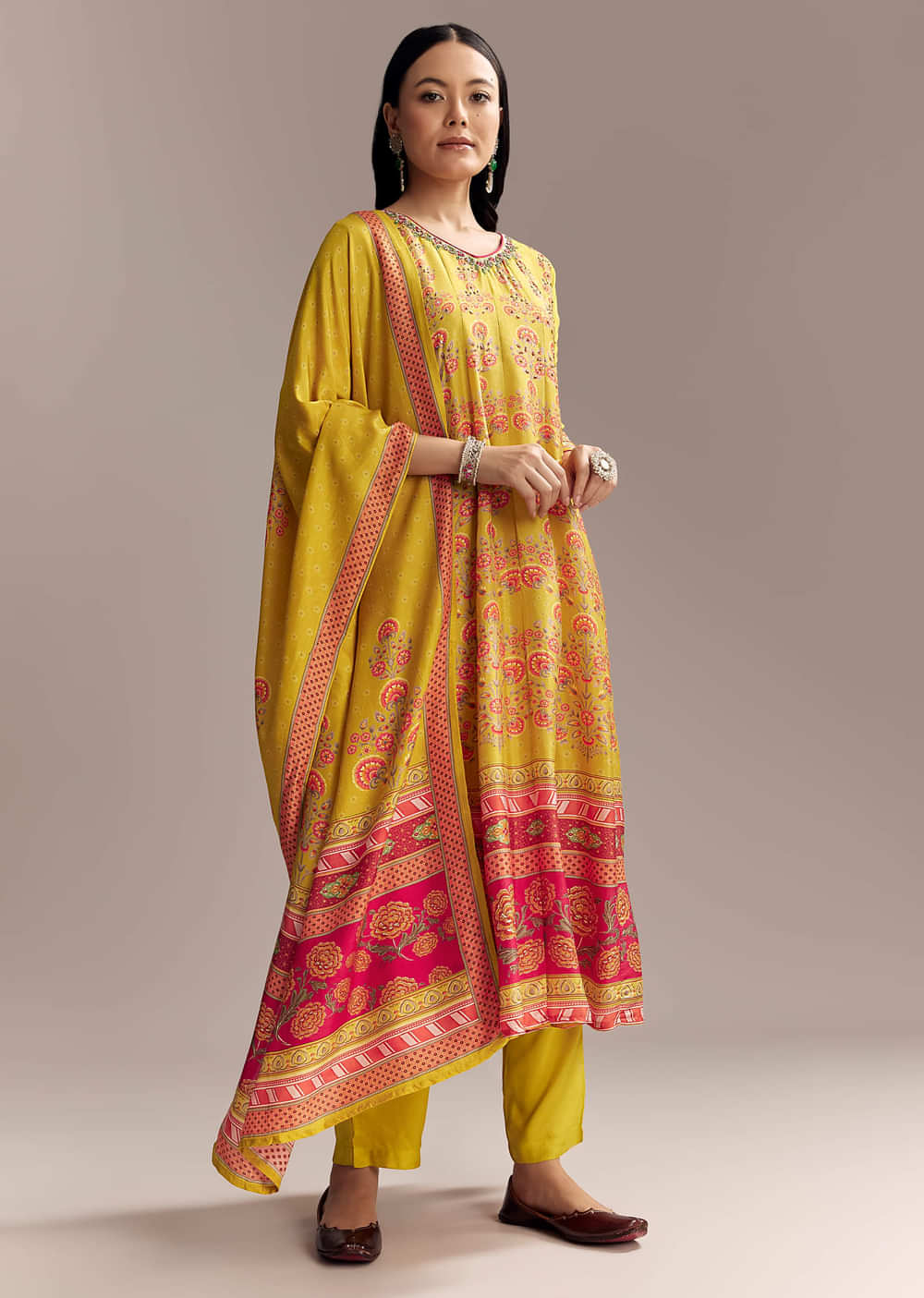 Cheerful and relaxed, this yellow silk anarkali suit brings weekend ease and sunny charm. A multicolour print plays across the flare and borders for a lively look. Perfect for casual... More Product Details