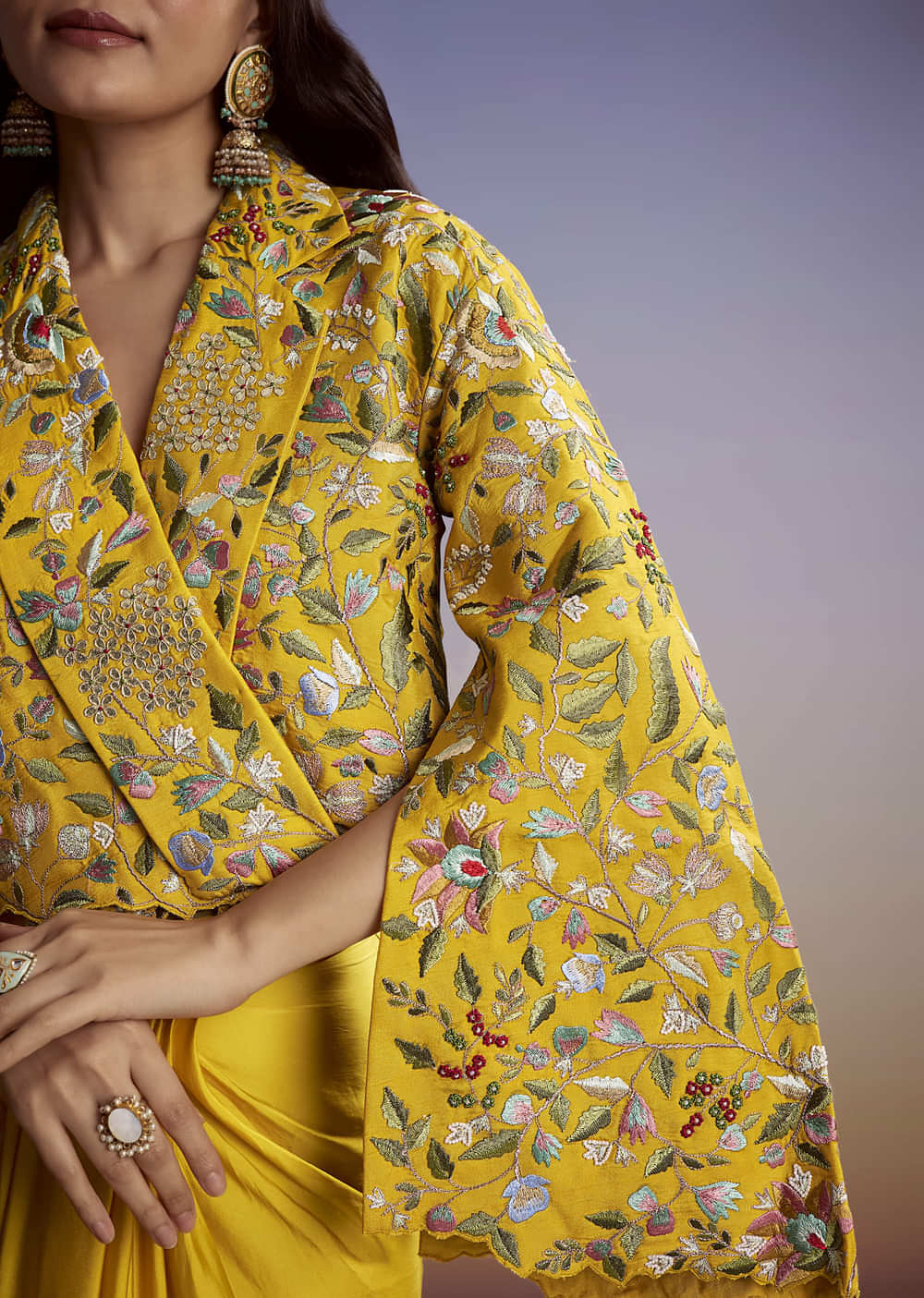 This yellow silk crop top and drape skirt is embedded with resham work that radiates joy. Perfect for haldi, mehendi, or any daytime event where you want the colour... More Product Details
