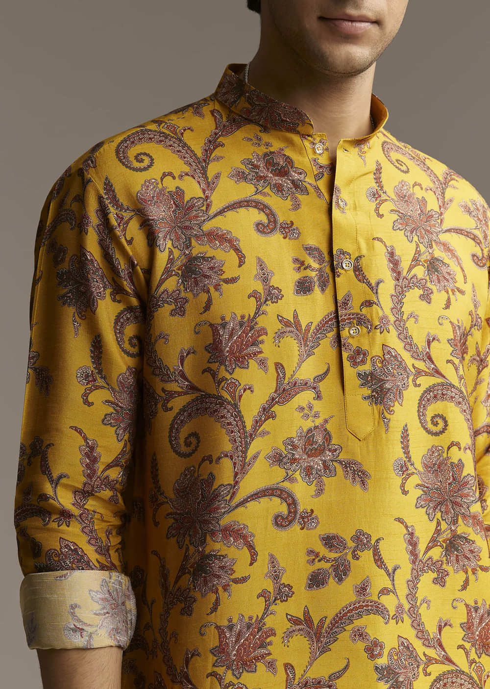 A burst of yellow makes this silk designer kurta for men a total mood booster. The motif print adds just enough detail to keep it eye-catching without being too loud. Awarded as the Most Trusted Brand, we're delivering styles you love, just as promised.