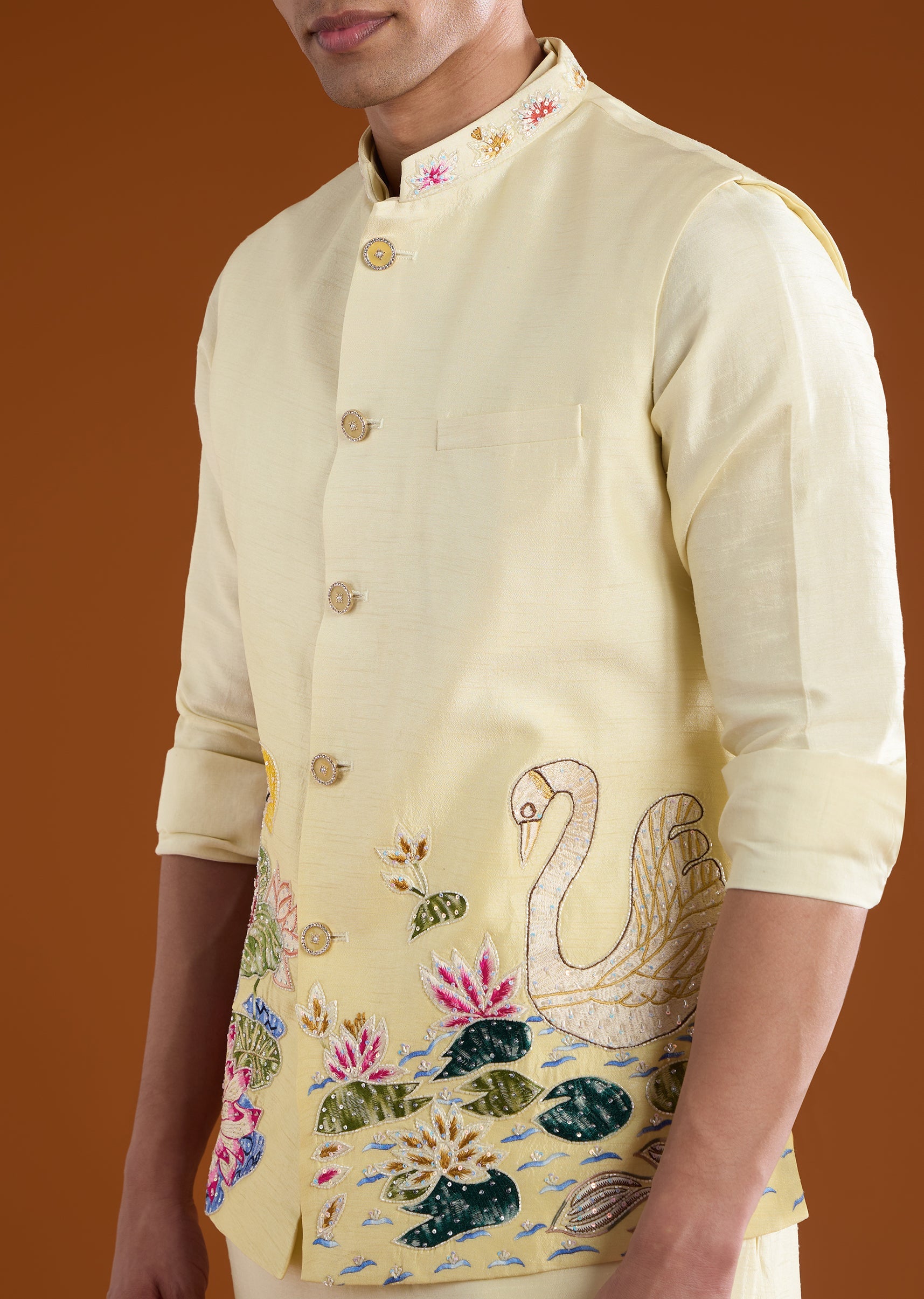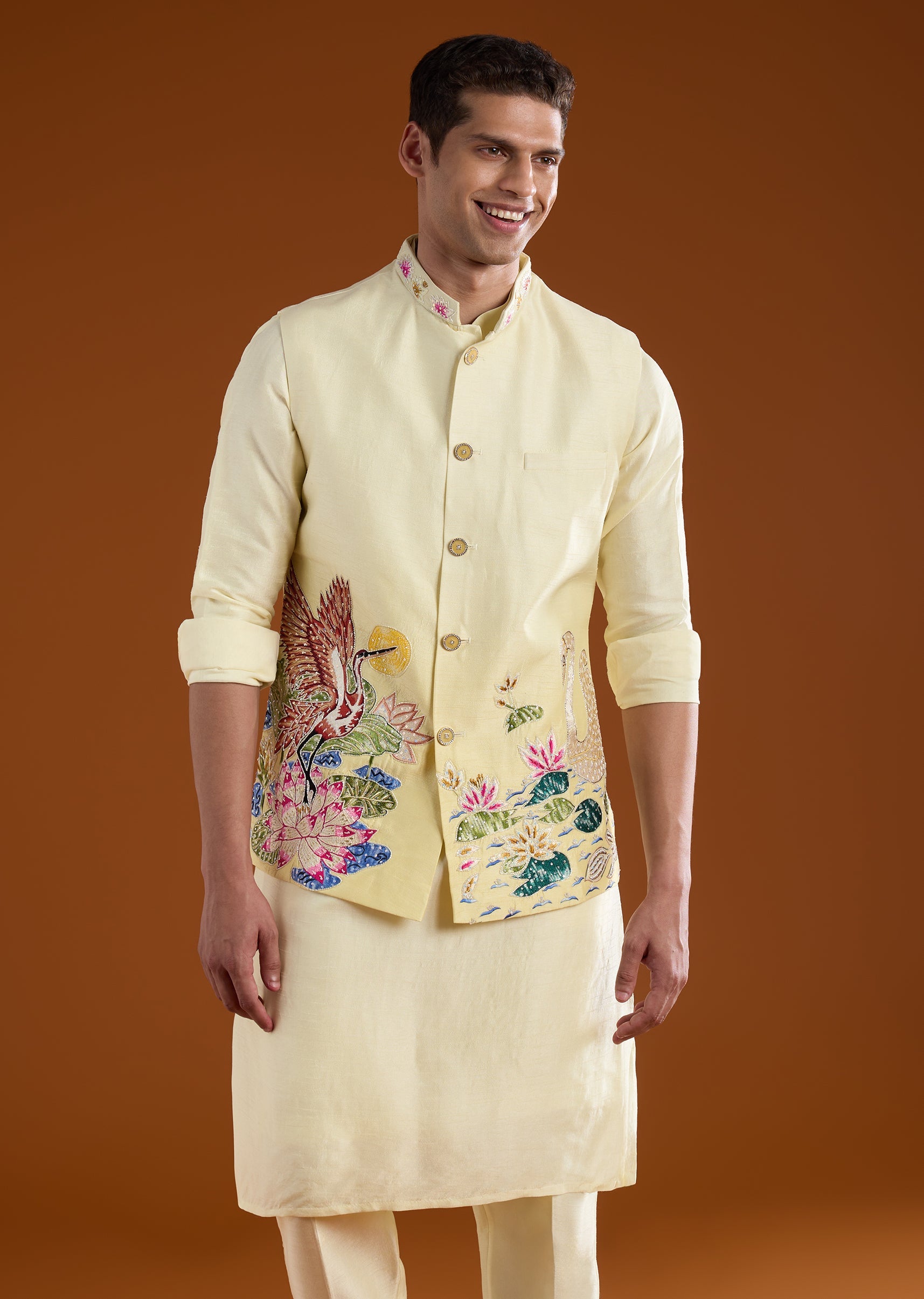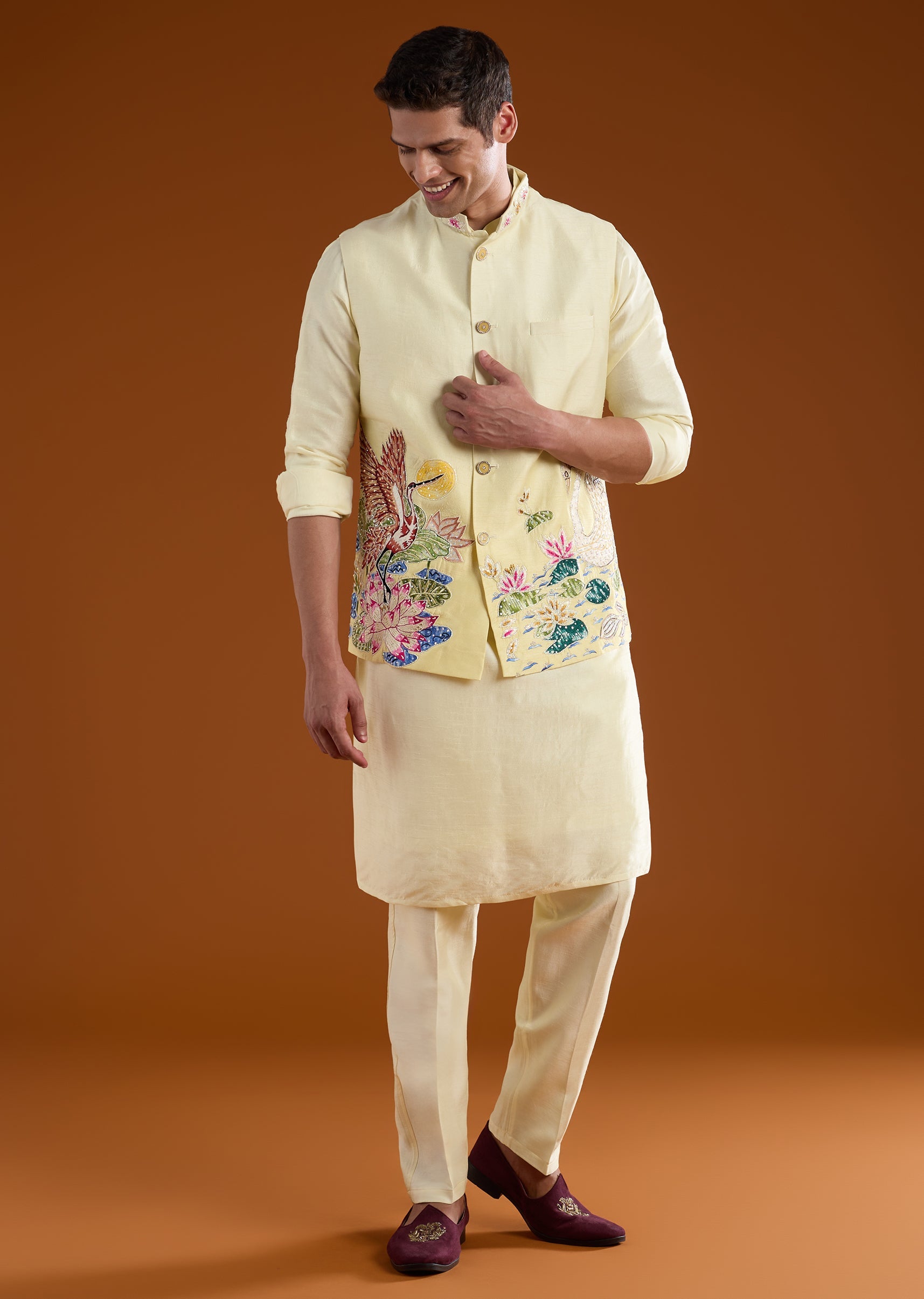 Steeped in traditional craftsmanship, this silk jacket kurta set is elevated with intricate thread, resham, and zardosi embroidery that adds a rich, ceremonial character. The full sleeves and mandarin collar create a sharp, structured silhouette, while the layered jacket lends depth and sophistication to the look. Designed to balance heritage detailing with modern styling, this ensemble includes a jacket, kurta, and coordinated pants. An ideal choice for weddings, festive celebrations, and refined cultural occasions.Awarded as the Most Trusted Brand, we're delivering styles you love, just as promised.