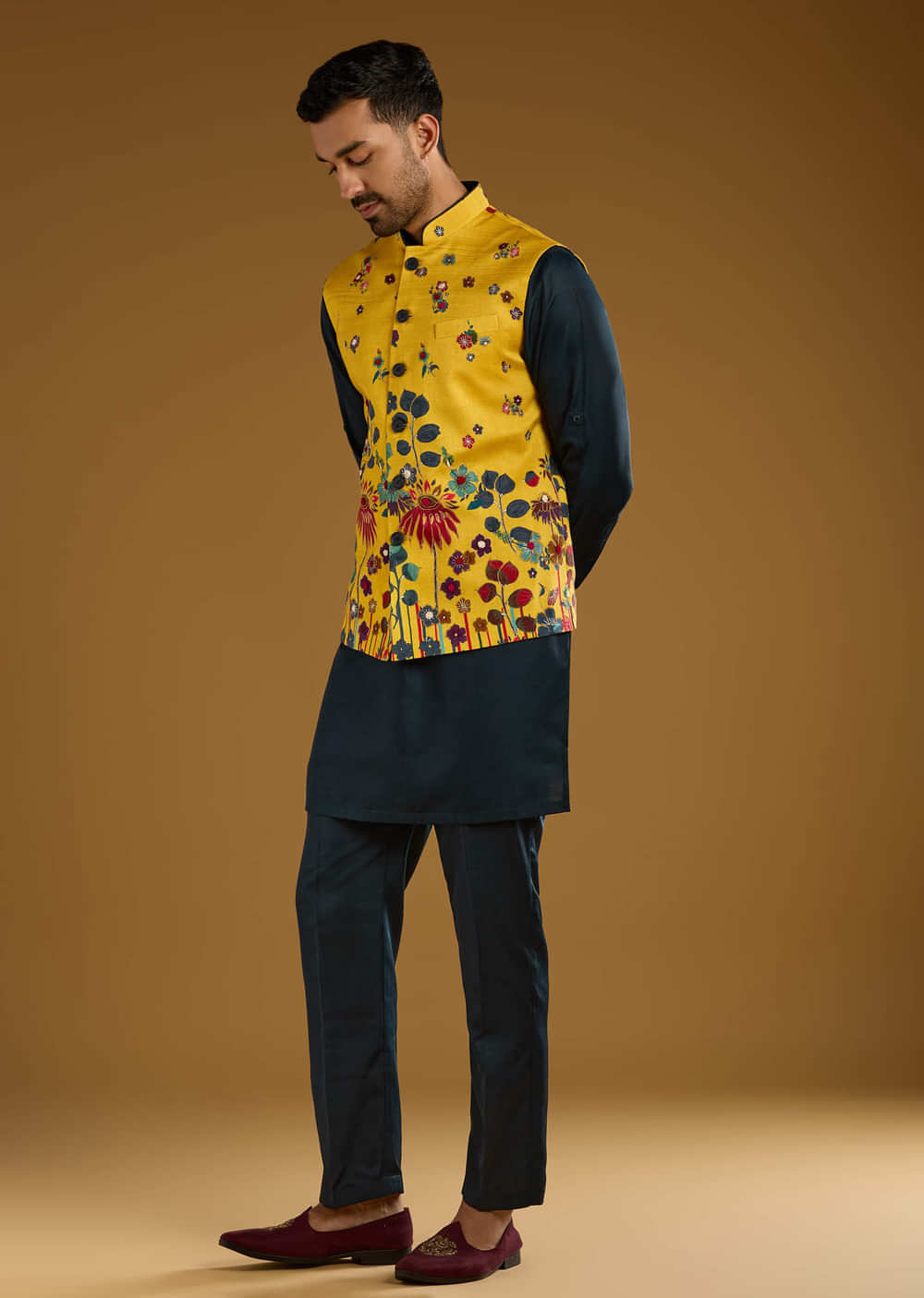 Festive energy lands quickly with this yellow men’s kurta jacket set in art silk where fine thread work adds rhythm across the jacket. The colourful floral print reads lively outdoors... More Product Details