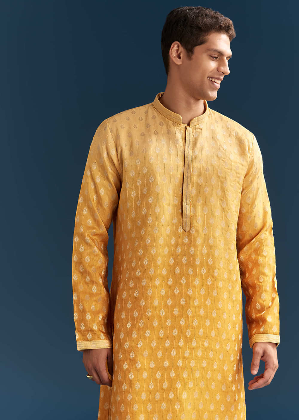 The yellow silk foil men's kurta set is all about eye-catching shine with sequins that add just the right flicker for celebrations. It’s festive but with a sharp, polished edge.... More Product Details