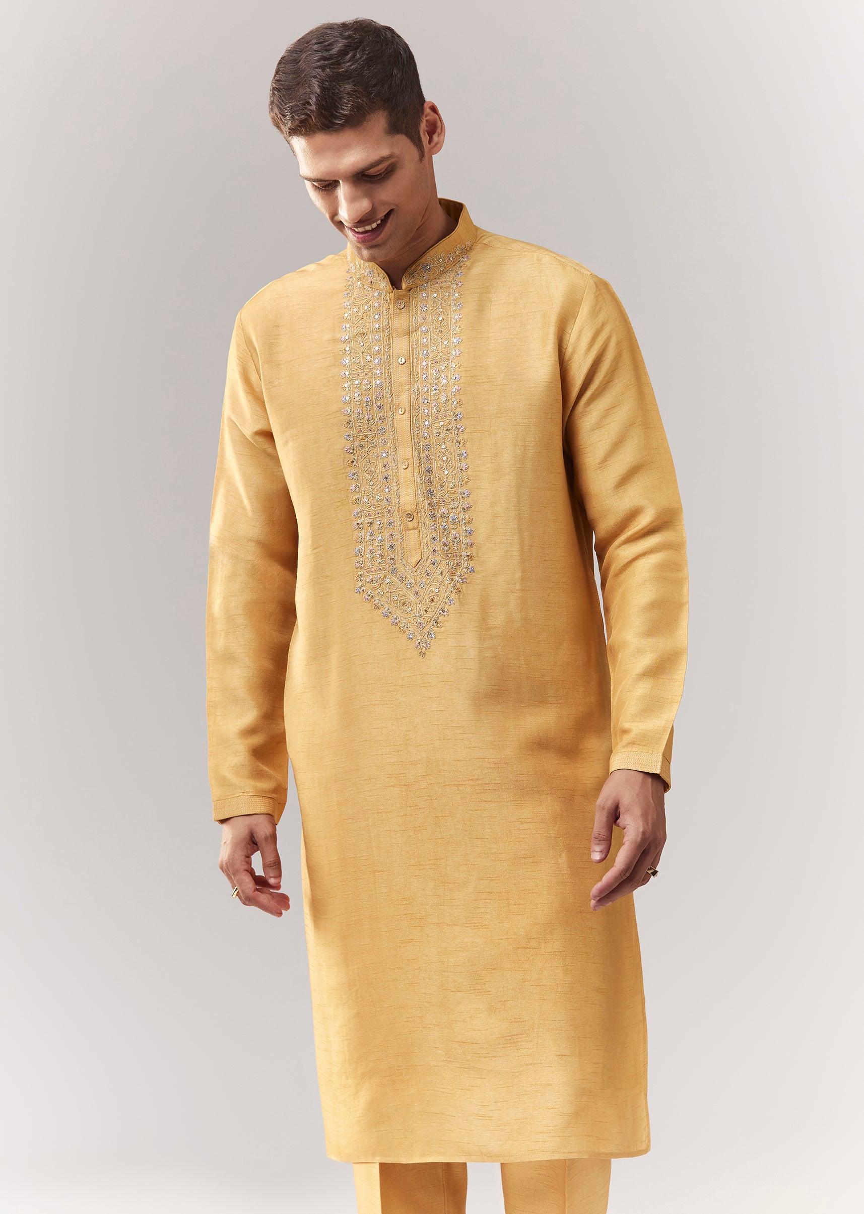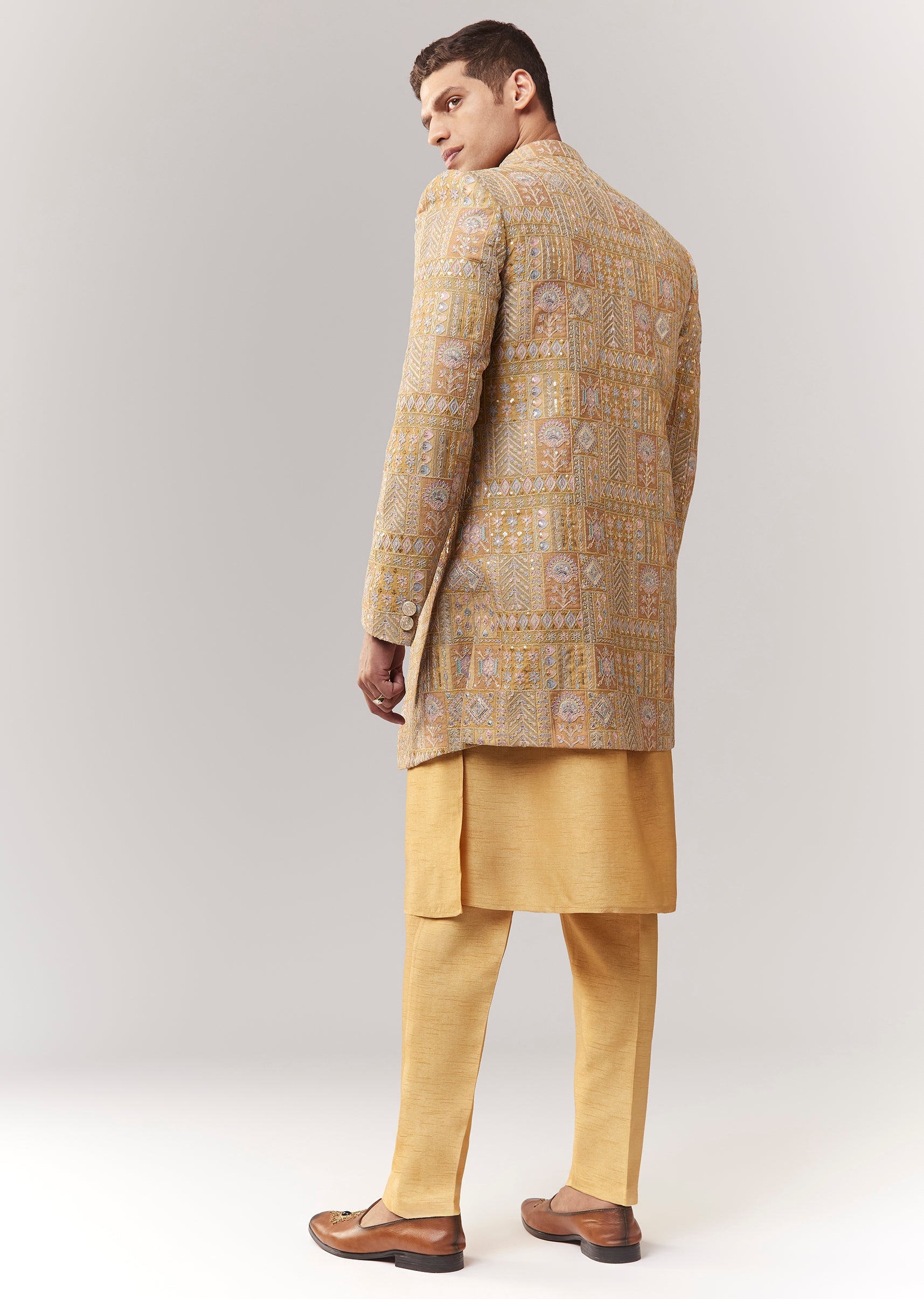 A festive yellow silk indo-western featuring thread/resham and sequin detailing. Mandarin collar, full sleeves, and front button closure with hook-eye fastening. Includes indo-western kurta/jacket styling with straight pants (mid-waist). Ideal for wedding and haldi functions for groomsmen. Awarded as the Most Trusted Brand, we're delivering styles you love, just as promised.