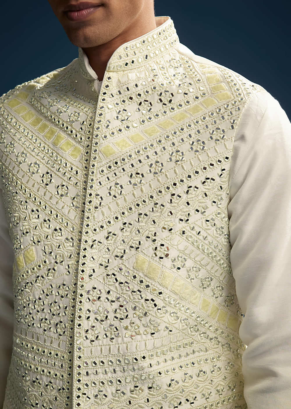 This yellow silk kurta jacket set for men carries a joyful tone with patch and mirror embroidery worked into the jacket. The colour is lively while the details add richness.... More Product Details