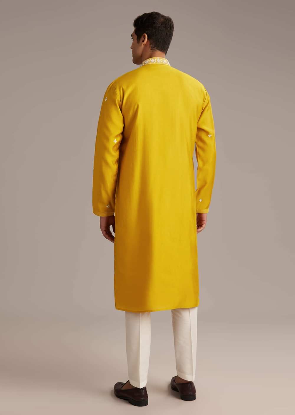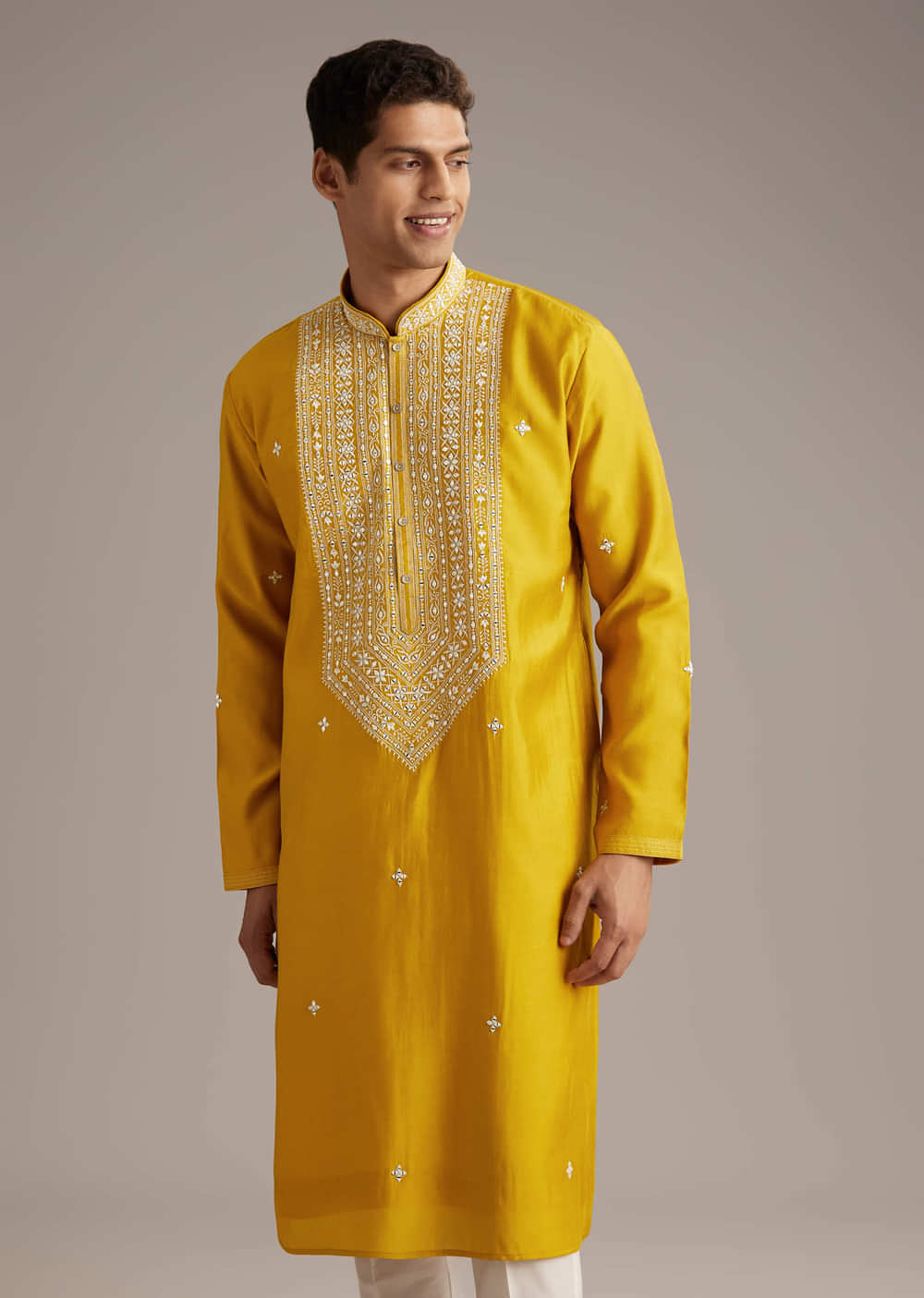 Yellow Silk Kurta Set For Men With Mirror And Thread Work