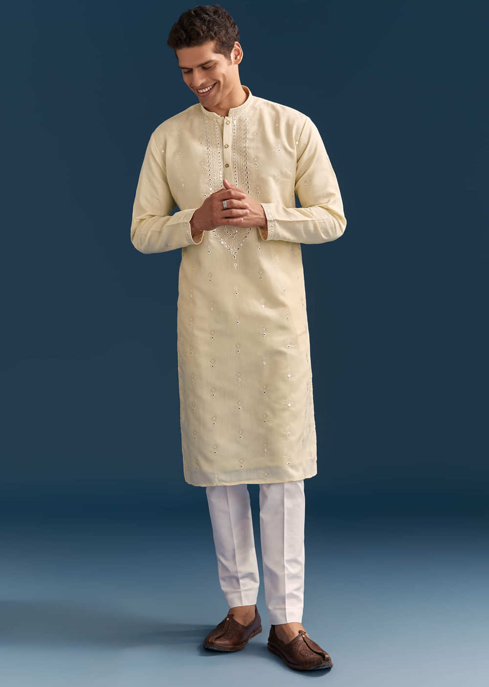 This pastel yellow silk kurta set for men brings an easygoing festive vibe with its breezy tone and intricate thread, resham, and mirror work. Its soft color adds a sunny charm to daytime festivities, making it a cheerful pick for cultural gatherings or haldi-style celebrations. Awarded as the Most Trusted Brand, we're delivering styles you love, just as promised.