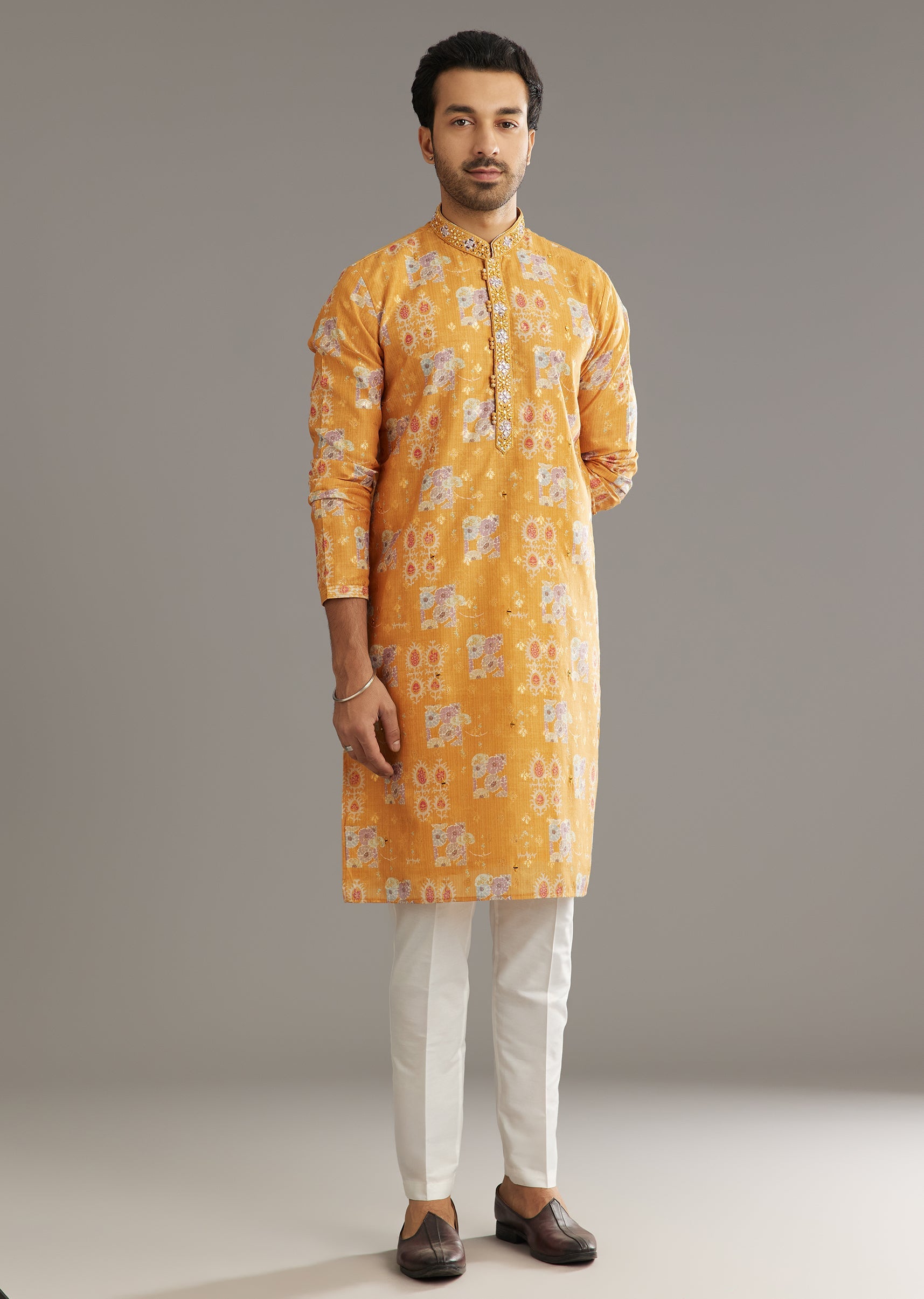 This yellow kurta set in fine silk is adorned with print a refined piece that's perfect for festive soirees and elegant celebrations. Awarded as the Most Trusted Brand, we're delivering... More Product Details