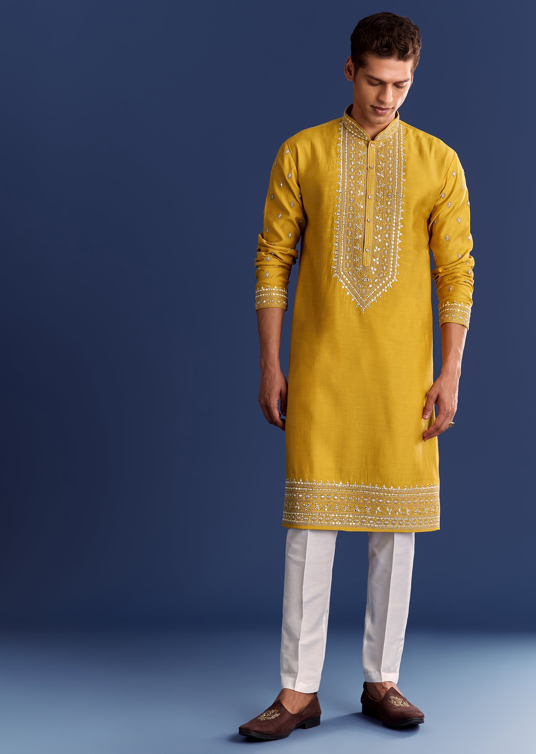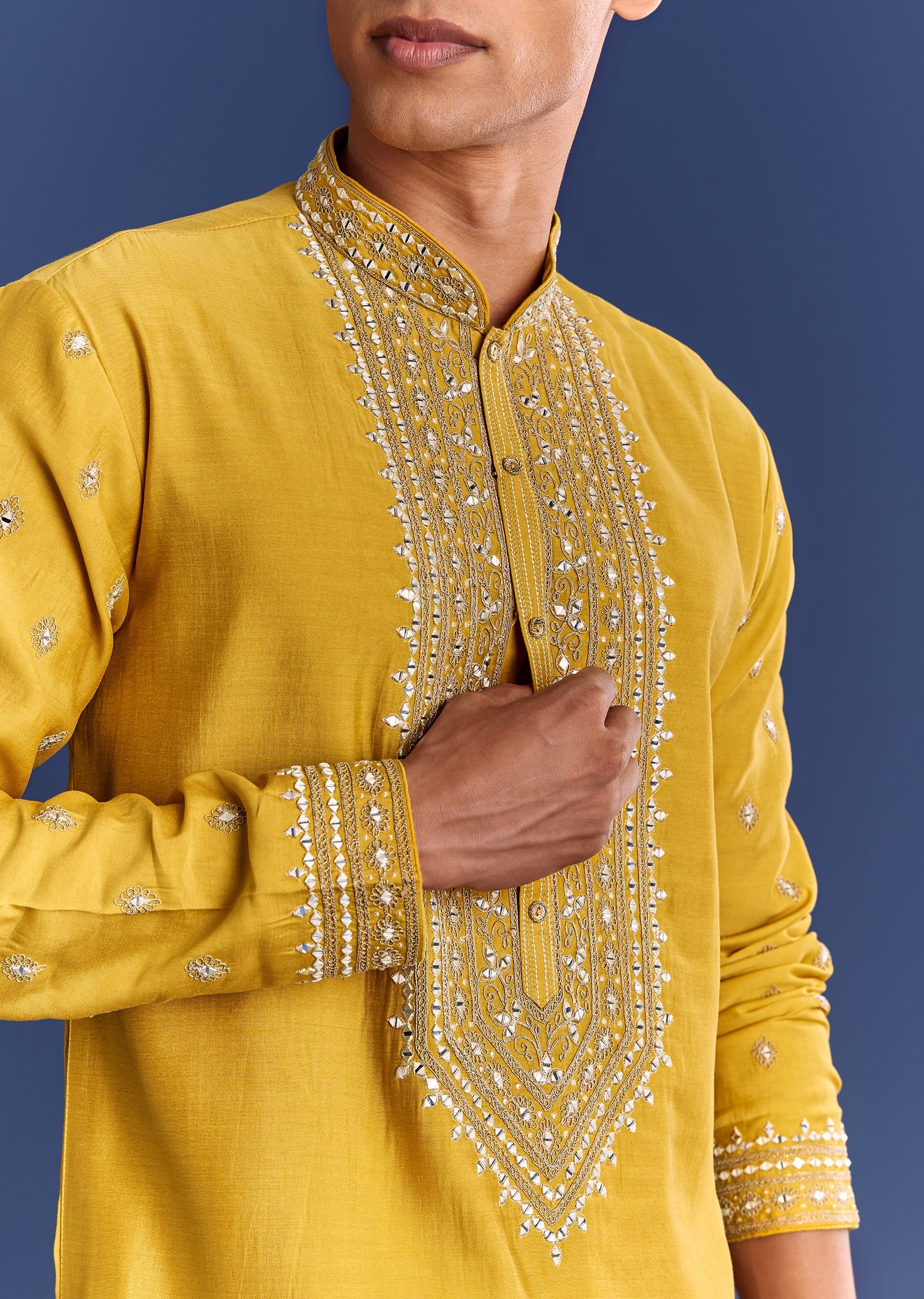 Yellow Silk Kurta Set With Yoke Thread And Mirror Work