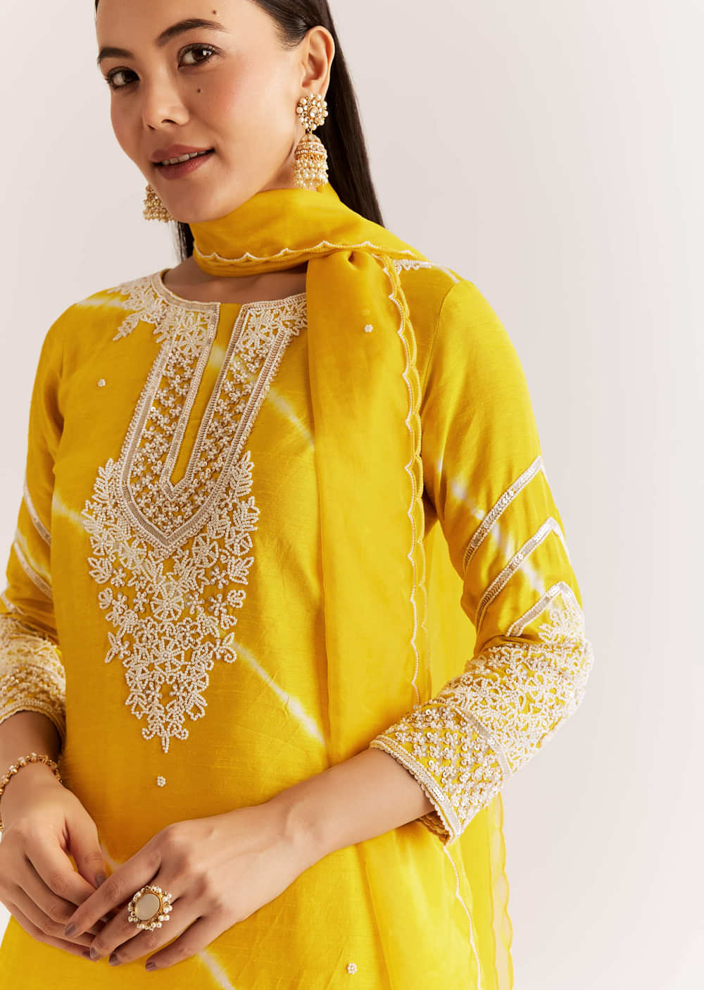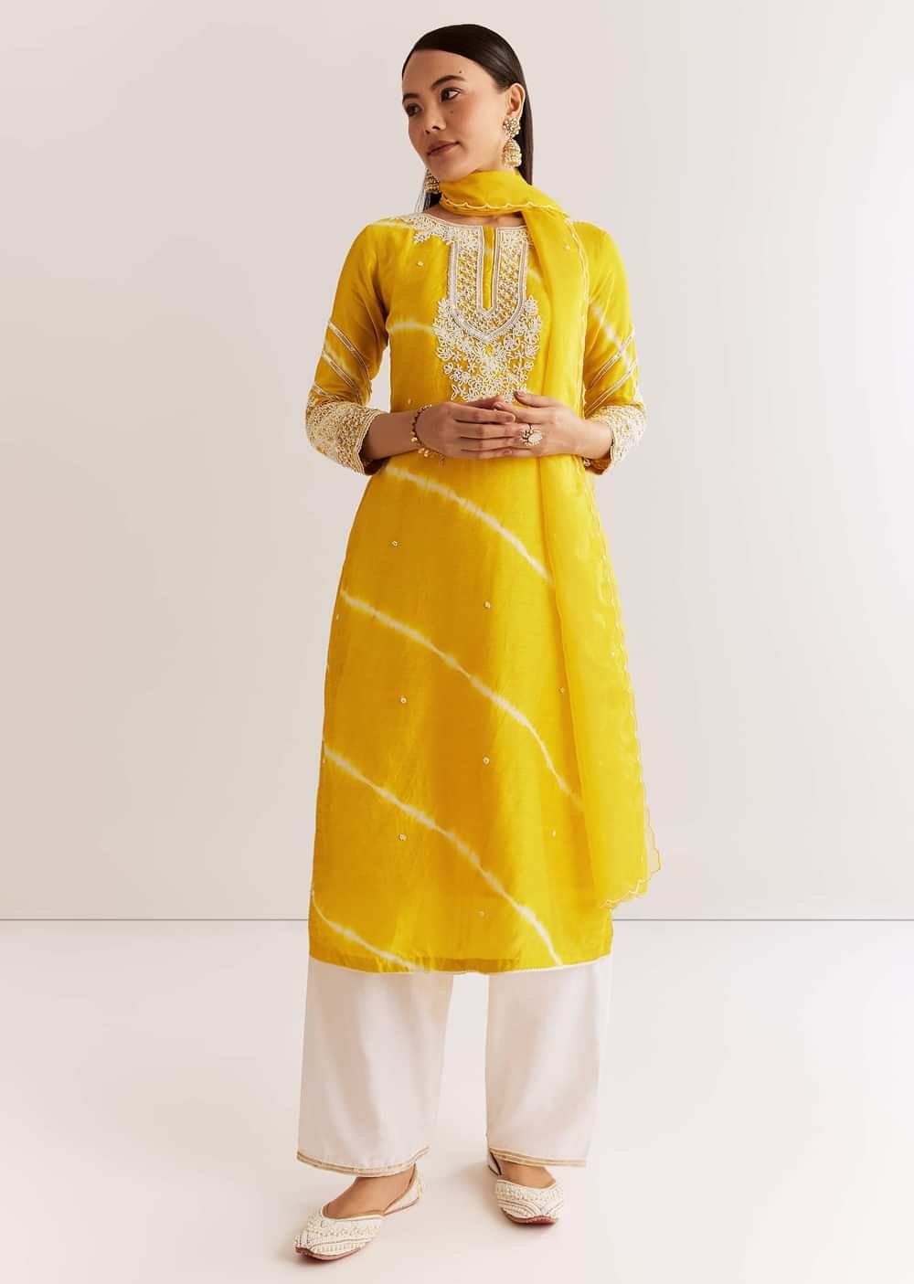 Celebrate tradition with this yellow silk leheriya kurta enhanced by moti work. Paired with a soft organza dupatta that carries coordinating embellishments for festive pooja looks. Awarded as the Most... More Product Details