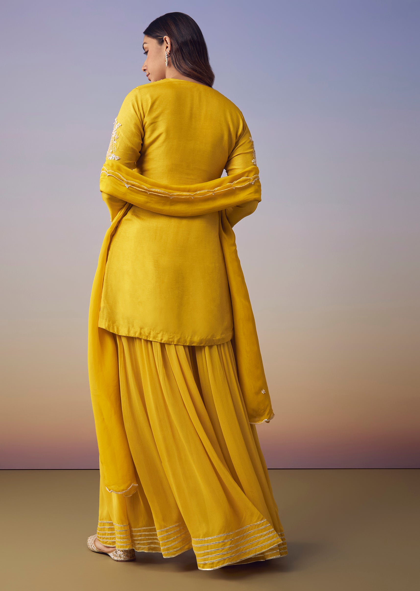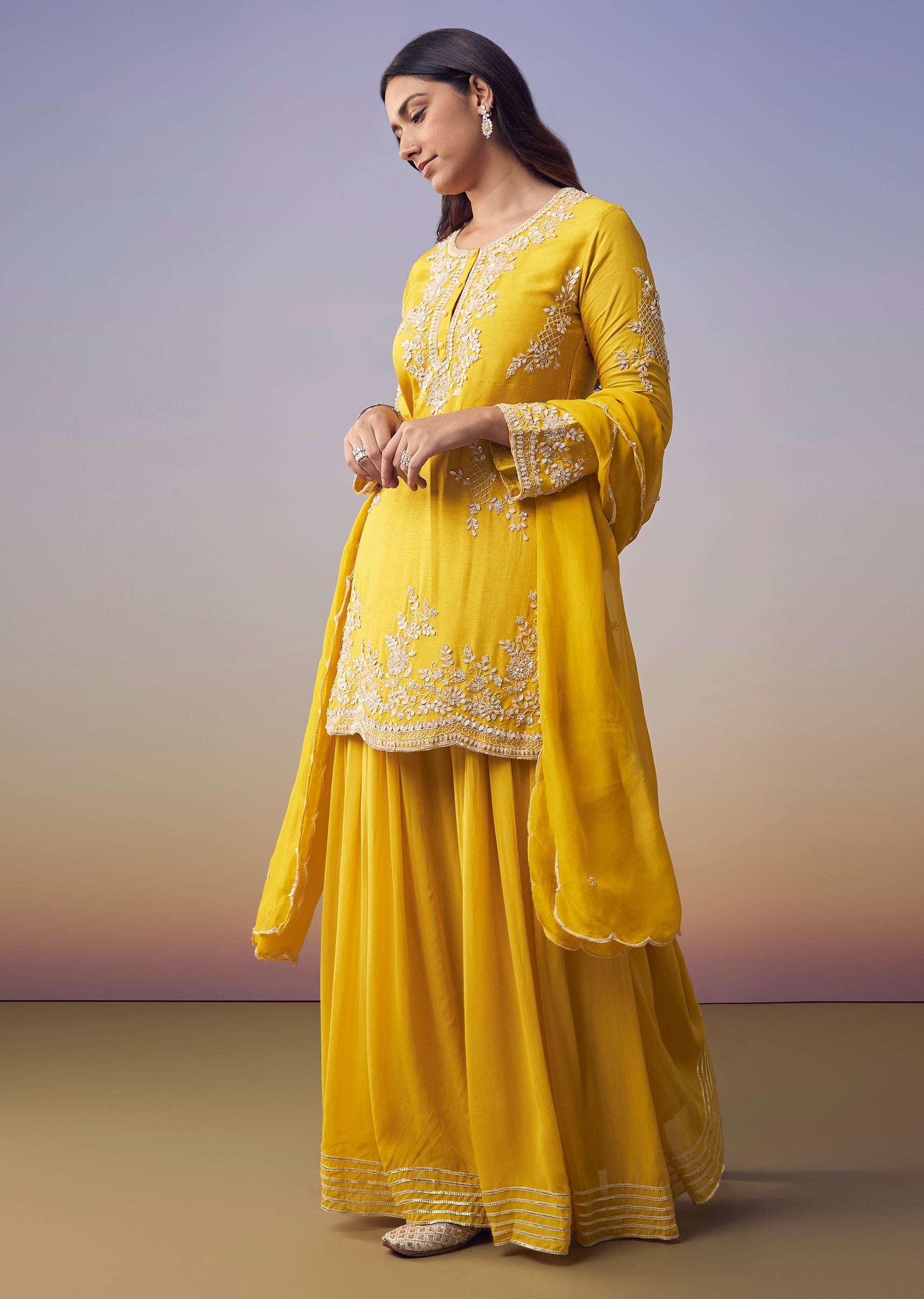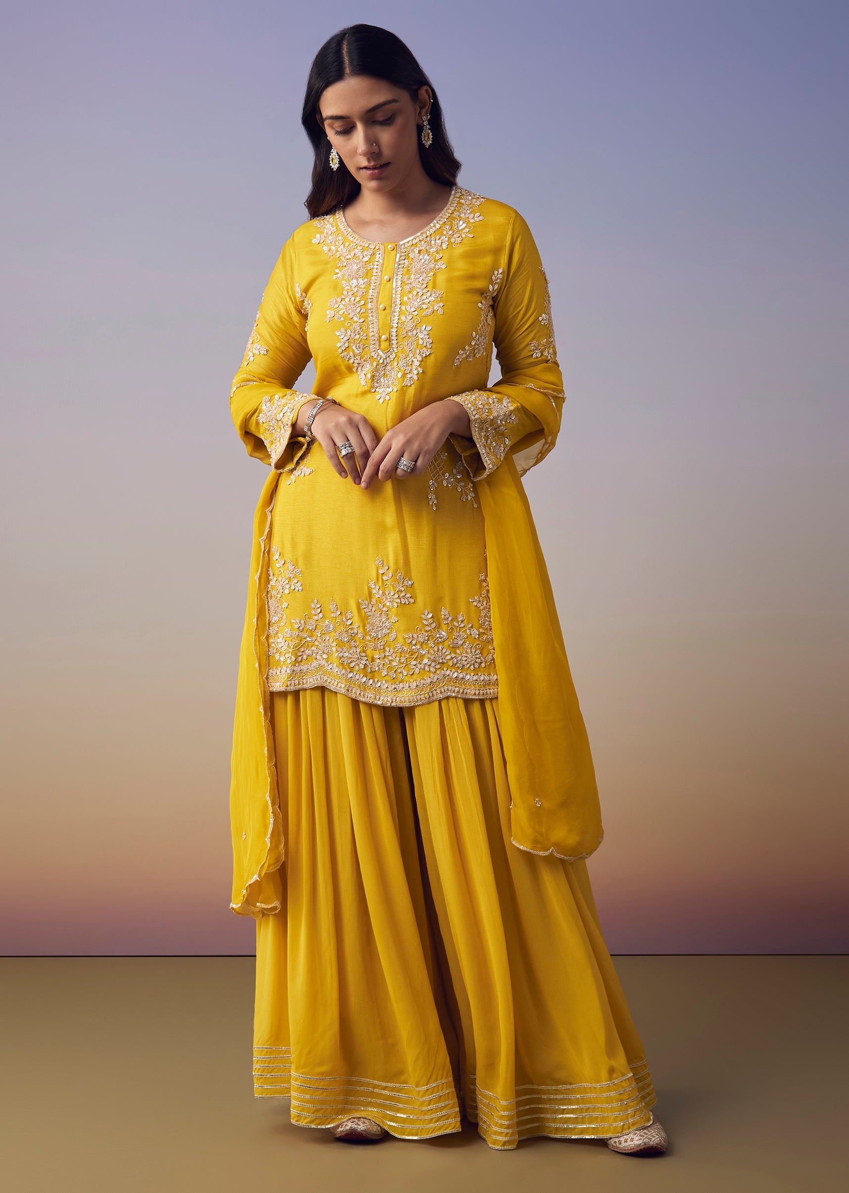 Brighten any celebration with this yellow silk kurta set adorned with sparkling sequins, fine cut dana detailing, and delicate embroidery that add a lively festive glow. The full sleeve round... More Product Details