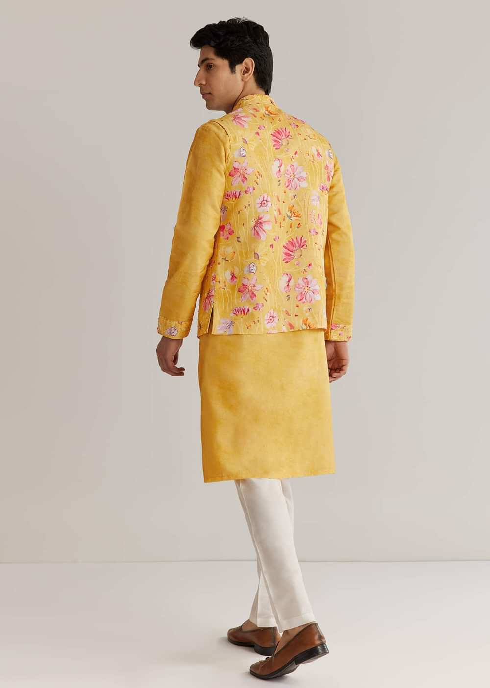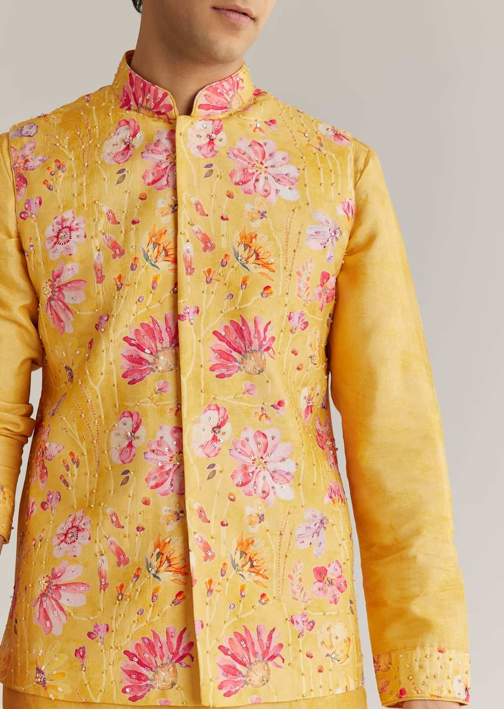 Yellow Silk Stone Sequins Cutdana Kurta Jacket Set