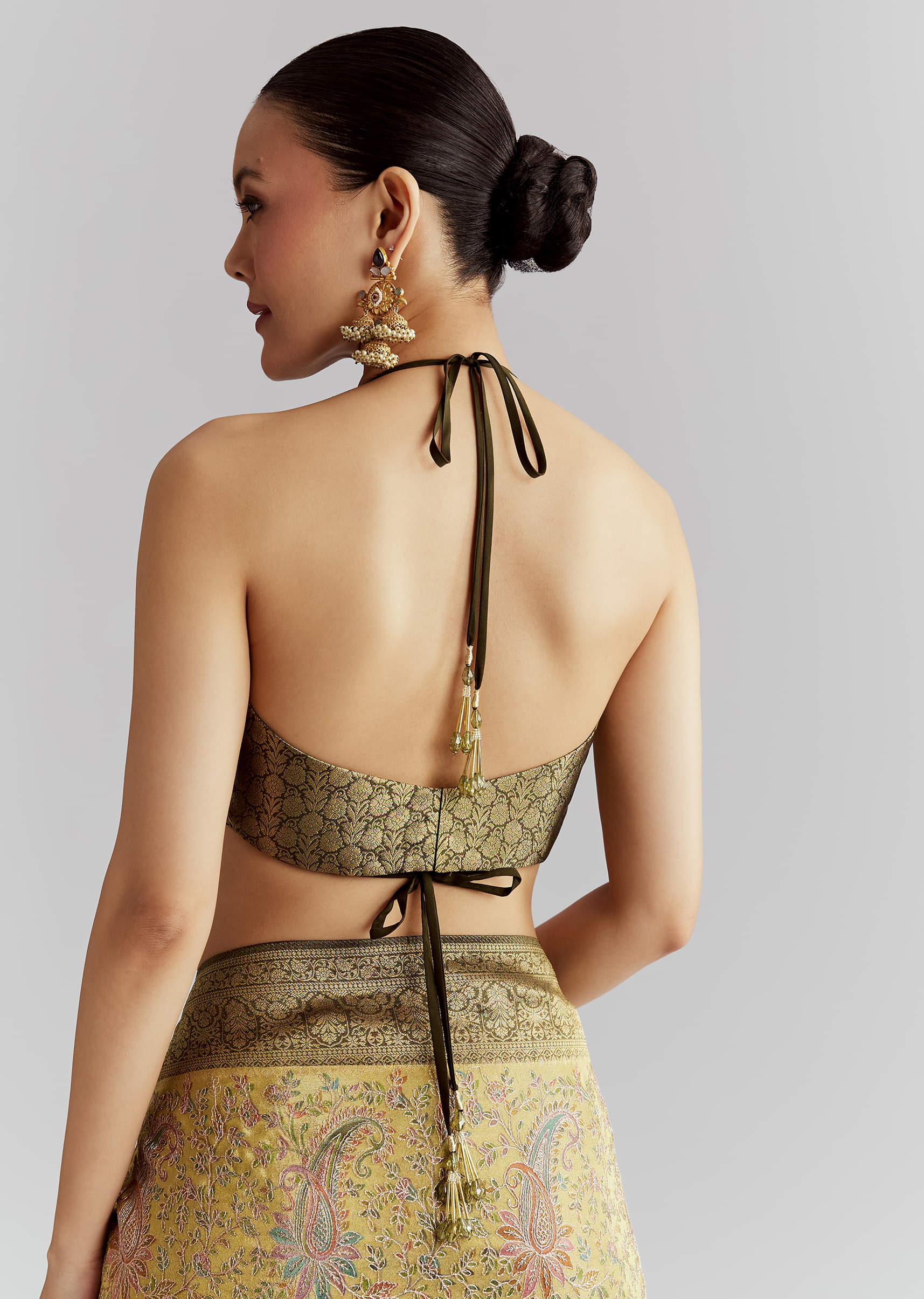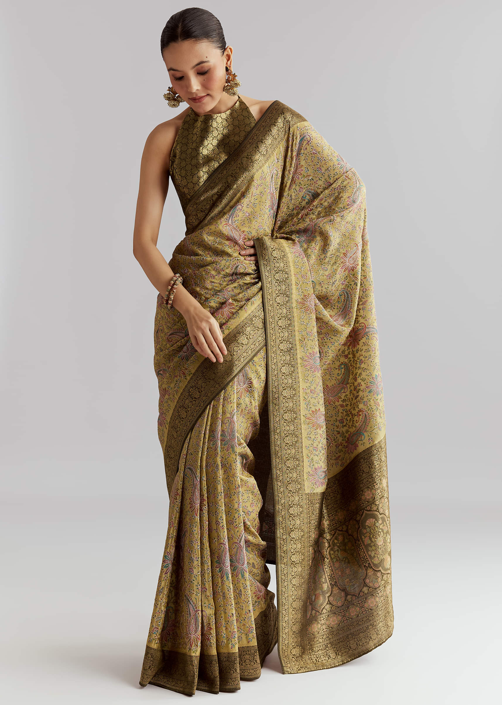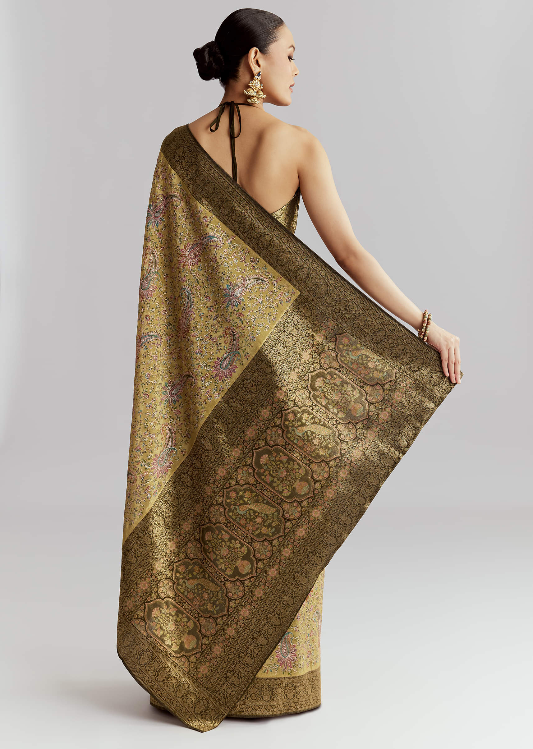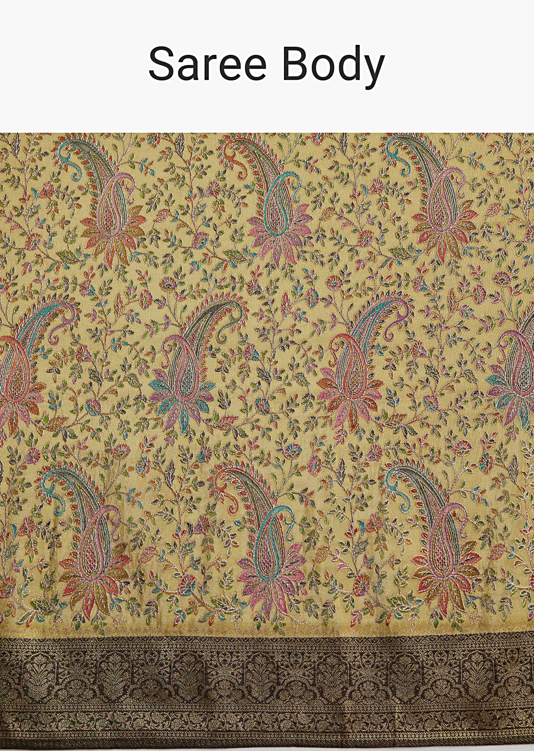 More candlelit than citrus in tone, this yellow silk woven saree leans warm and softly burnished so the colour feels refined in photos and in person. Delicate thread embroidery traces... More Product Details