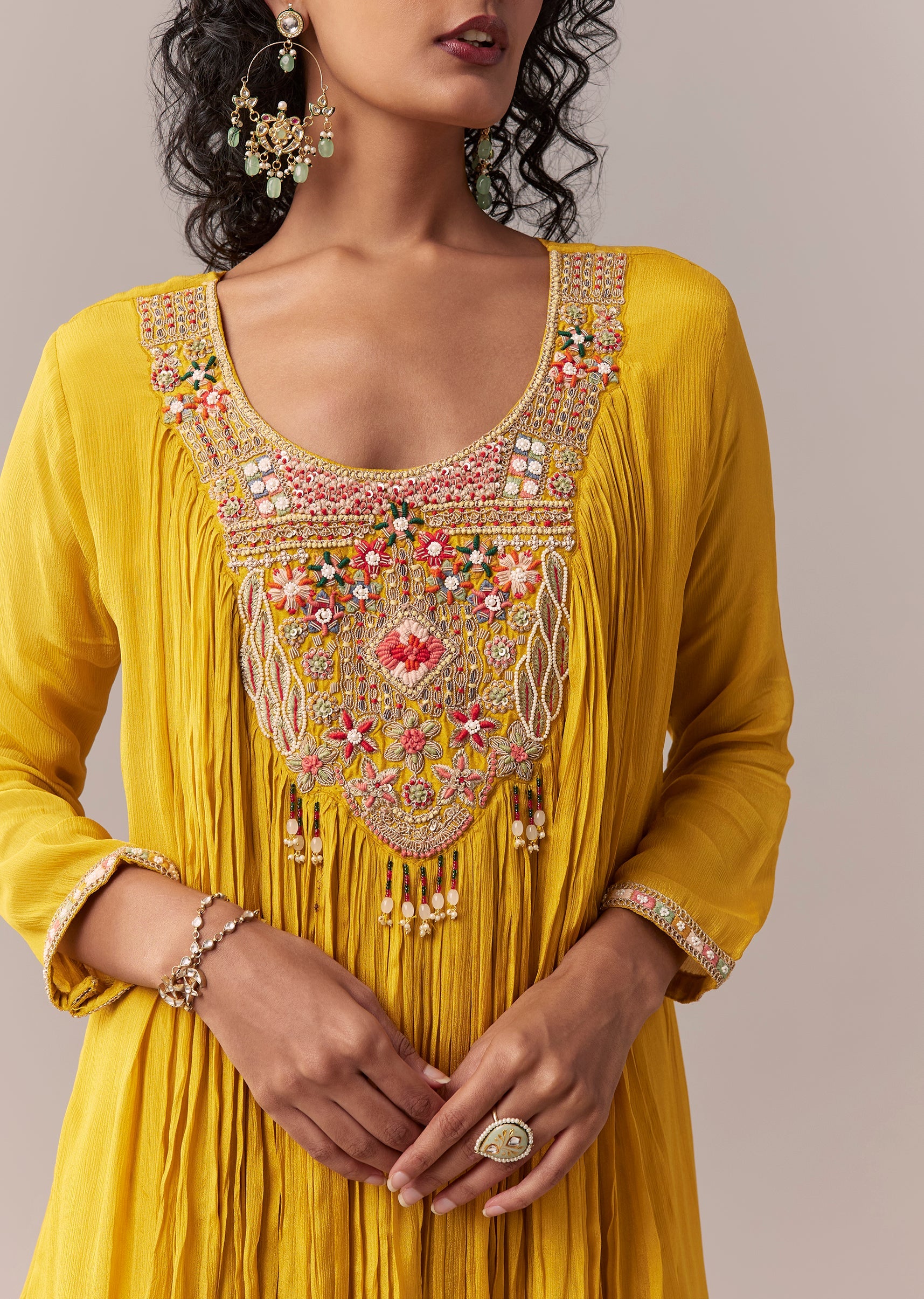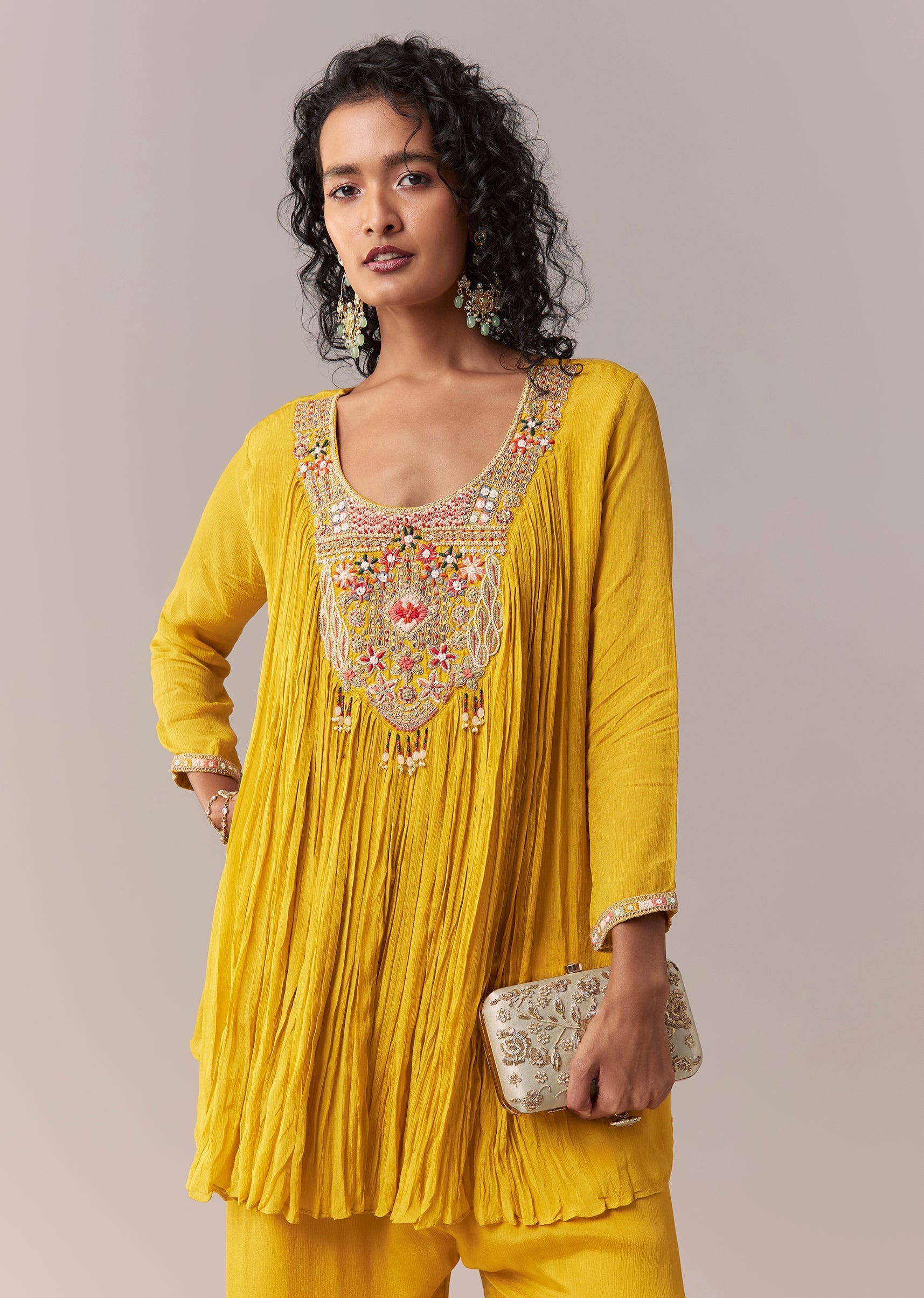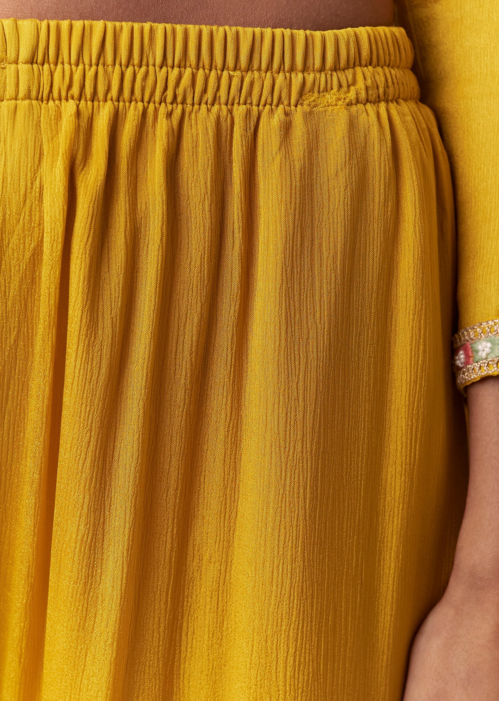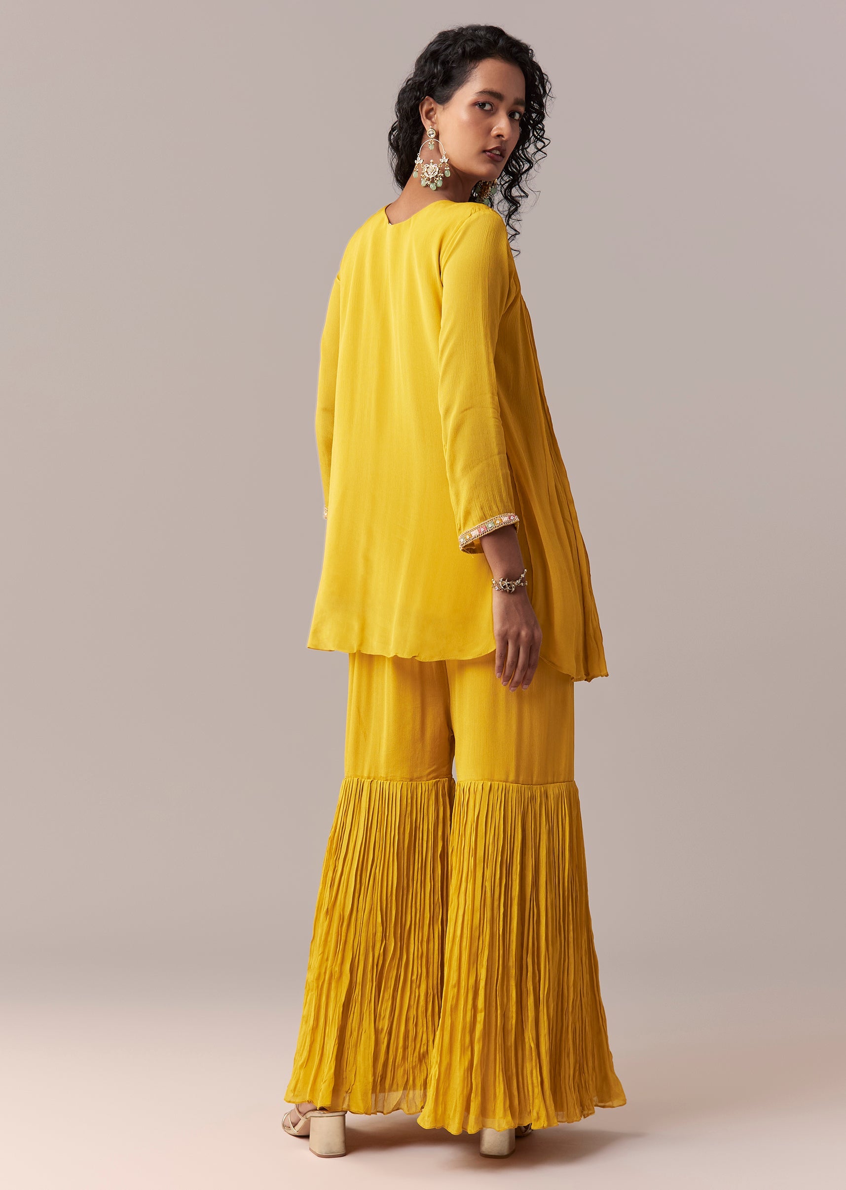 This minimal festive set is crafted in lightweight chinon and designed with a cape-style A-line top enhanced with thread and moti embroidery. Finished with full sleeves and a round neckline,... More Product Details