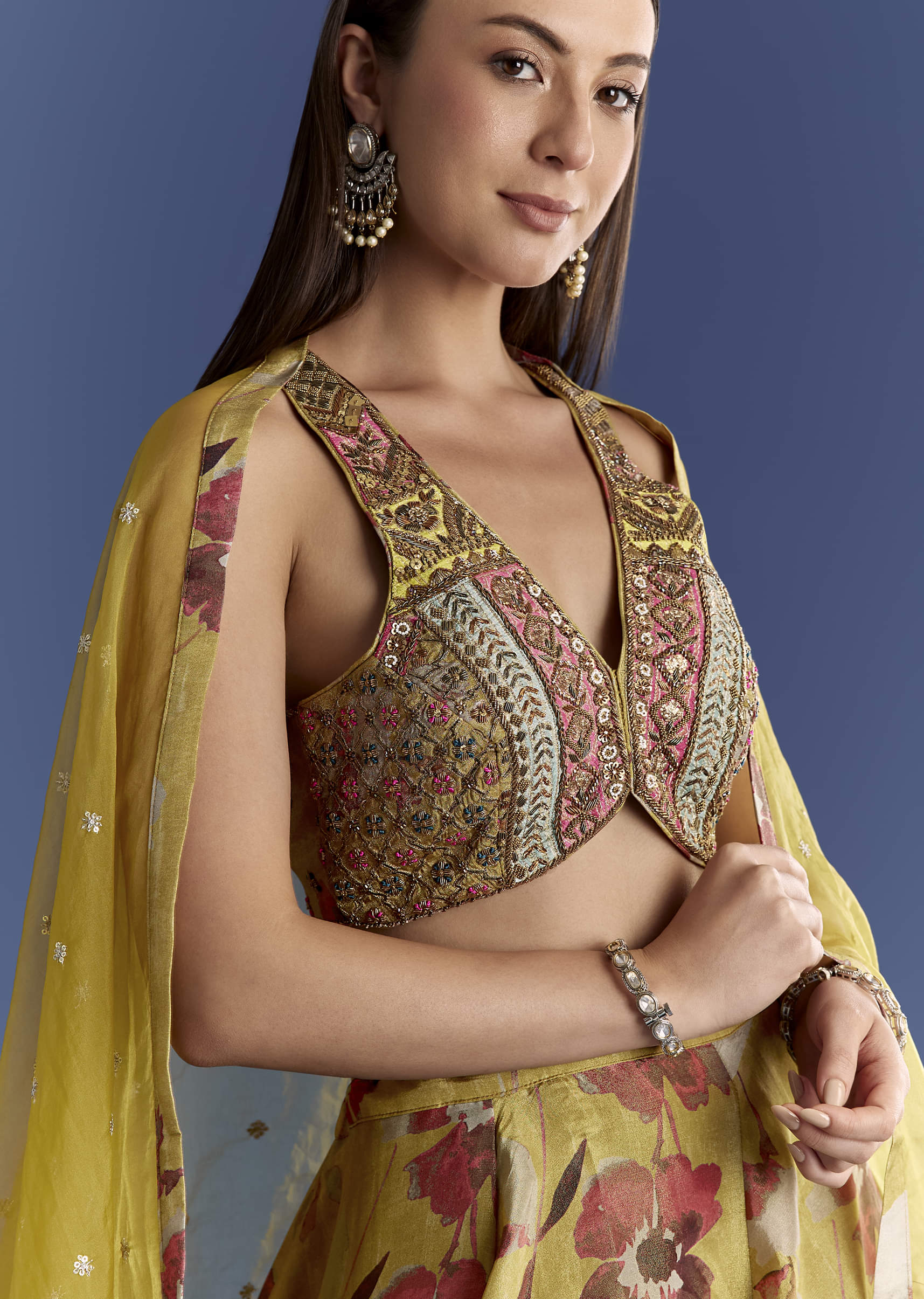 Yellow Tissue Lehenga Set With Zardosi Choli And Sequins Dupatta