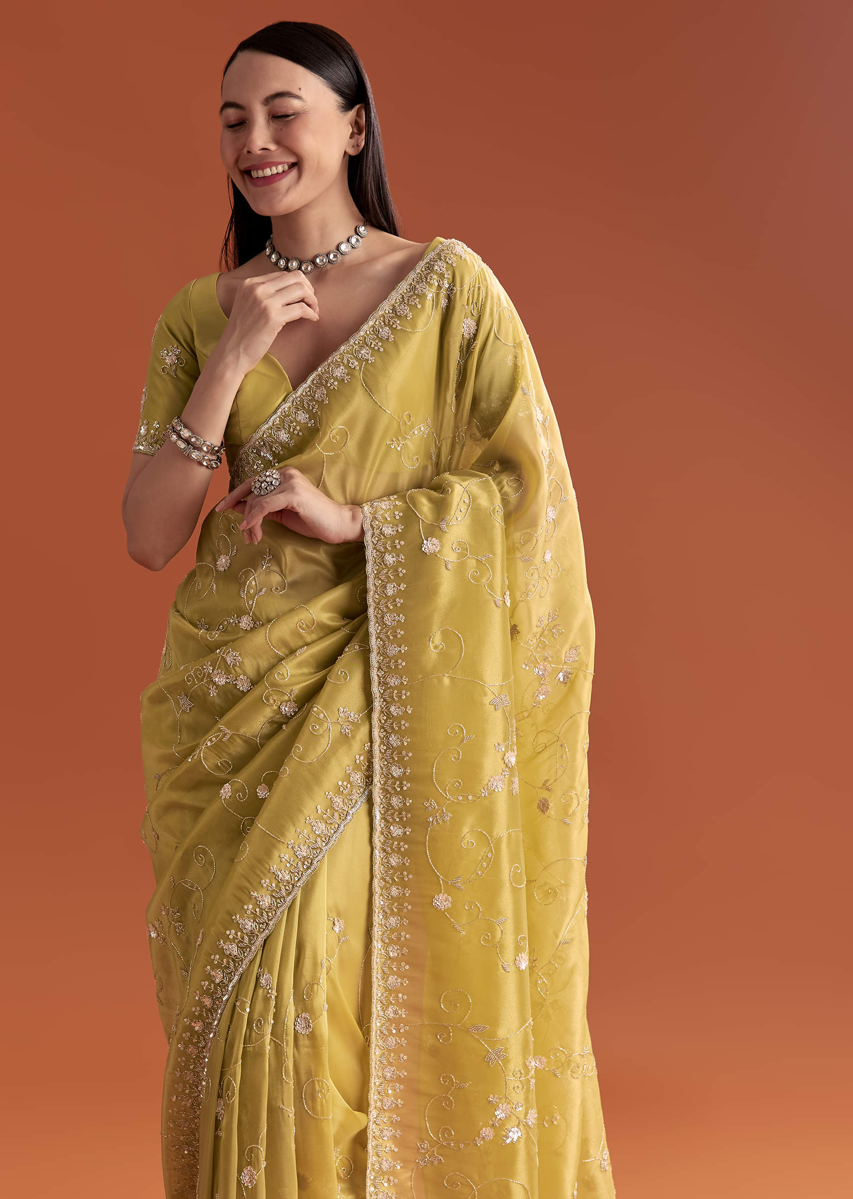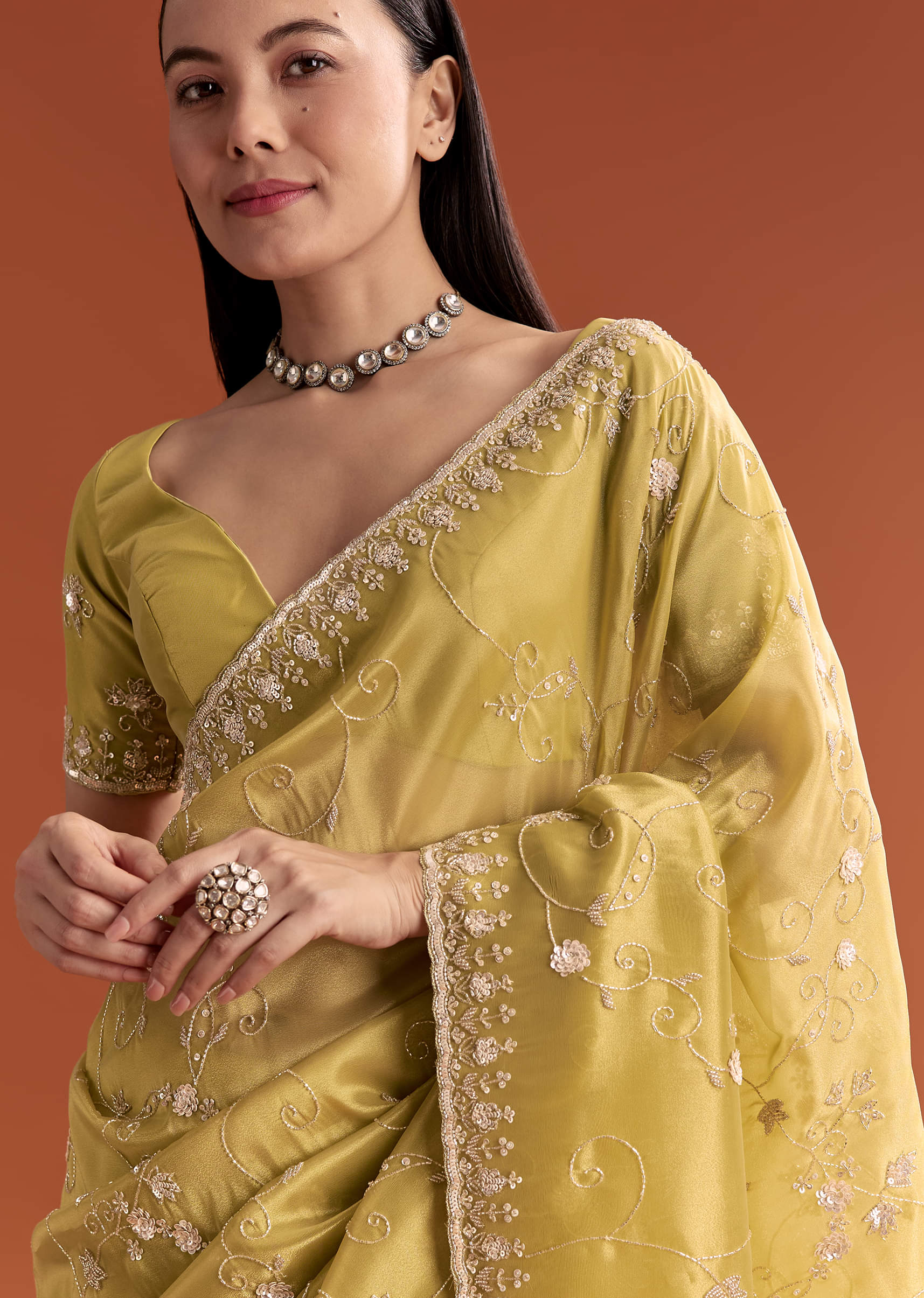 Yellow Tissue Saree With Floral Embroidery And Cutdana Work