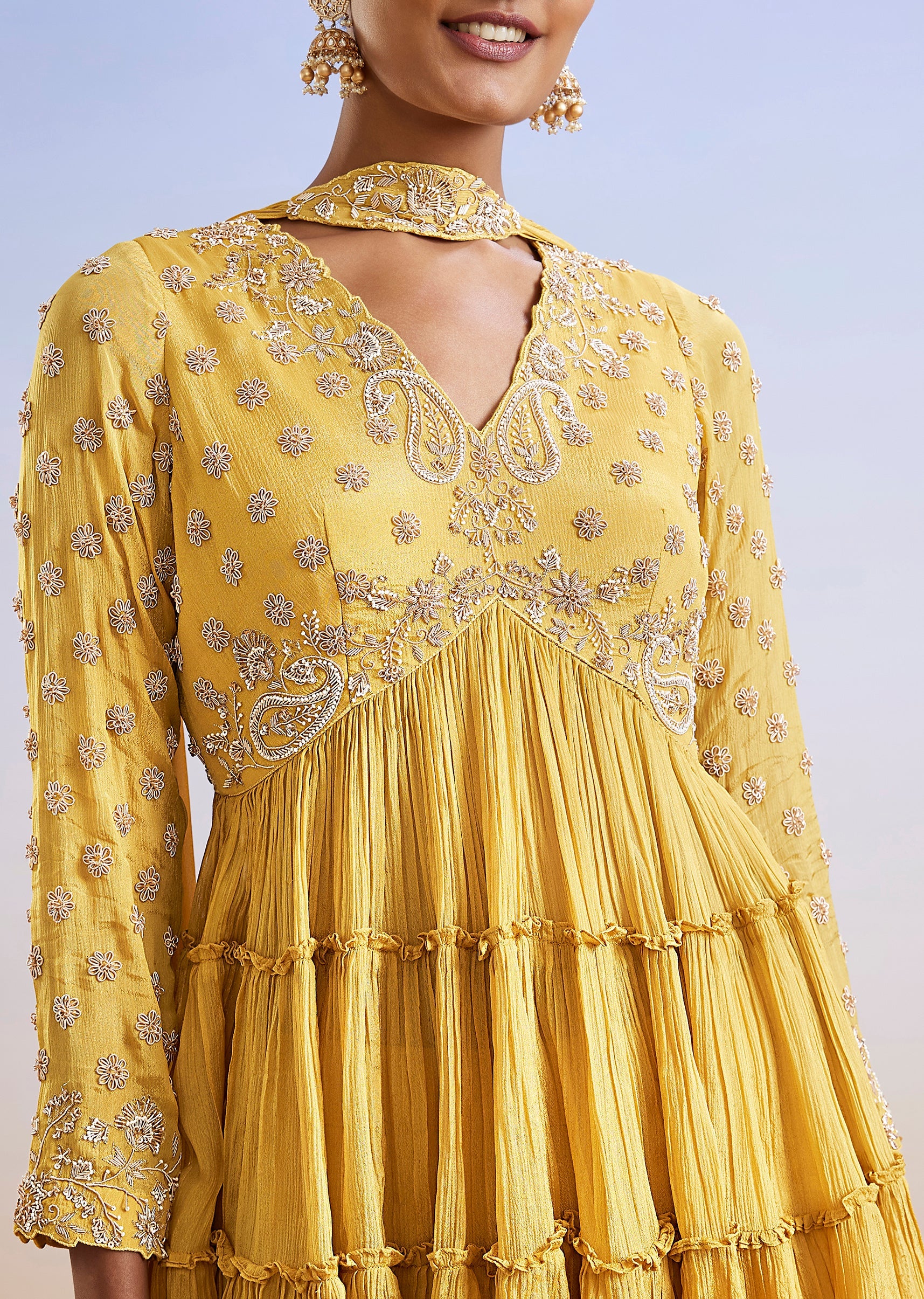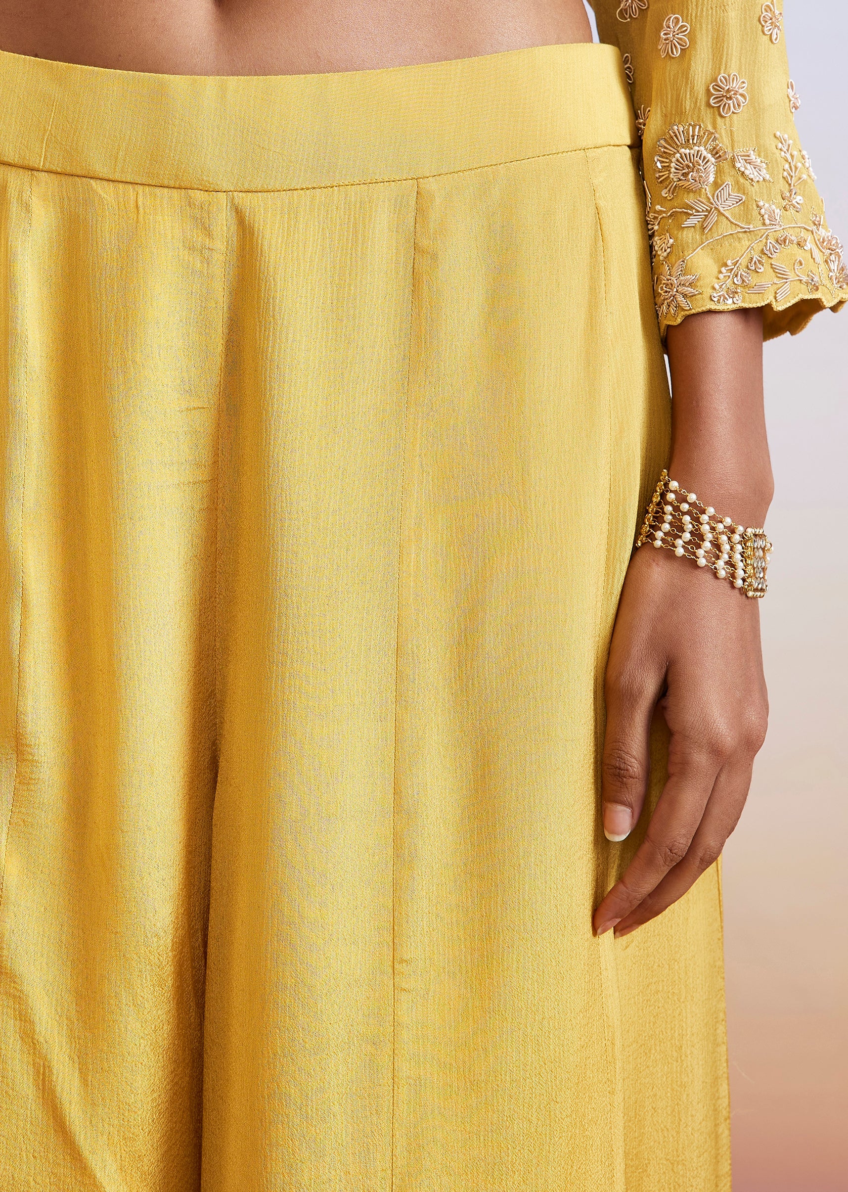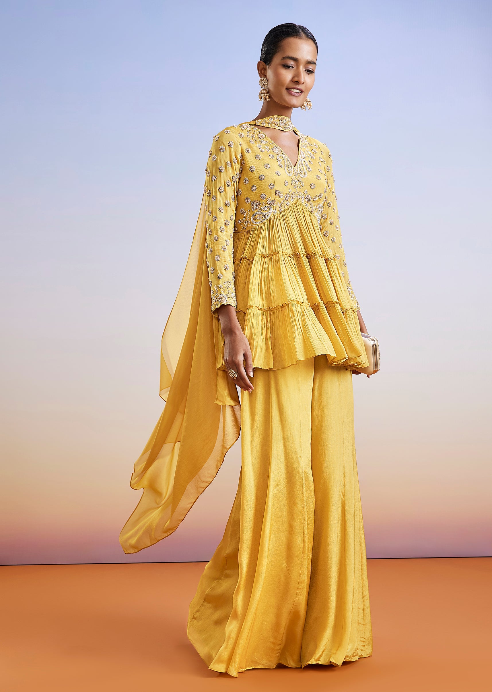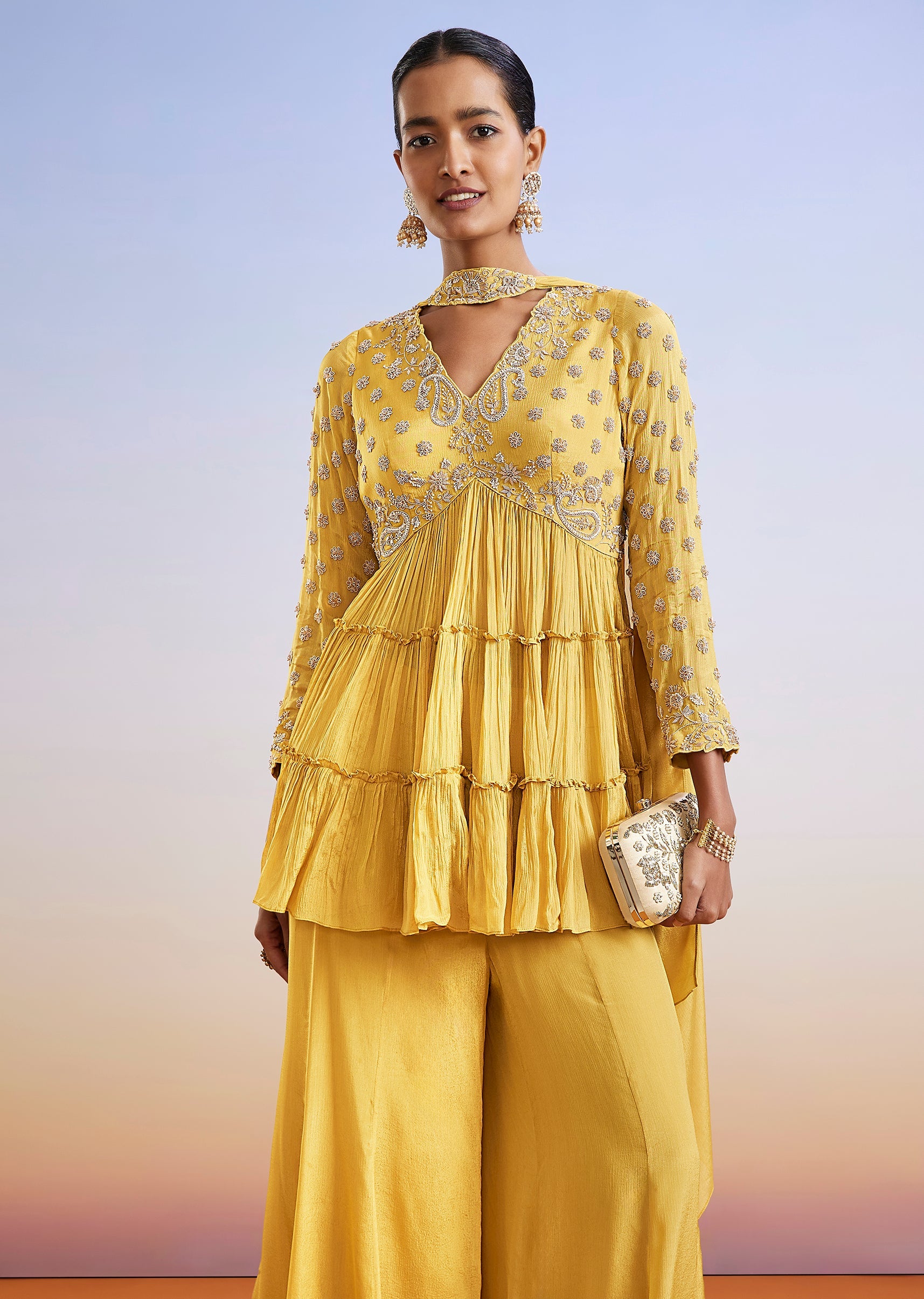 A vibrant yellow chinon palazzo suit featuring a peplum-style kurta adorned with intricate zardosi embroidery. Paired with flowing palazzos and a coordinated dupatta, this festive ensemble is perfect for haldi,... More Product Details