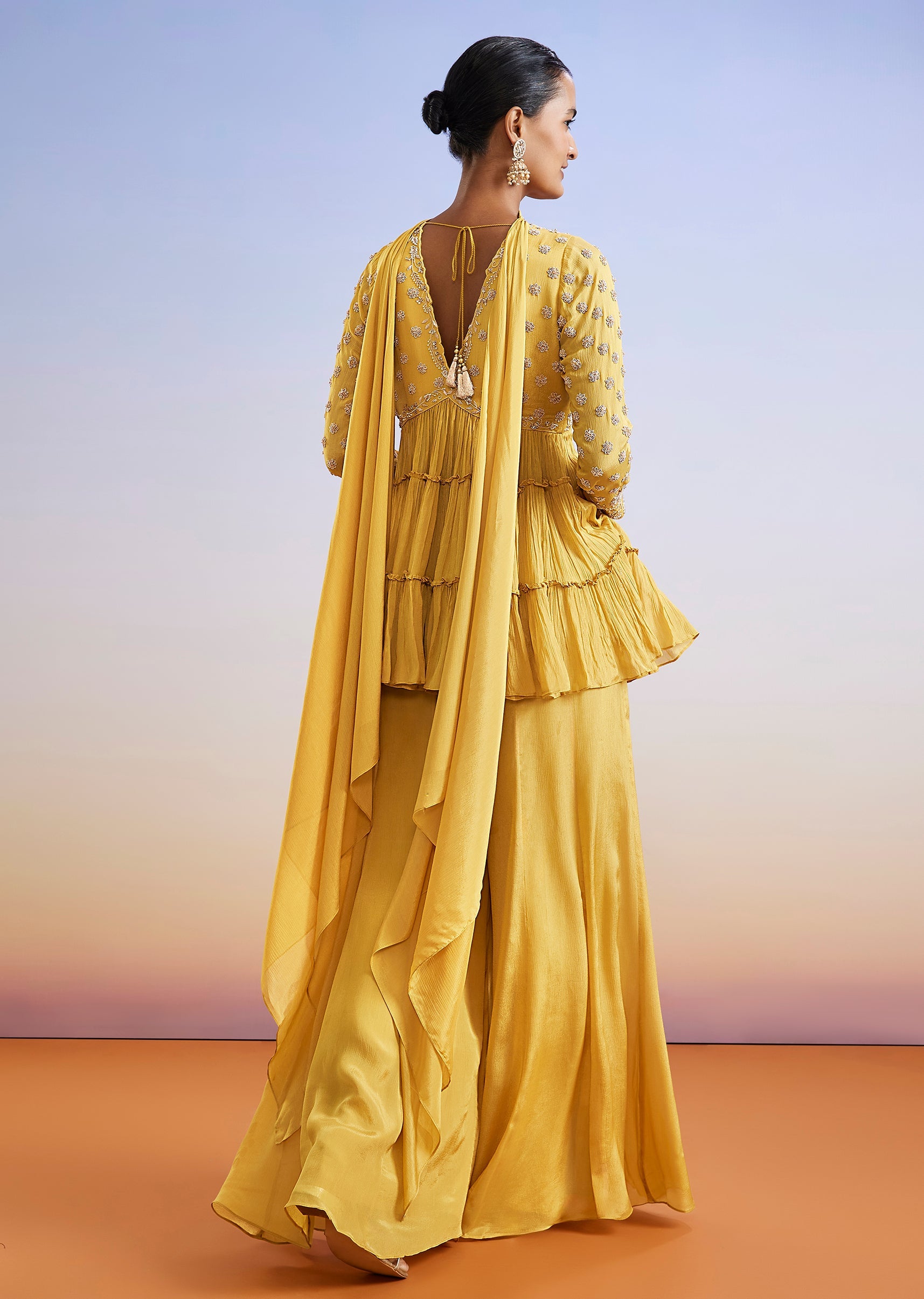 Yellow Zardosi Embroidered Chinon Peplum Palazzo Suit With Dupatta