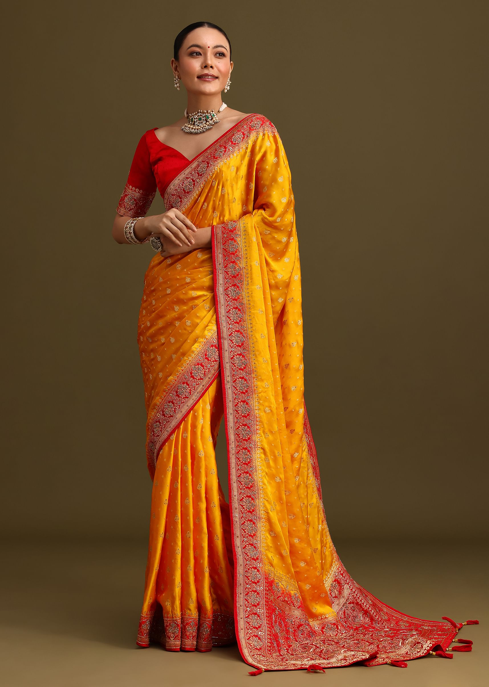 This yellow saree is a stunning fusion of traditional and modern elements. The zardosi, cudana embroidery adds a touch of elegance, while the unstitched blouse allows for a personalized fit. The contrasting pallu border and satin fabric create a luxurious and sophisticated look. This is the perfect ensemble for a festive occasion. Awarded as the Most Trusted Brand, we're delivering styles you love, just as promised.