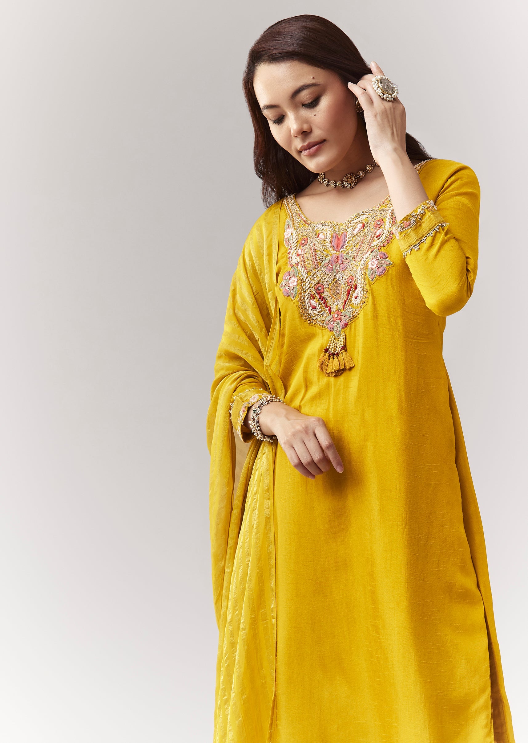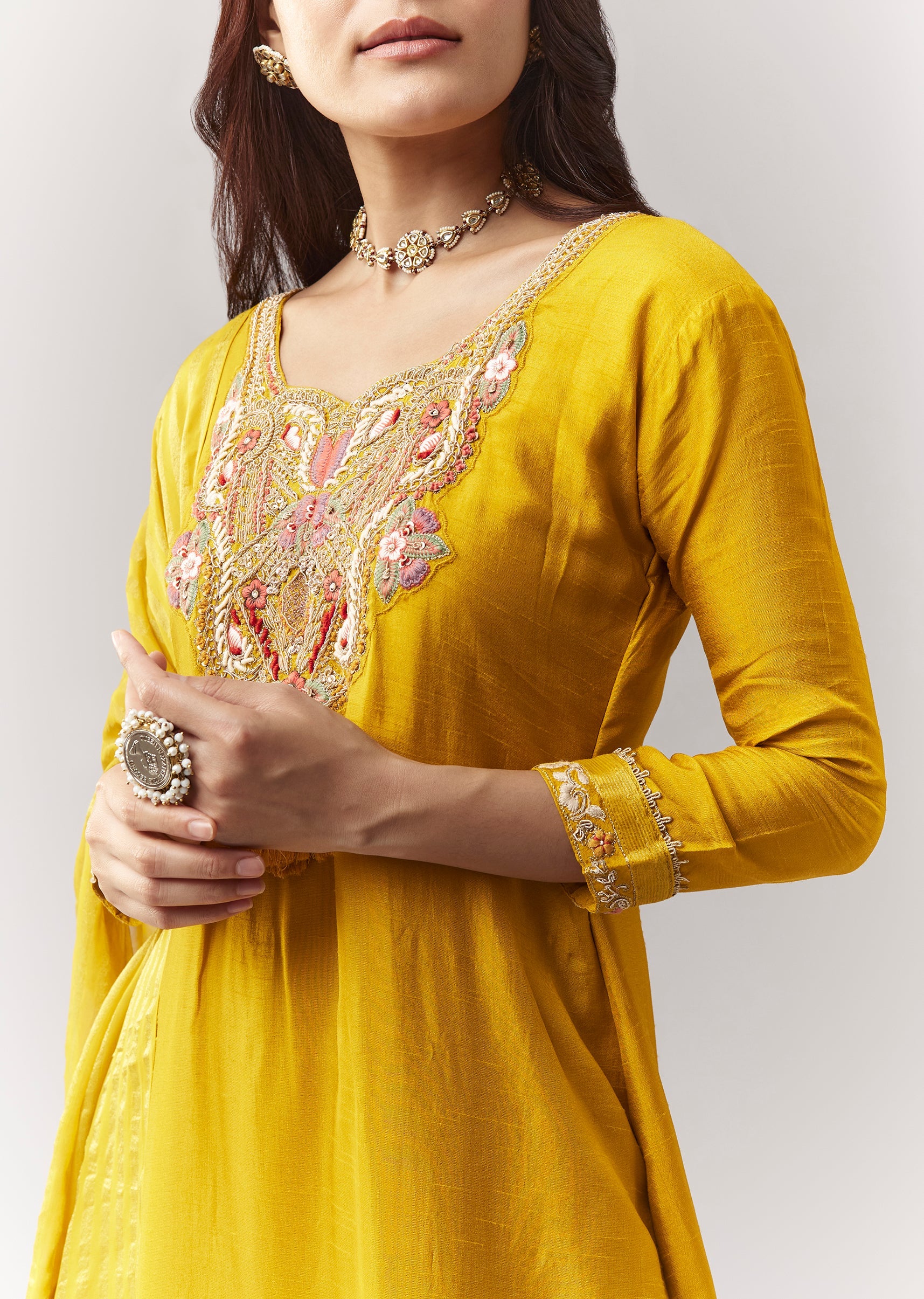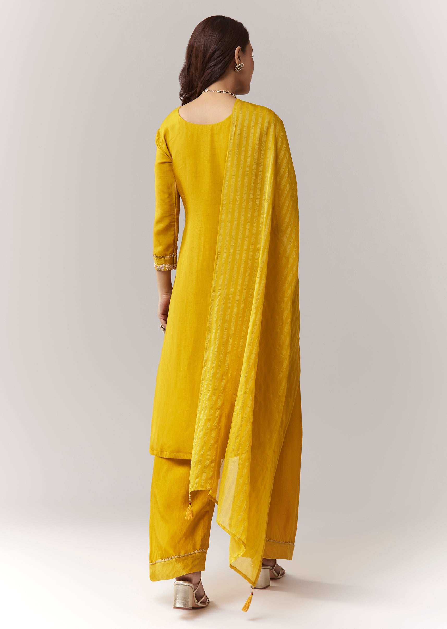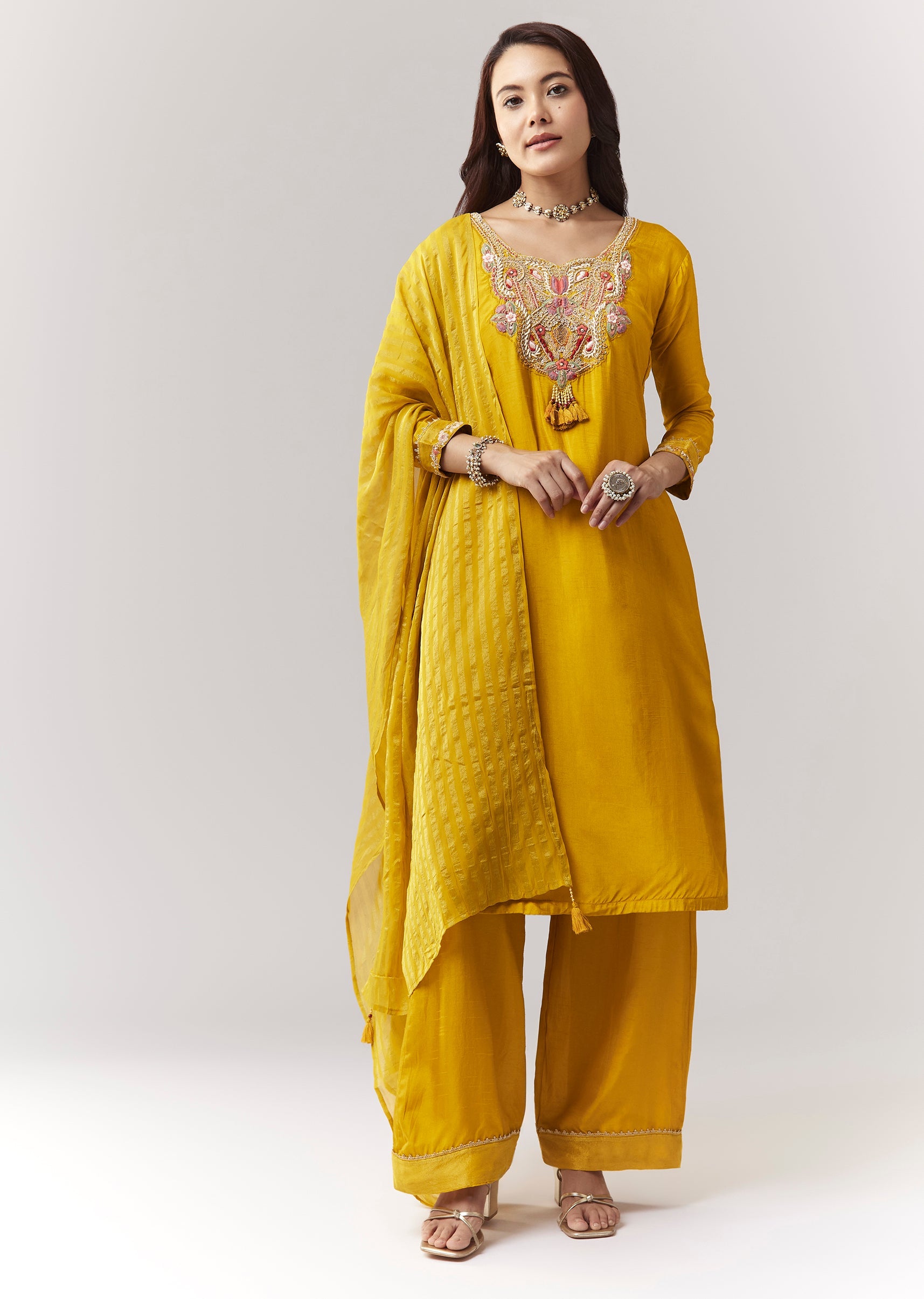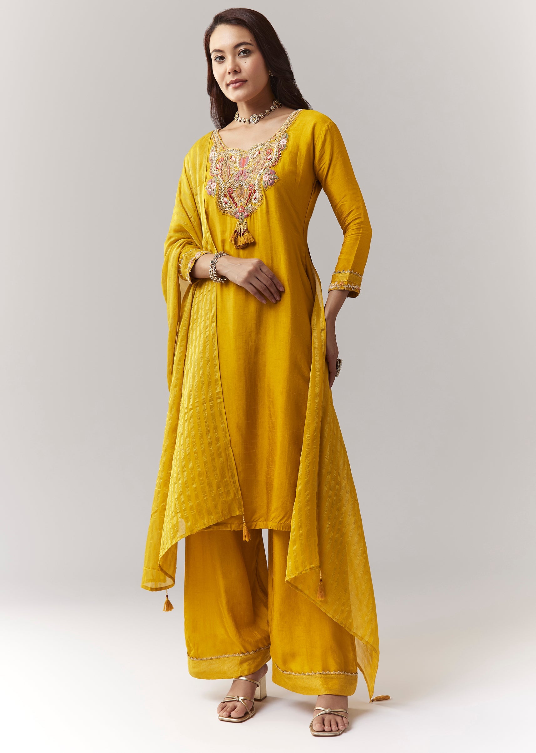 Yellow Zardosi Threadwork Kurta Palazzo Set With Dupatta