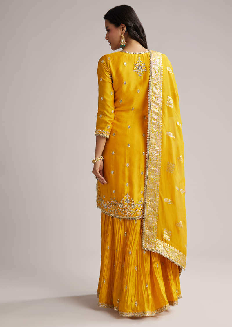 Cheerful and bright, this yellow palazzo suit is graced with zari work and crafted in organza satin. The notched neckline adds a touch of contemporary flair to this classic silhouette,... More Product Details