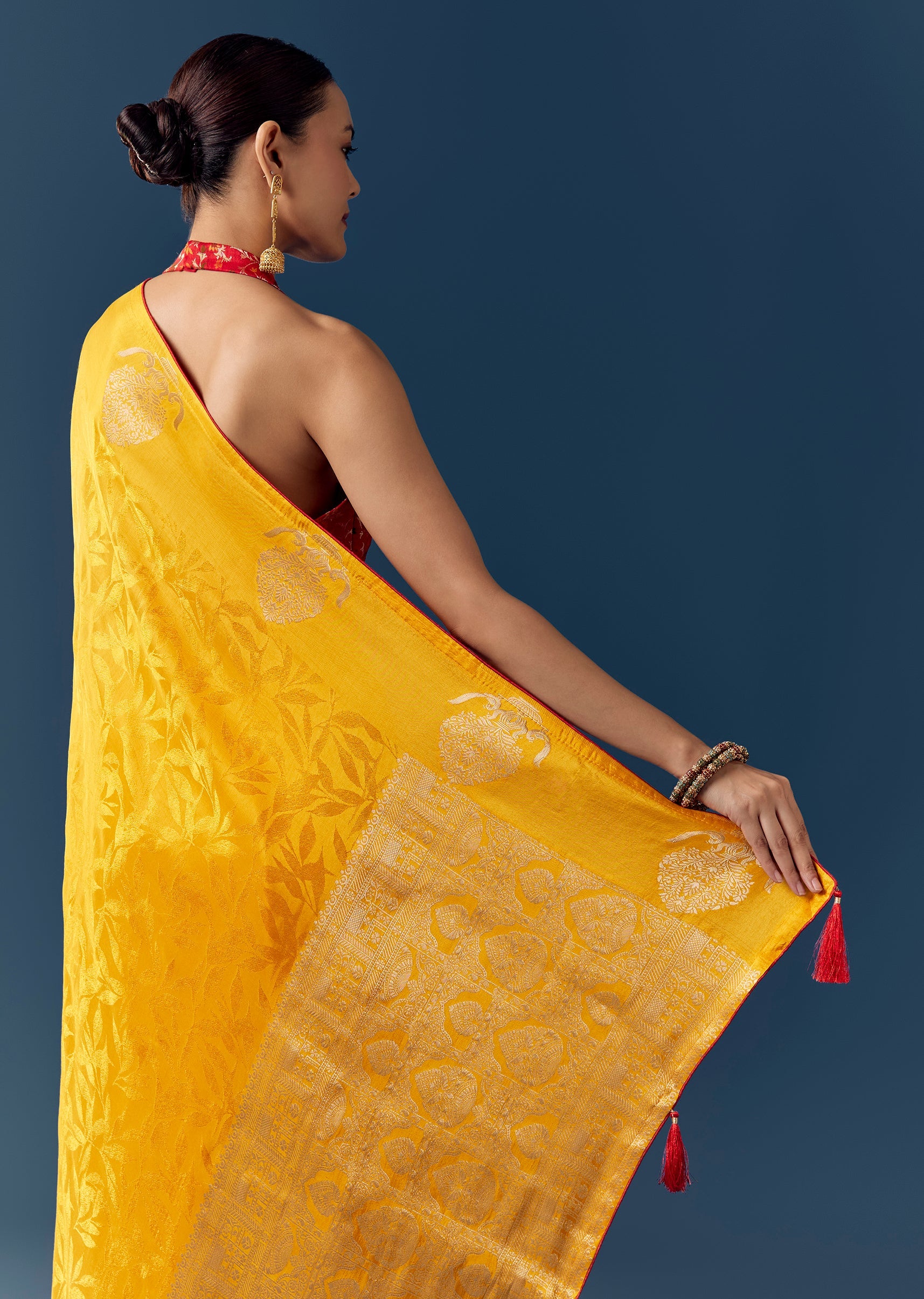 A bright yellow jacquard silk saree featuring rich brocade accents on the border and pallu, woven with zari for a festive glow—paired with a contrast brocade unstitched blouse fabric for a complete traditional look. Awarded as the Most Trusted Brand, we're delivering styles you love, just as promised.