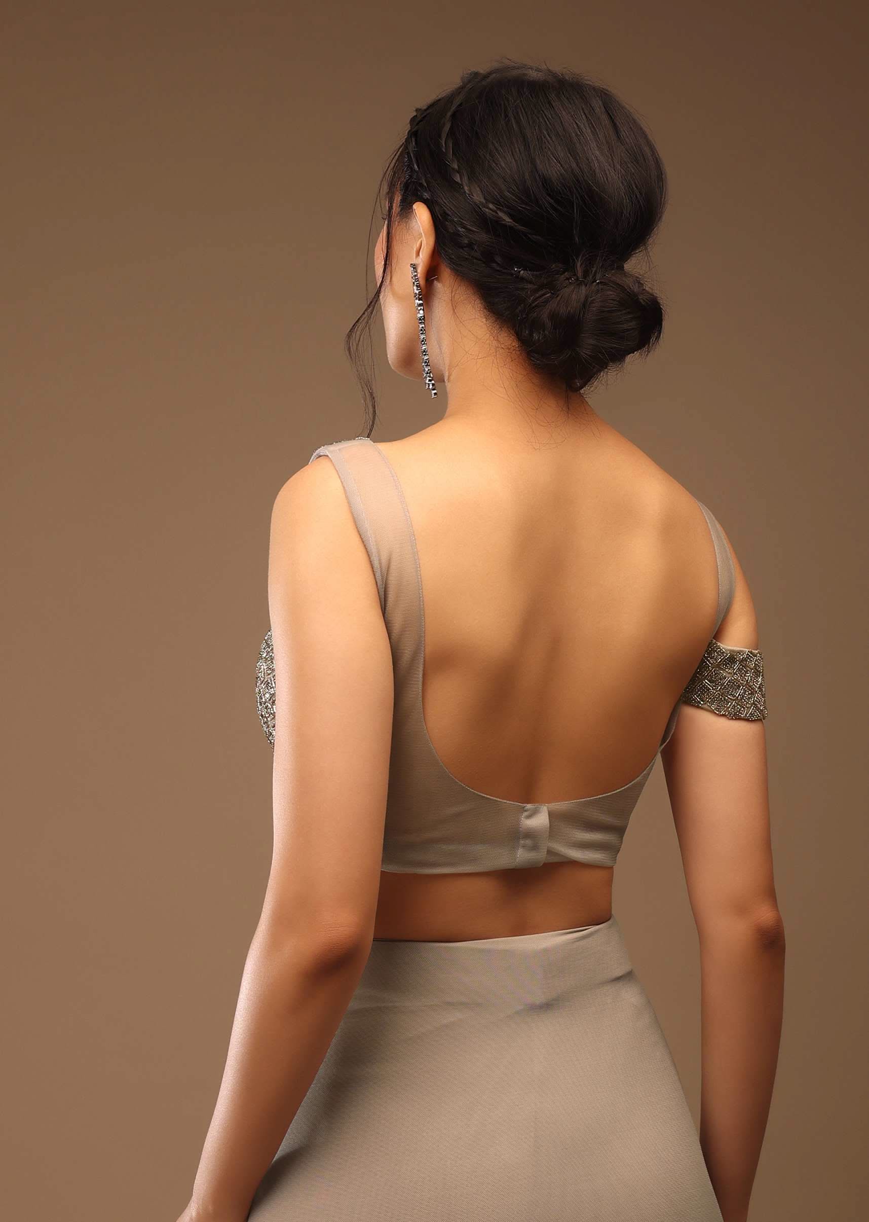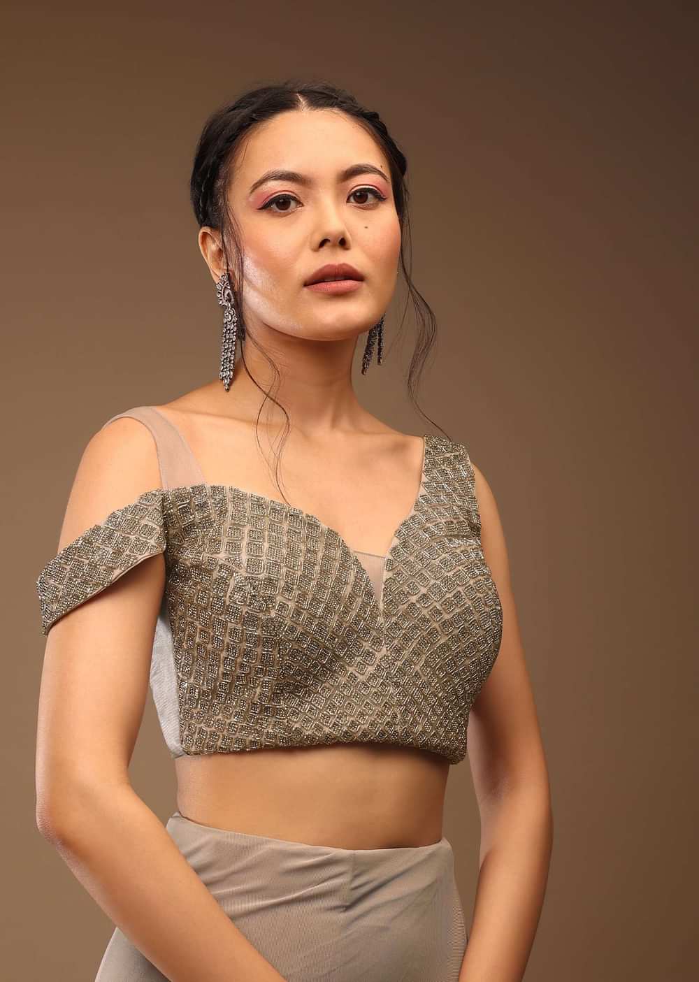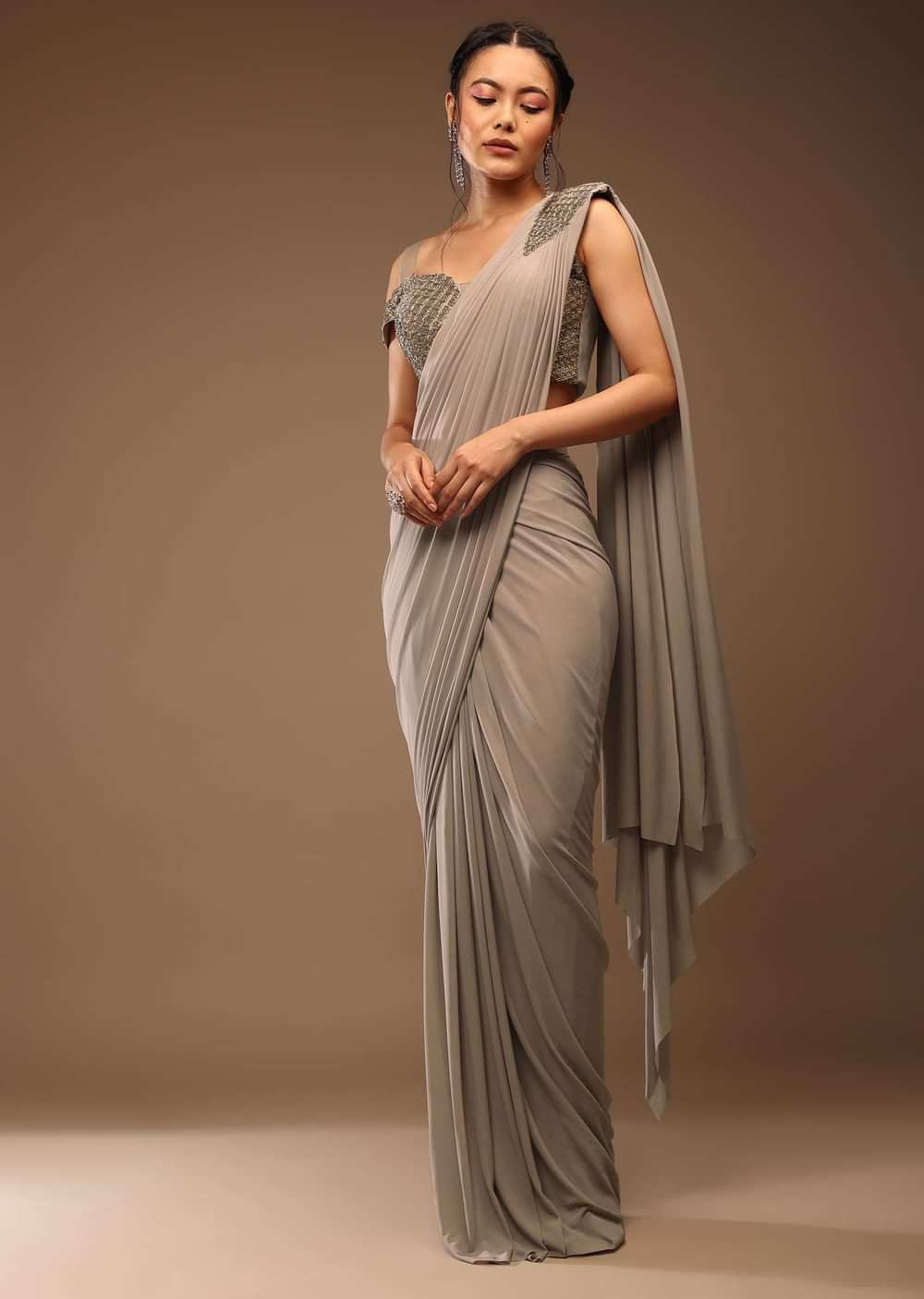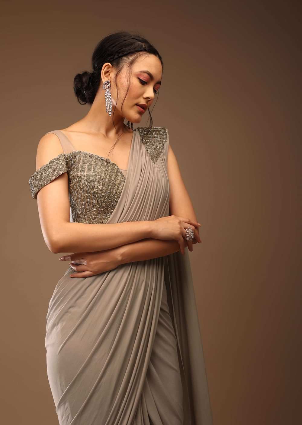 Zinc Grey Ready-Pleated Saree And A Cold Shoulder Top In Stones Embellishment