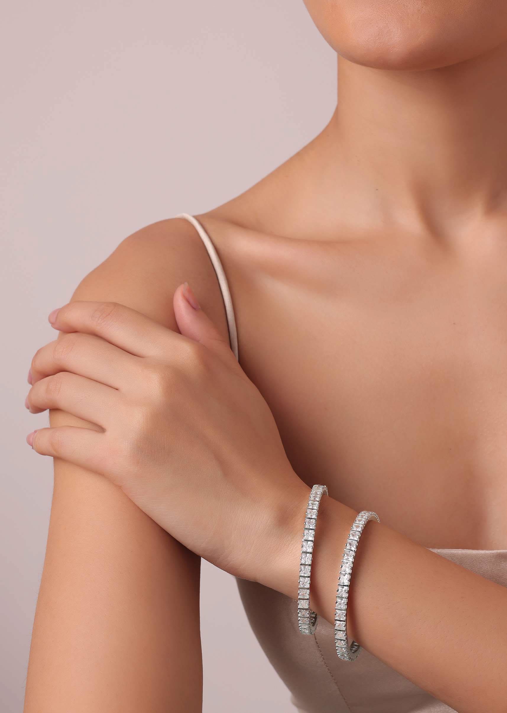 Exhibit sophistication with these refined pair of bangles. Crafted on a luxurious 92.5 sterling base the versatile and trendy design makes them ideal for grandeur weddings and celebrations. Adorned with zirconia stones this extravagant duo lends grace and charm. Keep away from moisture perfume alcohol and harsh chemicals.Spot clean only.Keep away from sharp objects. Awarded as the Most Trusted Brand, we're delivering styles you love, just as promised.