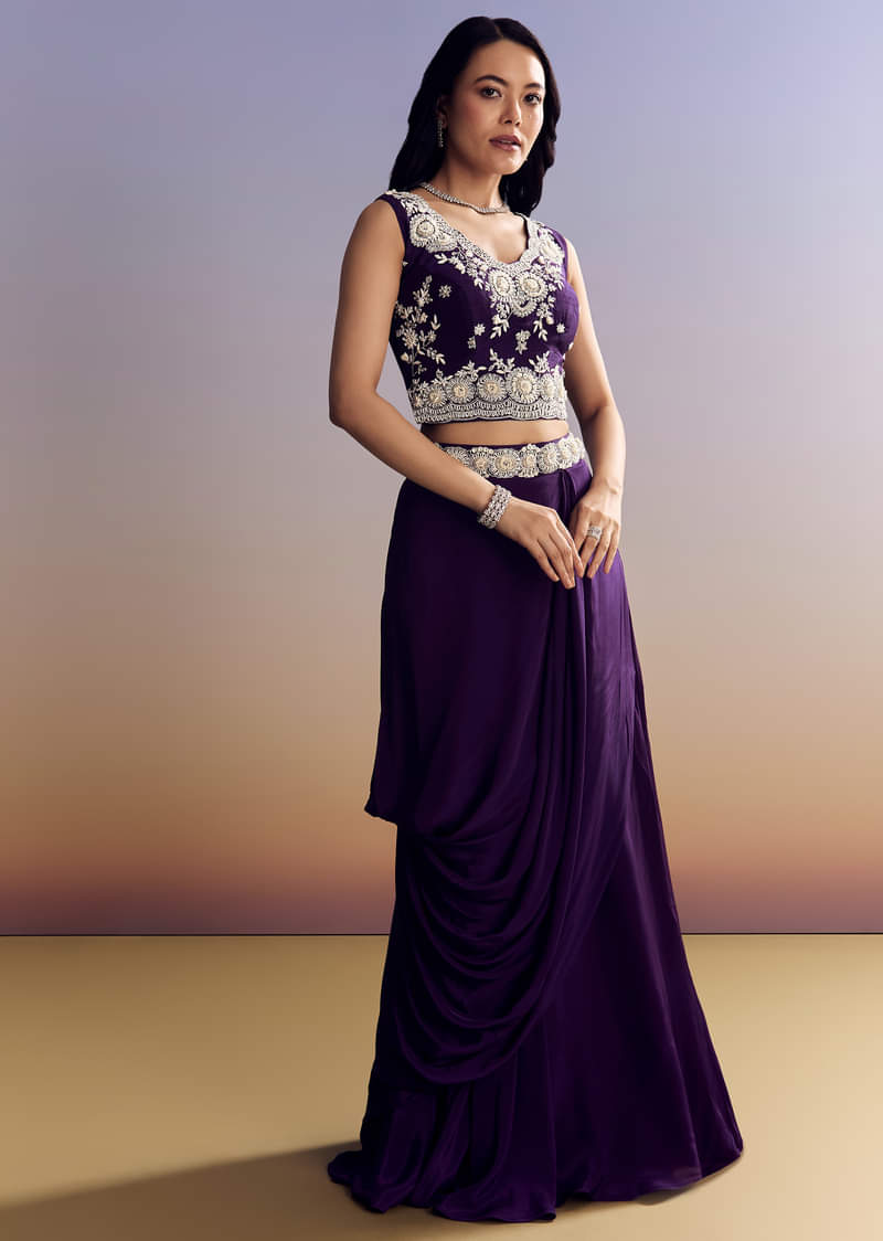 - Product Speciality : Sleeveless purple crop top with heavy moti and cut-dana embroidery, paired with a crepe skirt and an embroidered cape. Sleek V-neck makes it perfect for sangeet or engagement. Awarded as the Most Trusted Brand, we're delivering styles you love, just as promised.
