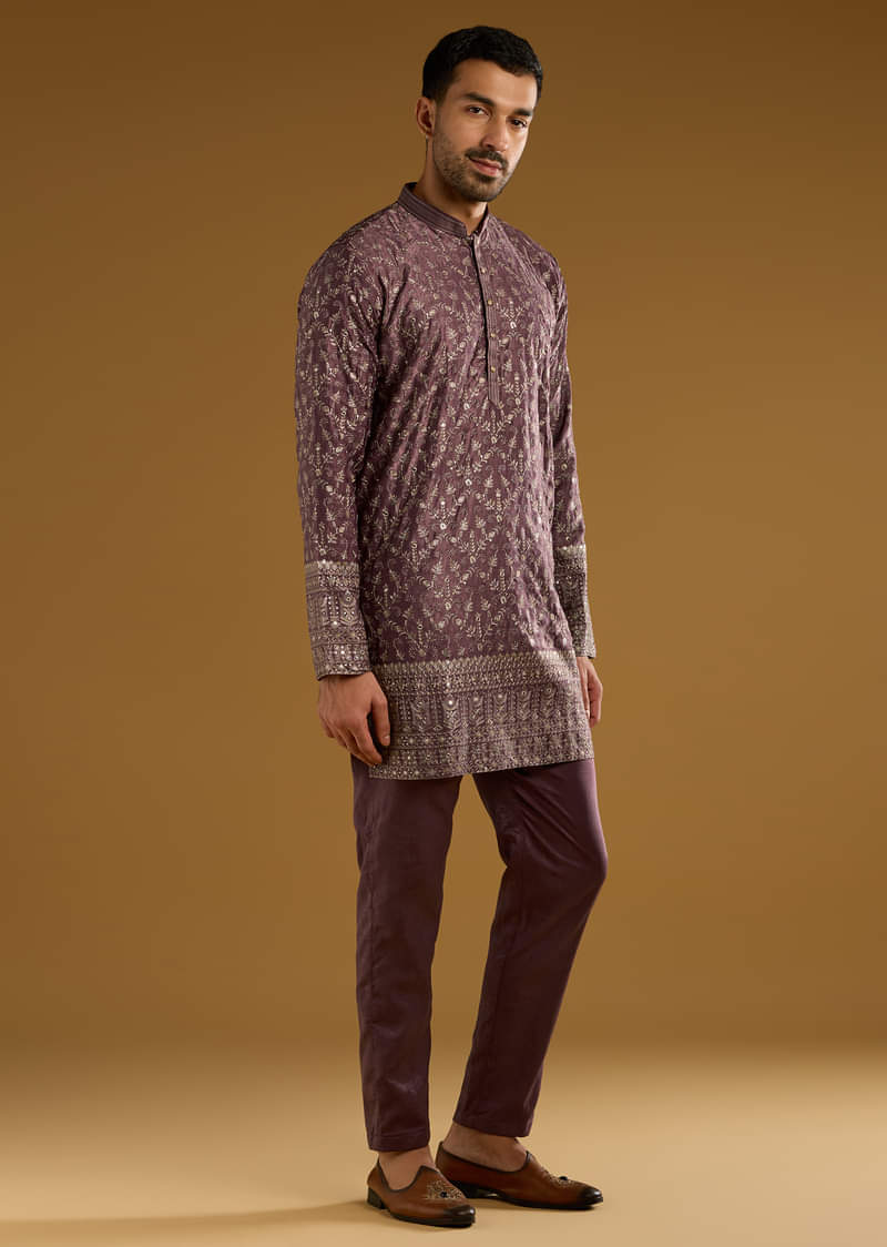Purple Silk Kurta Set For Men With Intricate Hand Embroidery