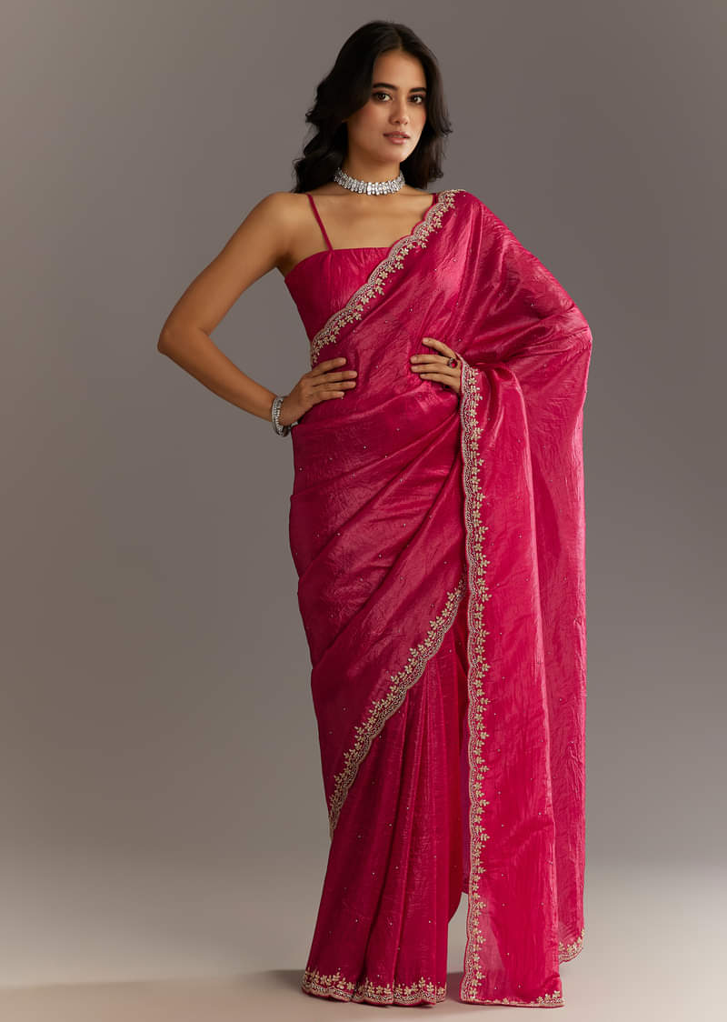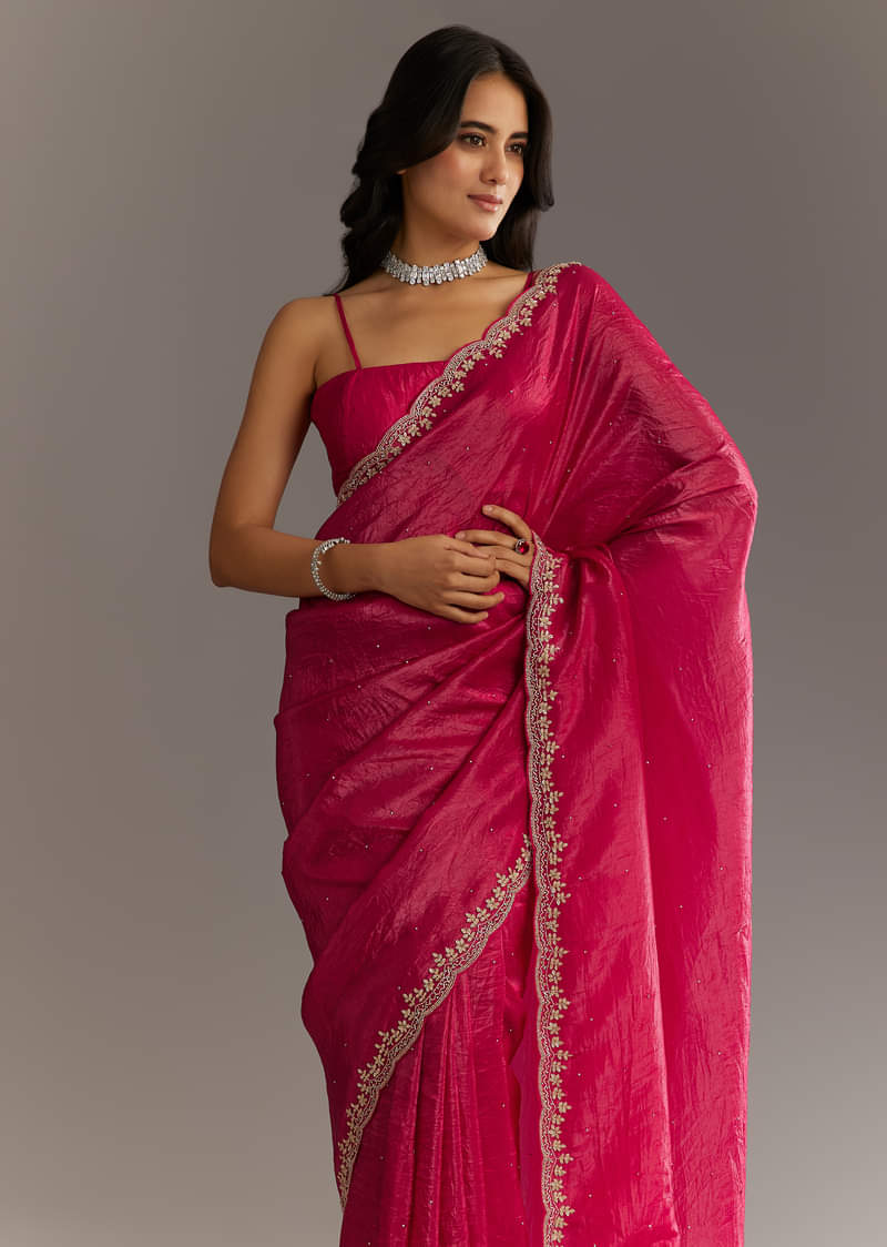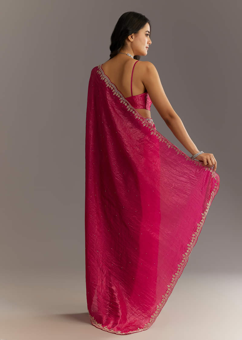 Rani Pink Crushed Tissue Saree With Stone Embellishments And Scallop Border