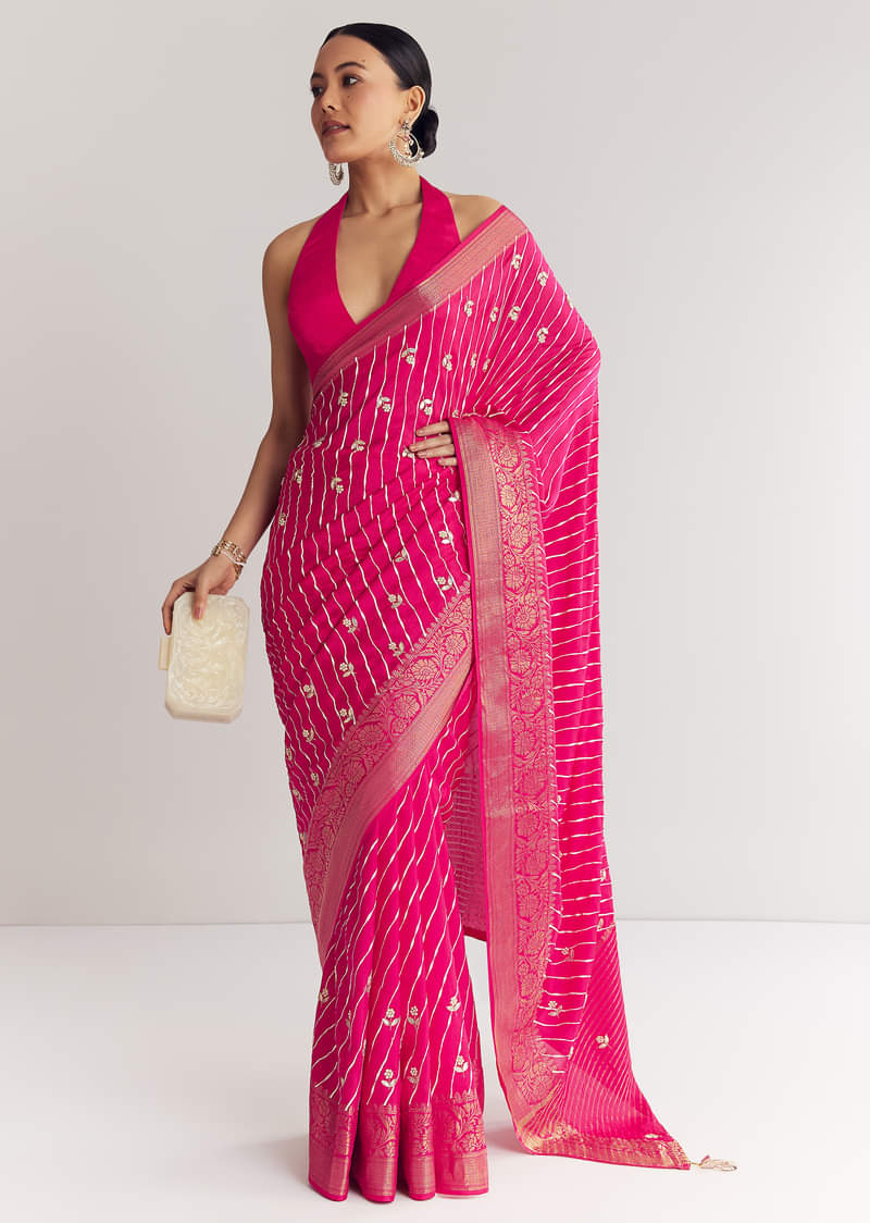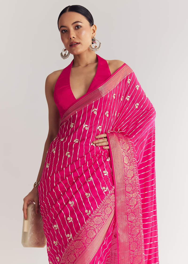 Rani Pink Leheriya Print With Floral Gotapatti And Moti Embroidery.