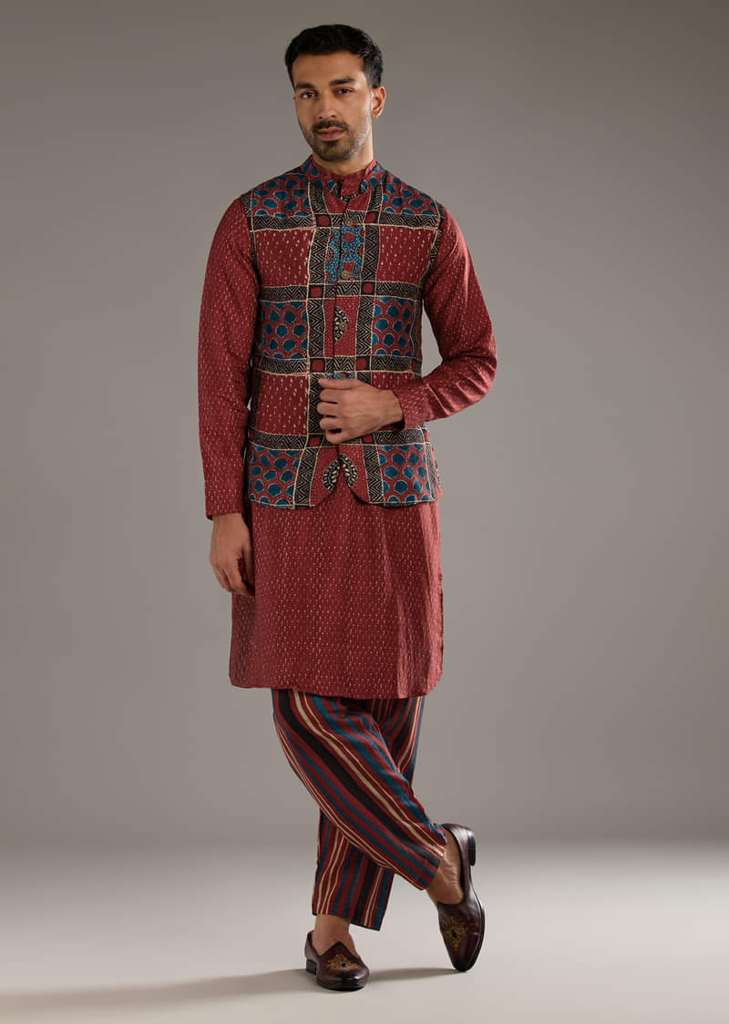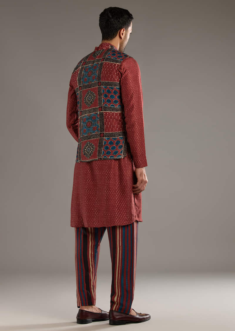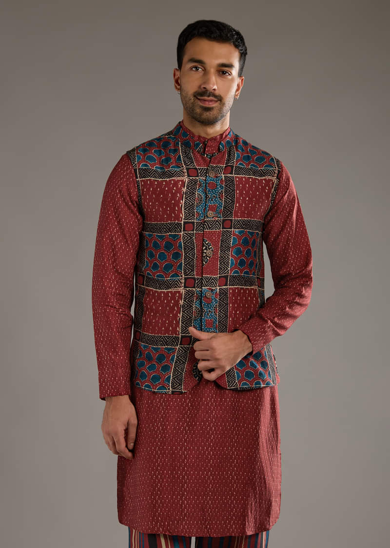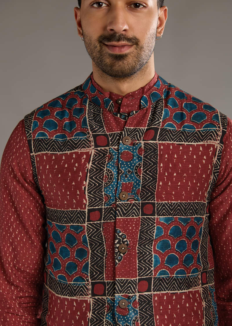Red Linen Kurta Jacket Set For Men With Hand Block Ajrakh Print