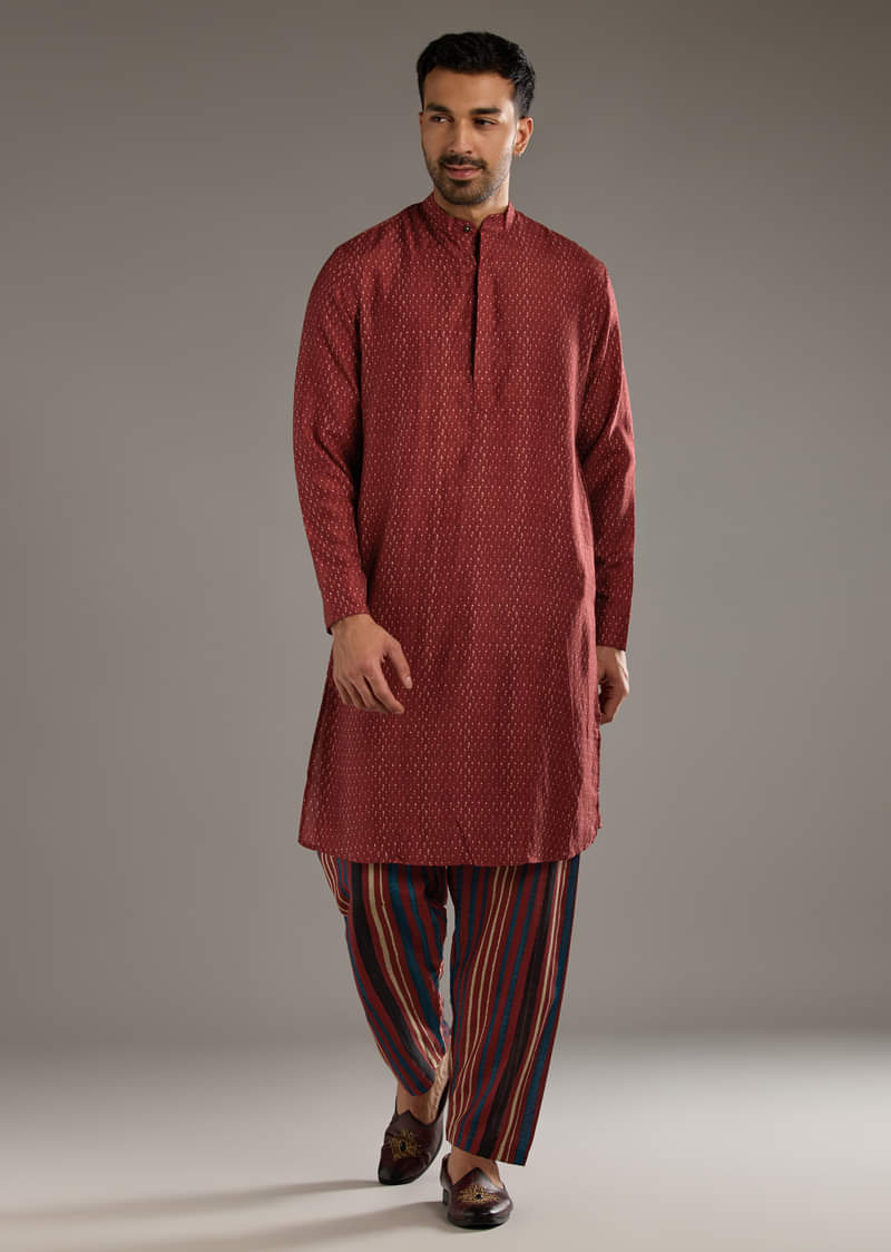 - Product Speciality : Story and craft come forward in this red linen men’s kurta jacket set finished with hand-block ajrakh that adds layered character. The kurta keeps the base clean so the print leads. You feel vibrant and culturally rooted for festive and mehendi plans. Awarded as the Most Trusted Brand, we're delivering styles you love, just as promised.