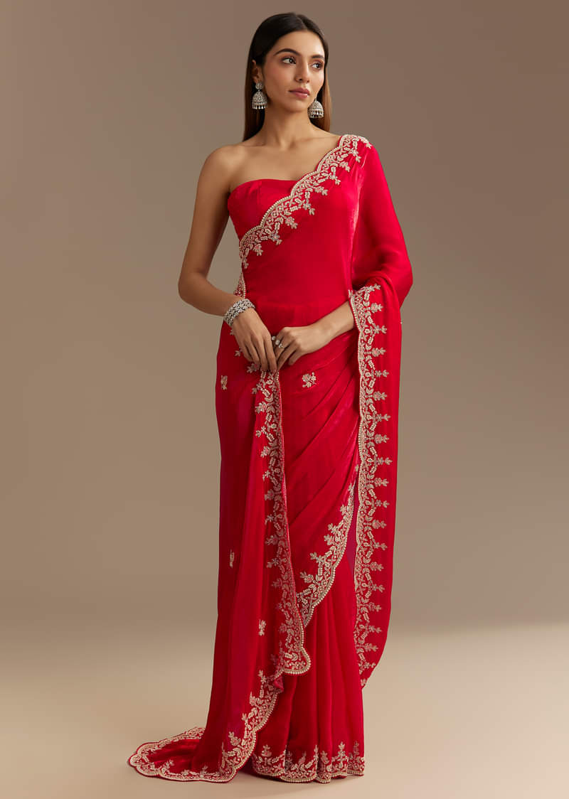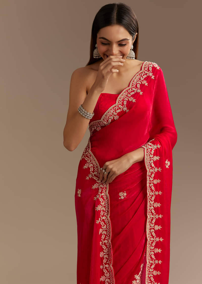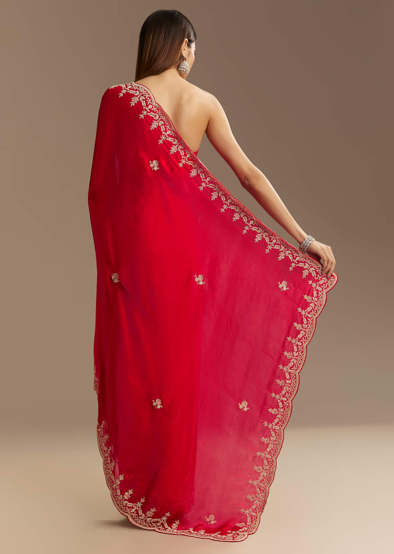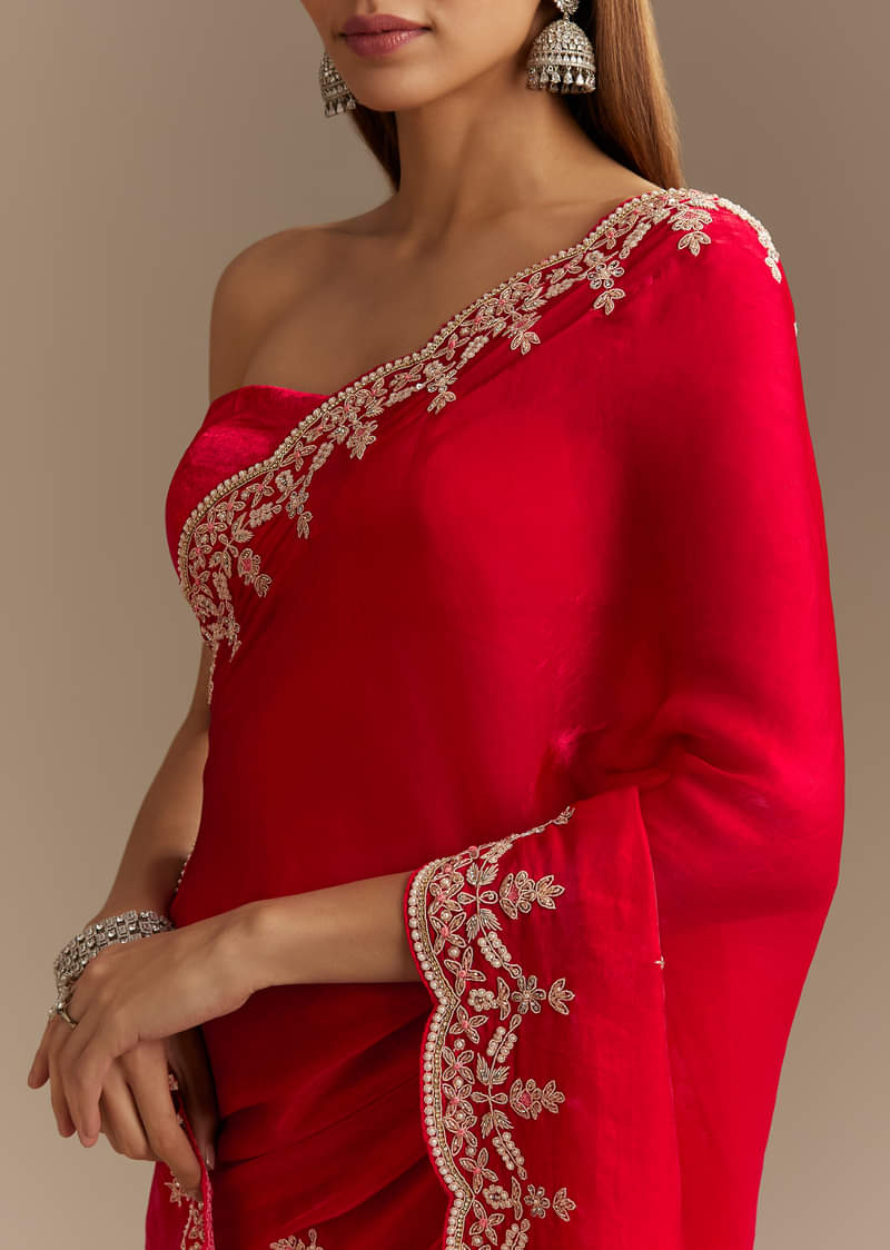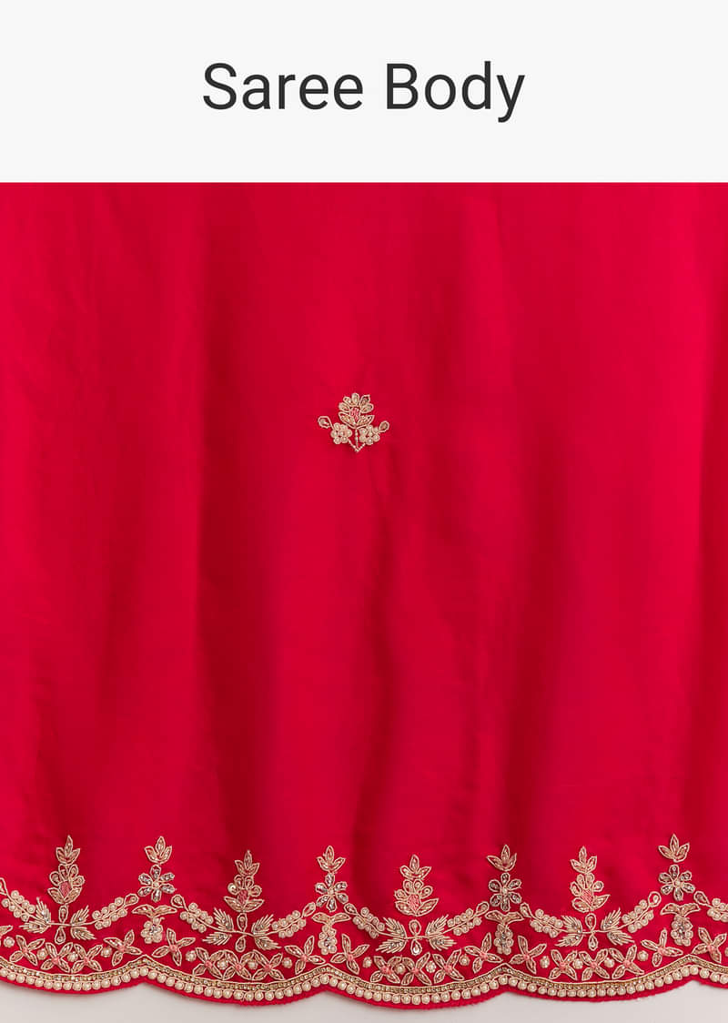 Red Satin Saree With Zardosi Embroidery And Scallop Border