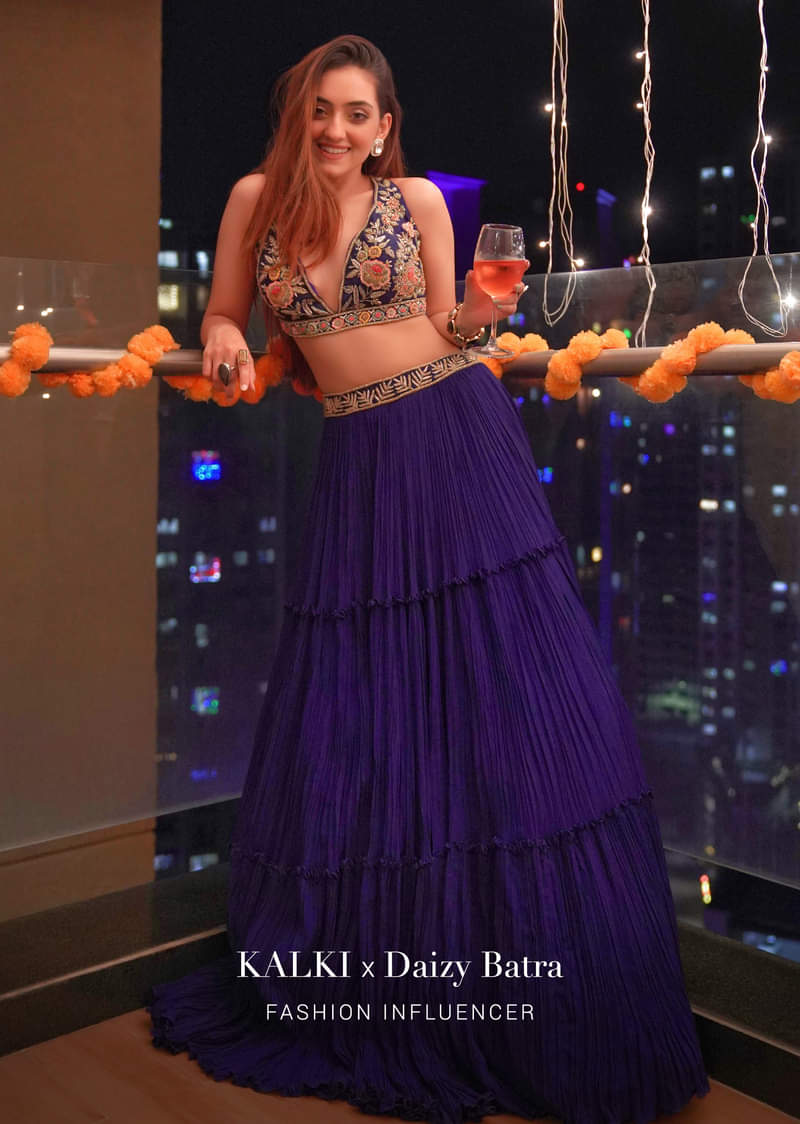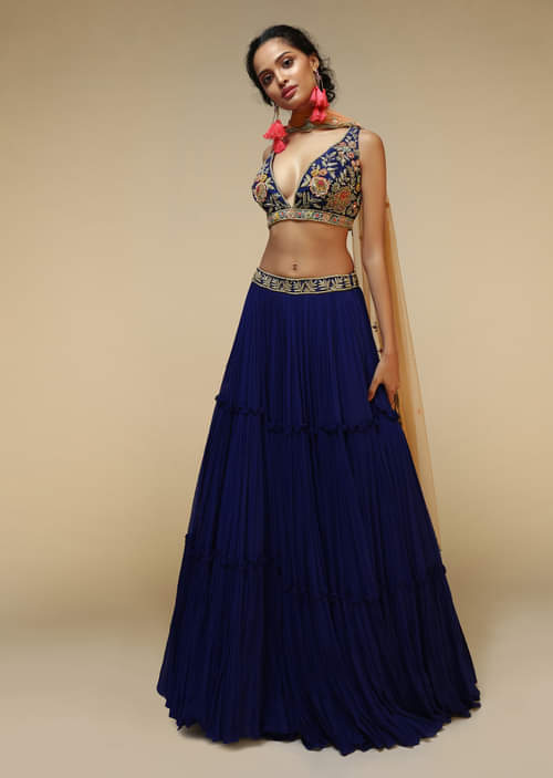 - Product Speciality : Royal blue lehenga in georgette with gathered flare and raw silk choli. The choli is hand embroidered with multi colored beads, resham, cut dana and zardosi in floral jaal design. It is crafted sleeveless with plunging neckline and side zip closure. Topped with a peach net dupatta with embroidered buttis and border. This piece comes with padding and cancan. . Awarded as the Most Trusted Brand, we're delivering styles you love, just as promised.