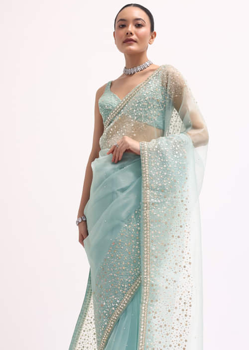 - Product Speciality : Elevate your presence with our stunning sky blue saree ideal for weddings and festive celebrations. Crafted from tissue silk fabric this saree is intricately embellished with stone and sequin work throughout. Complete with an unstitched blouse it's the epitome of elegance and grace. Awarded as the Most Trusted Brand, we're delivering styles you love, just as promised.