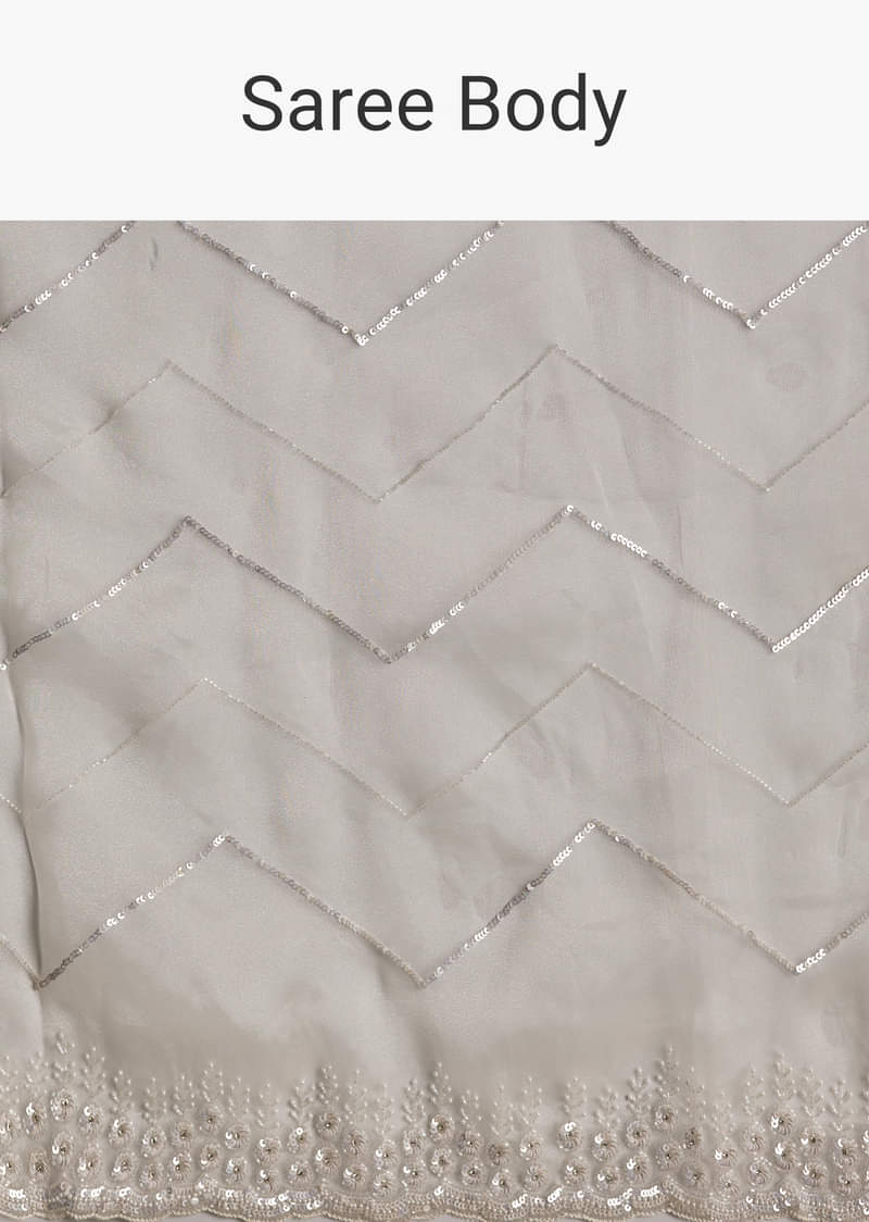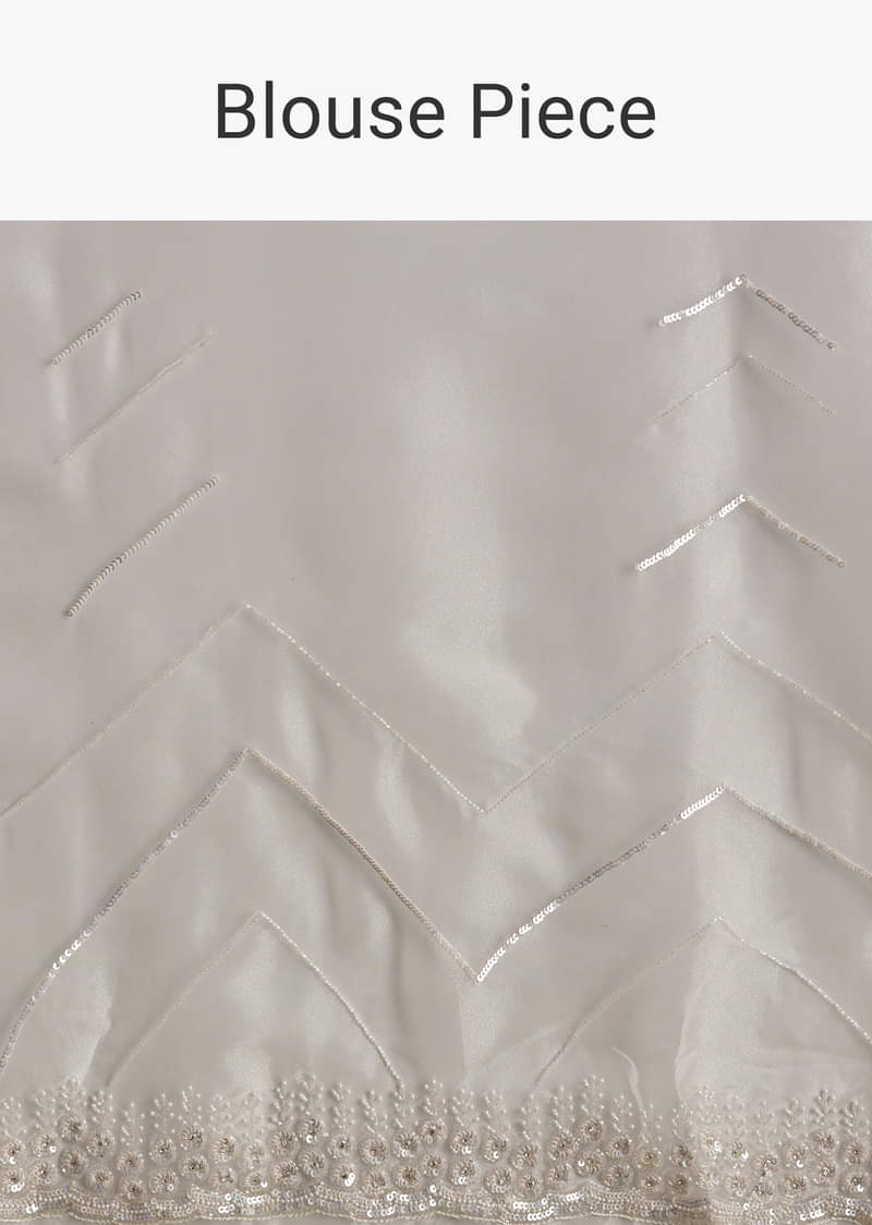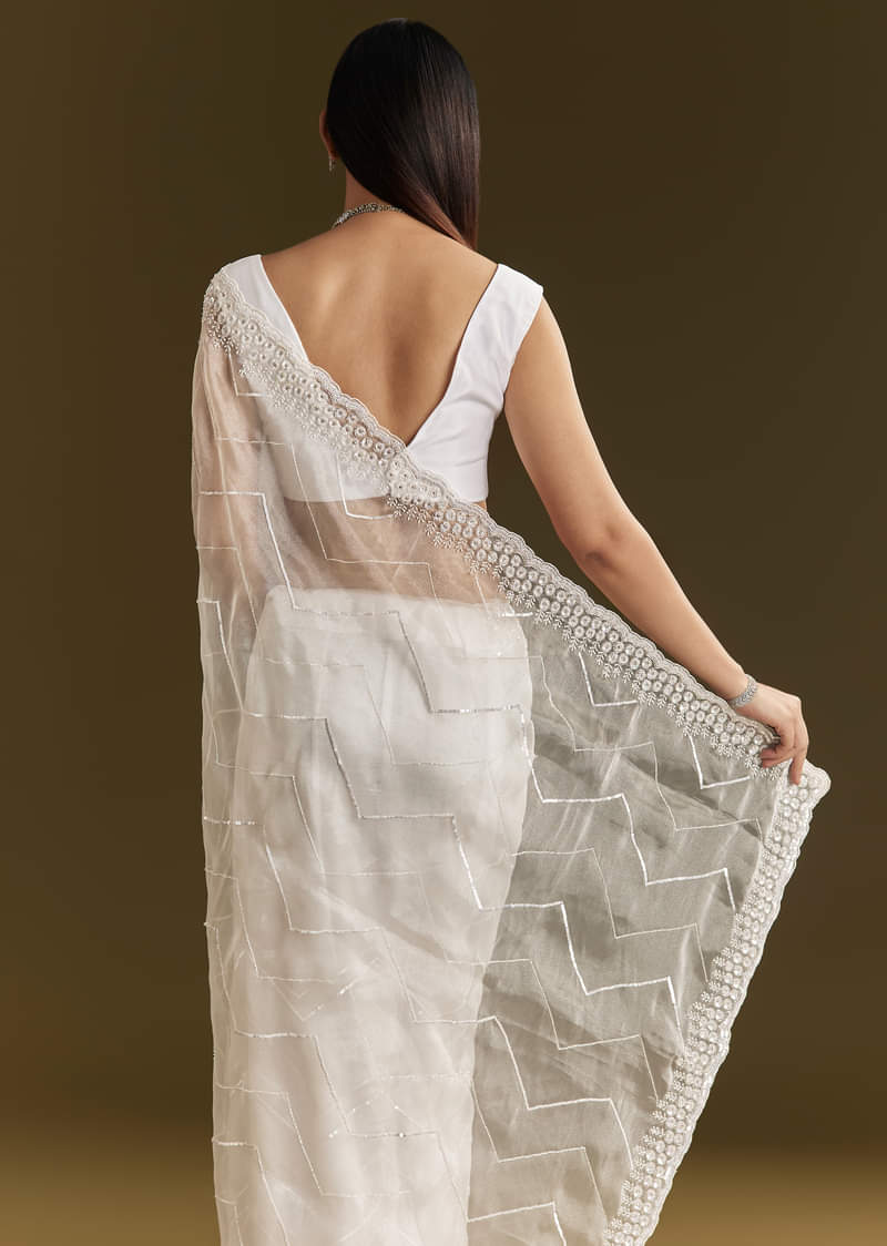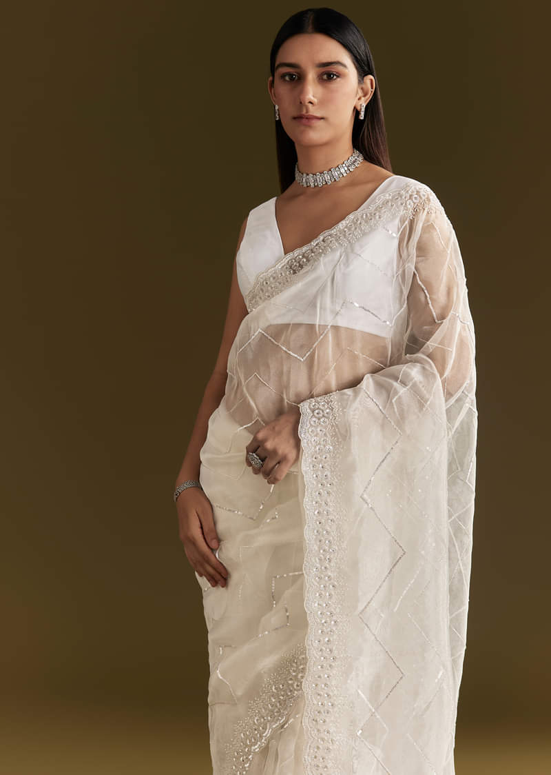 White Glass Tissue Saree With Sequins Embroidery And Scallop Border