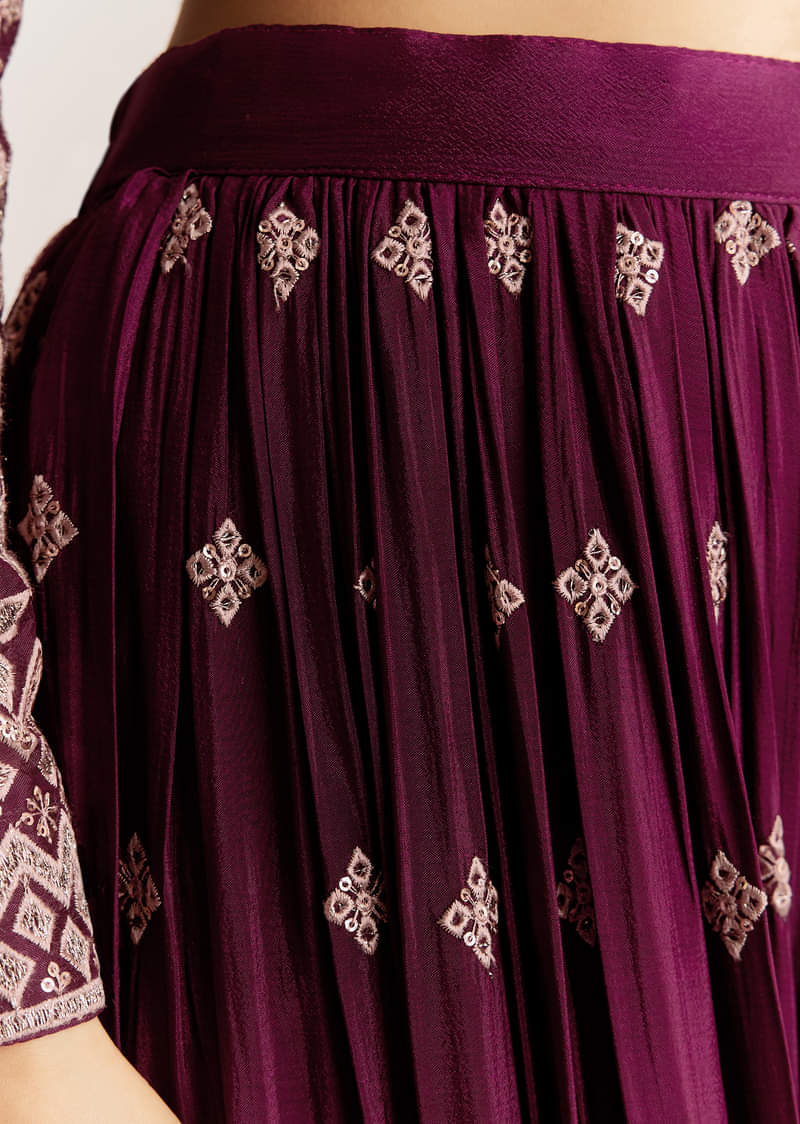 - Product Speciality : This wine georgette kurta set features a front slit silhouette with zari and resham embroidery. Comes with sequinned butti palazzo and matching chinon dupatta. Awarded as the Most Trusted Brand, we're delivering styles you love, just as promised.