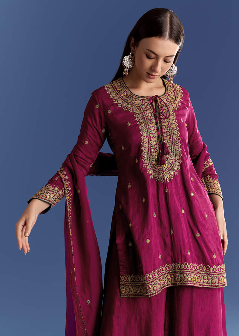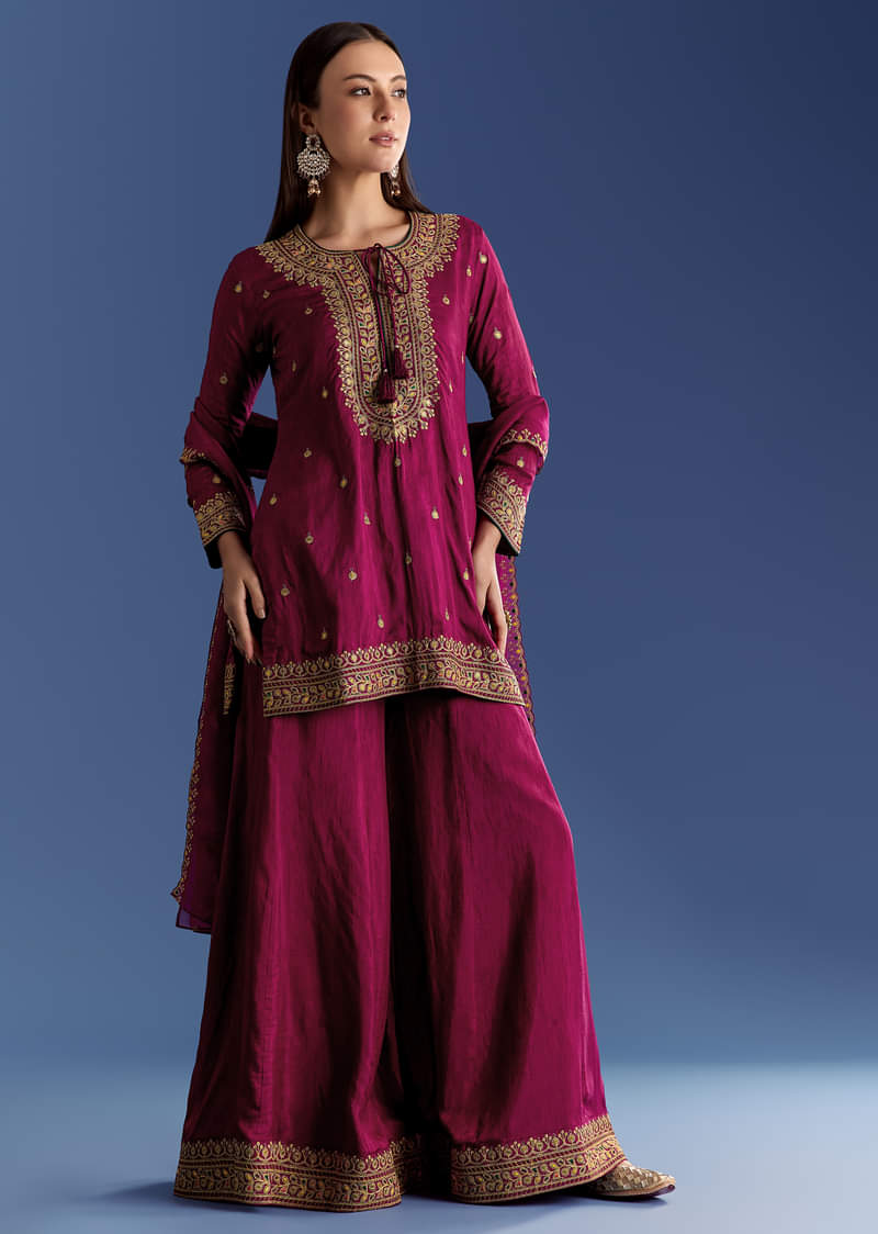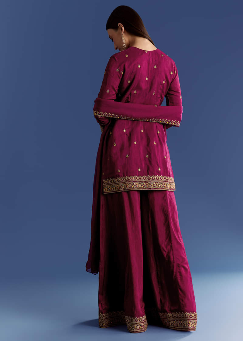 Wine Silk Kurta Set With Zari Palazzo And Butti Dupatta