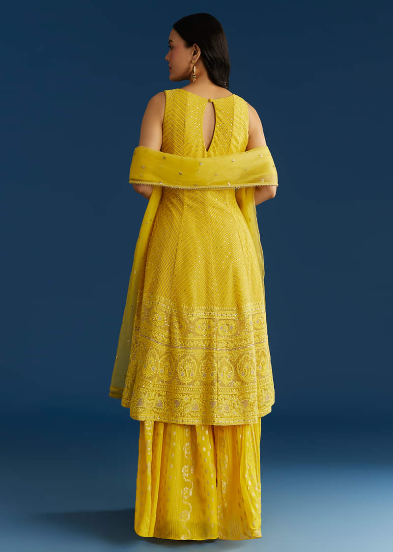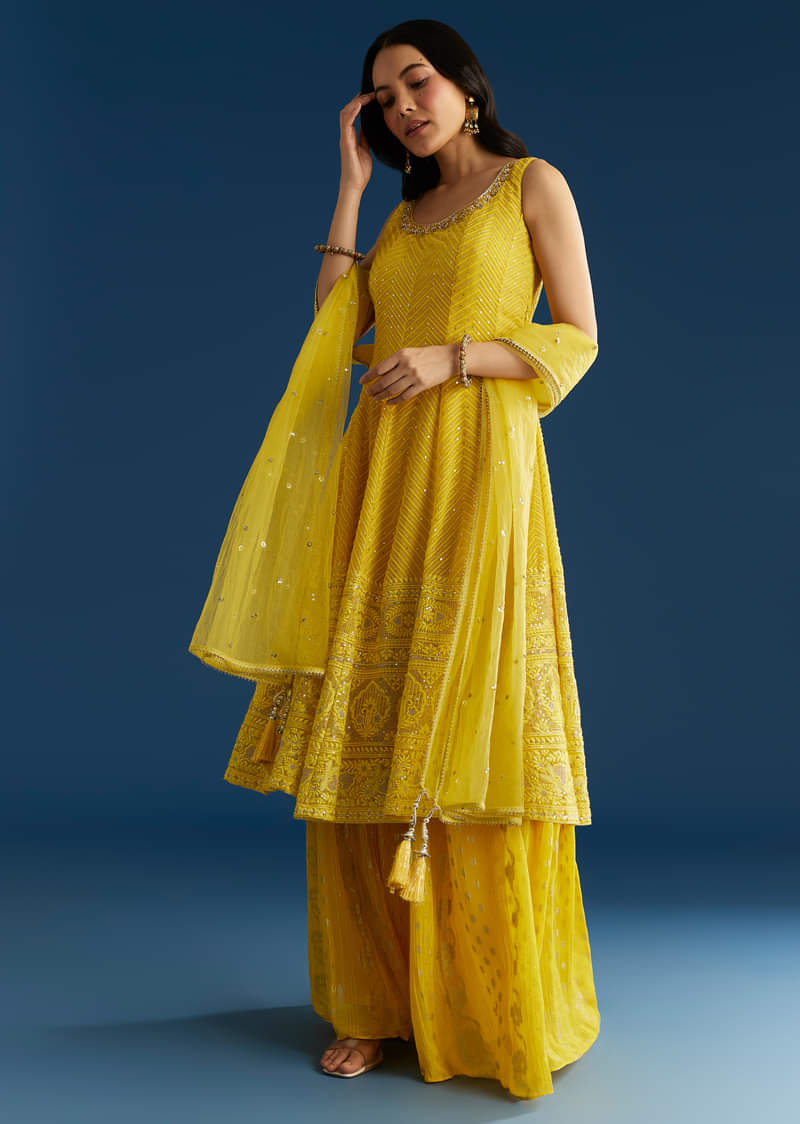 - Product Speciality : The silhouette flatters while the detailing enhances traditional charm. This yellow A-line kurta is detailed with thread and sequins work and comes with a net dupatta featuring sequins butti—ideal for haldi glow moments.Standard length for Palazzo is 44 Inches. Dupatta butti work may vary. Awarded as the Most Trusted Brand, we're delivering styles you love, just as promised.